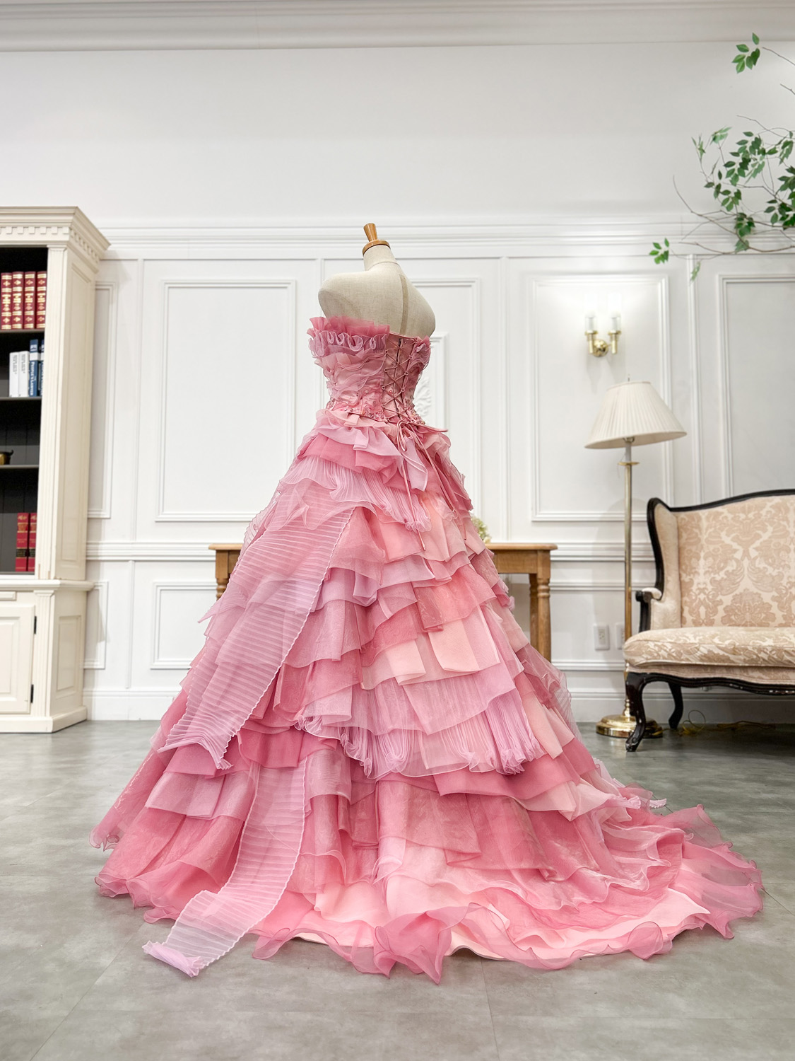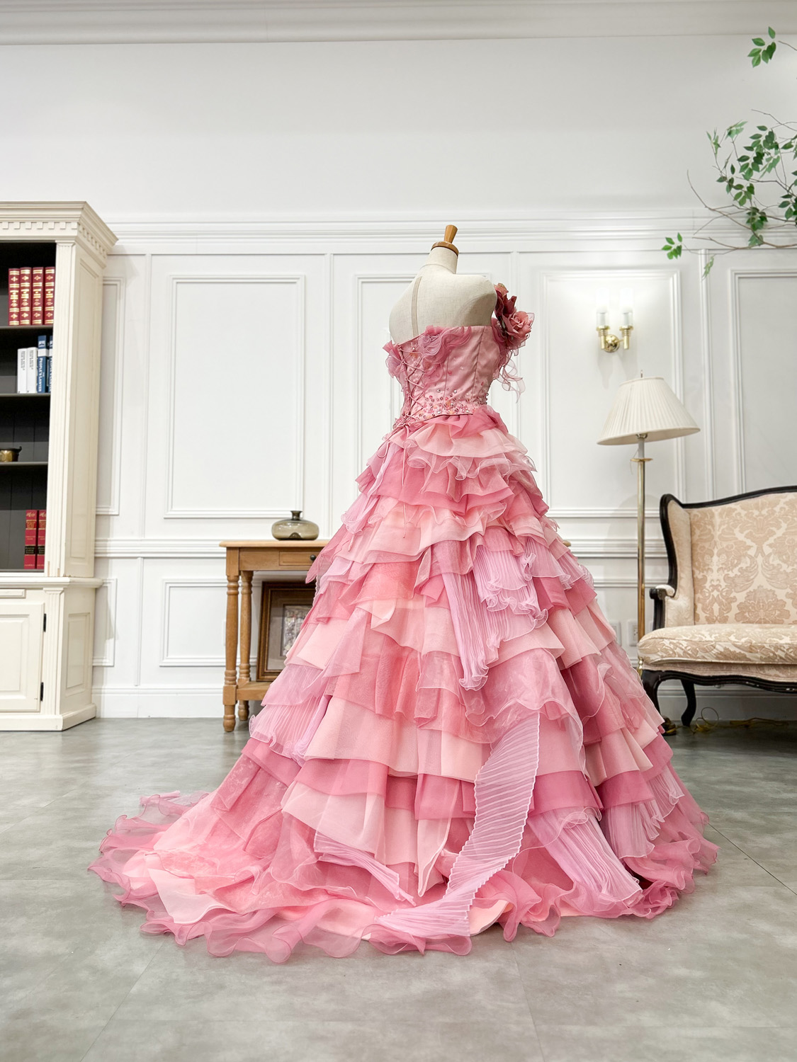 バックスタイルも裾までふんわり広がるシルエットで、広い空間でも美しく映えます。