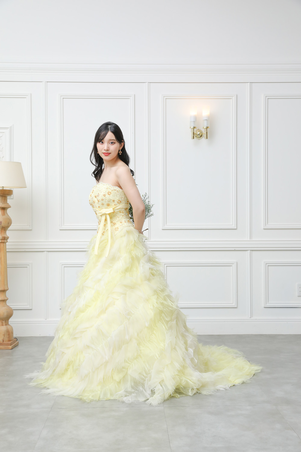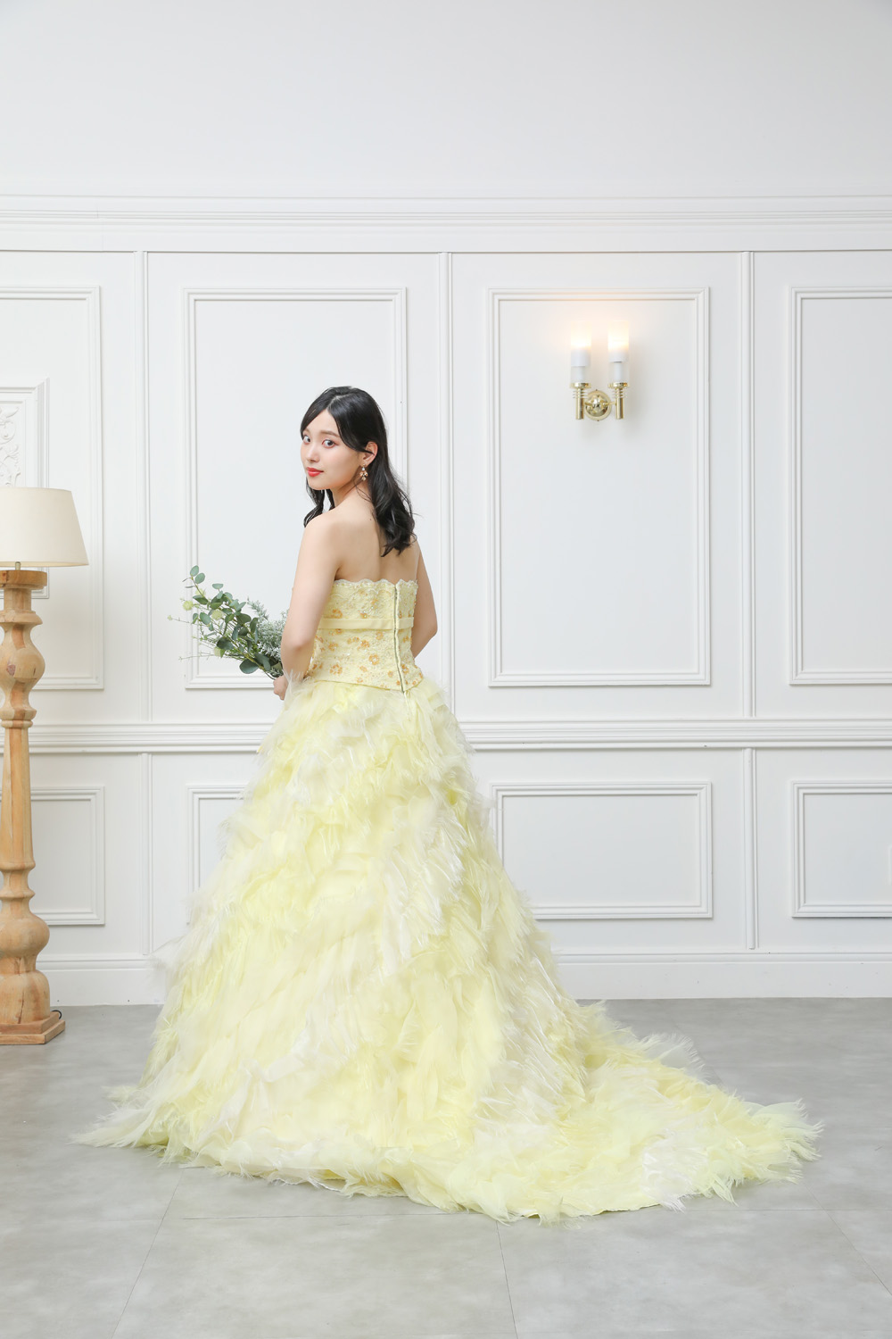 淡くやさしいレモンイエローのカラーが、透明感と幸せ感をまとうカラードレス。