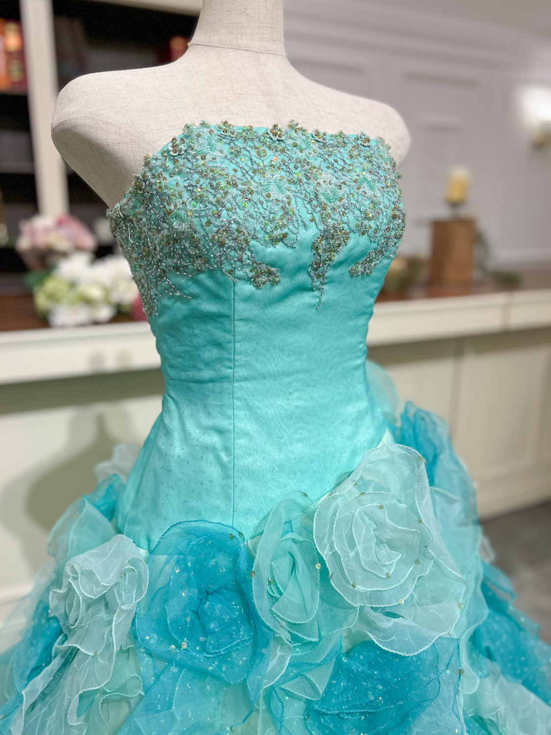 スカートには瑞々しい花々を思わせる立体的なフリルが贅沢に重ねられ、ふんわりとした広がりが可憐なシルエットを描きます。