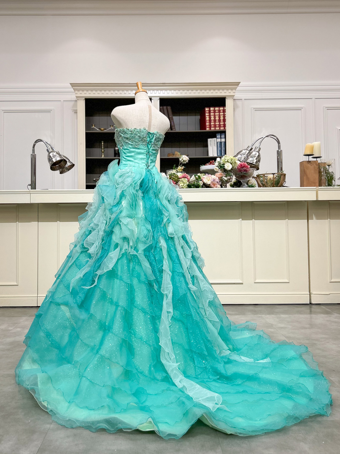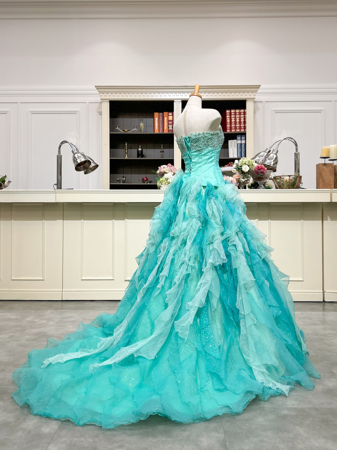 澄み渡る水面のような、ライトアクアブルーが印象的なカラードレス。