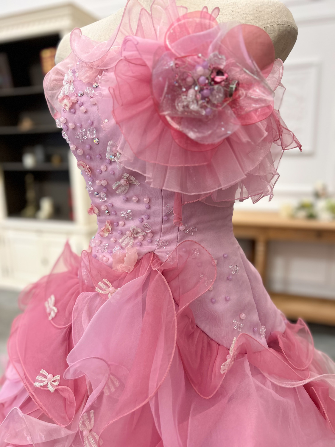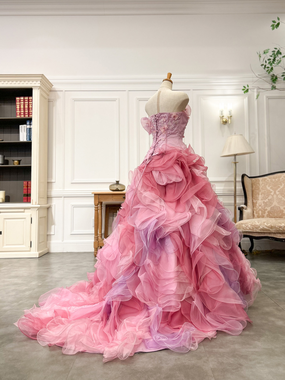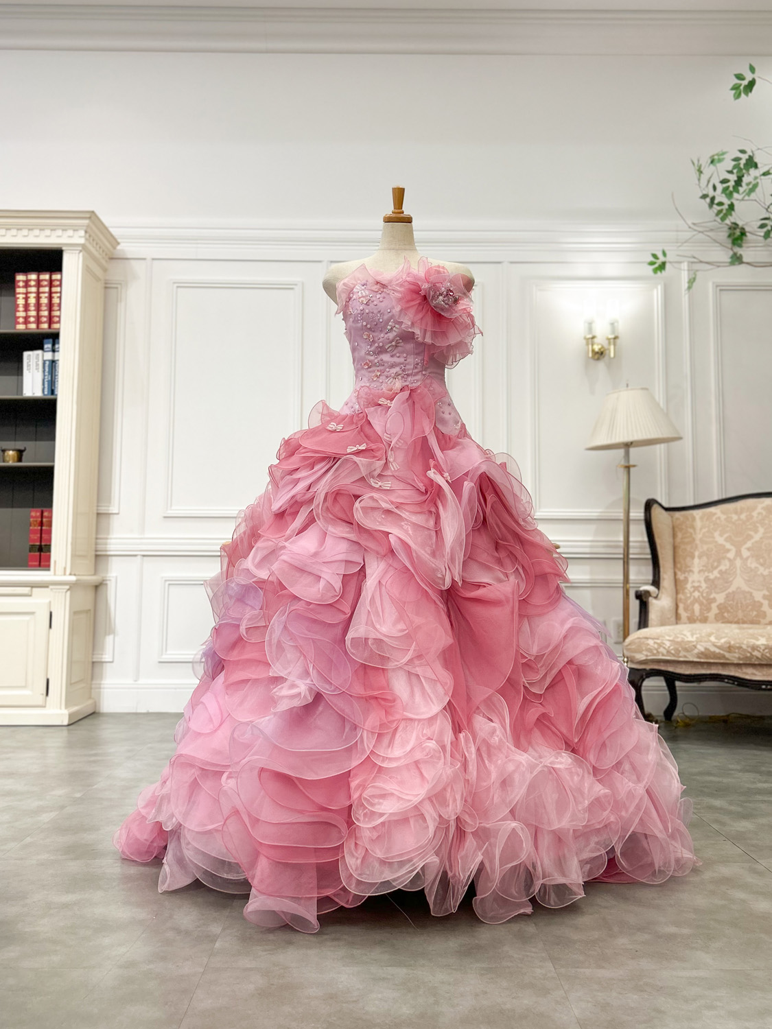 ふんわりとしたグラデーションとボリューム感のある立体フリルが印象的で、夢見るような世界観を叶える1着です。