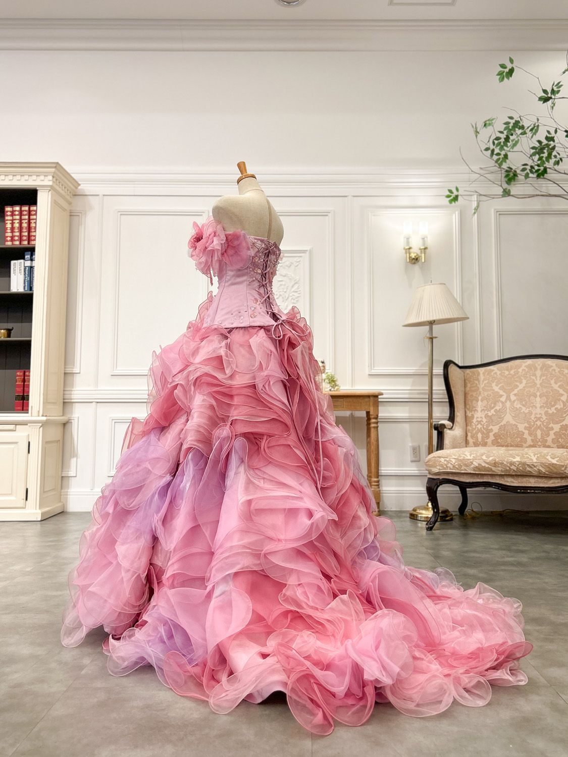 ピンクとラベンダーがやわらかに溶け合う、可憐で華やかなカラードレス。