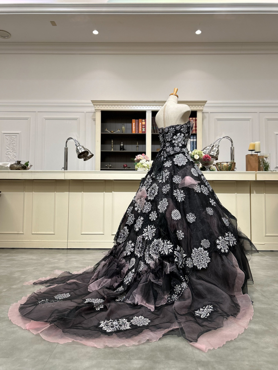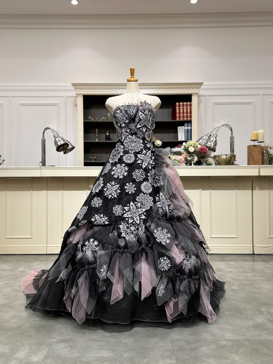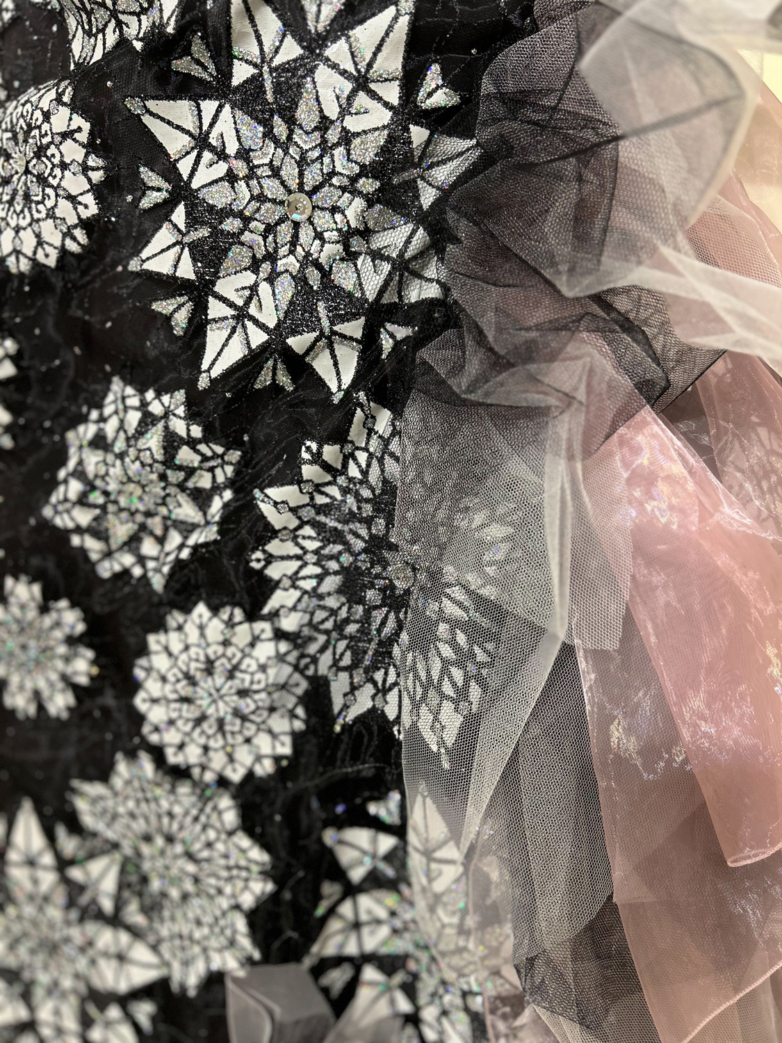 黒のチュールに浮かび上がるのは、まるで雪の結晶のように繊細なモチーフ。