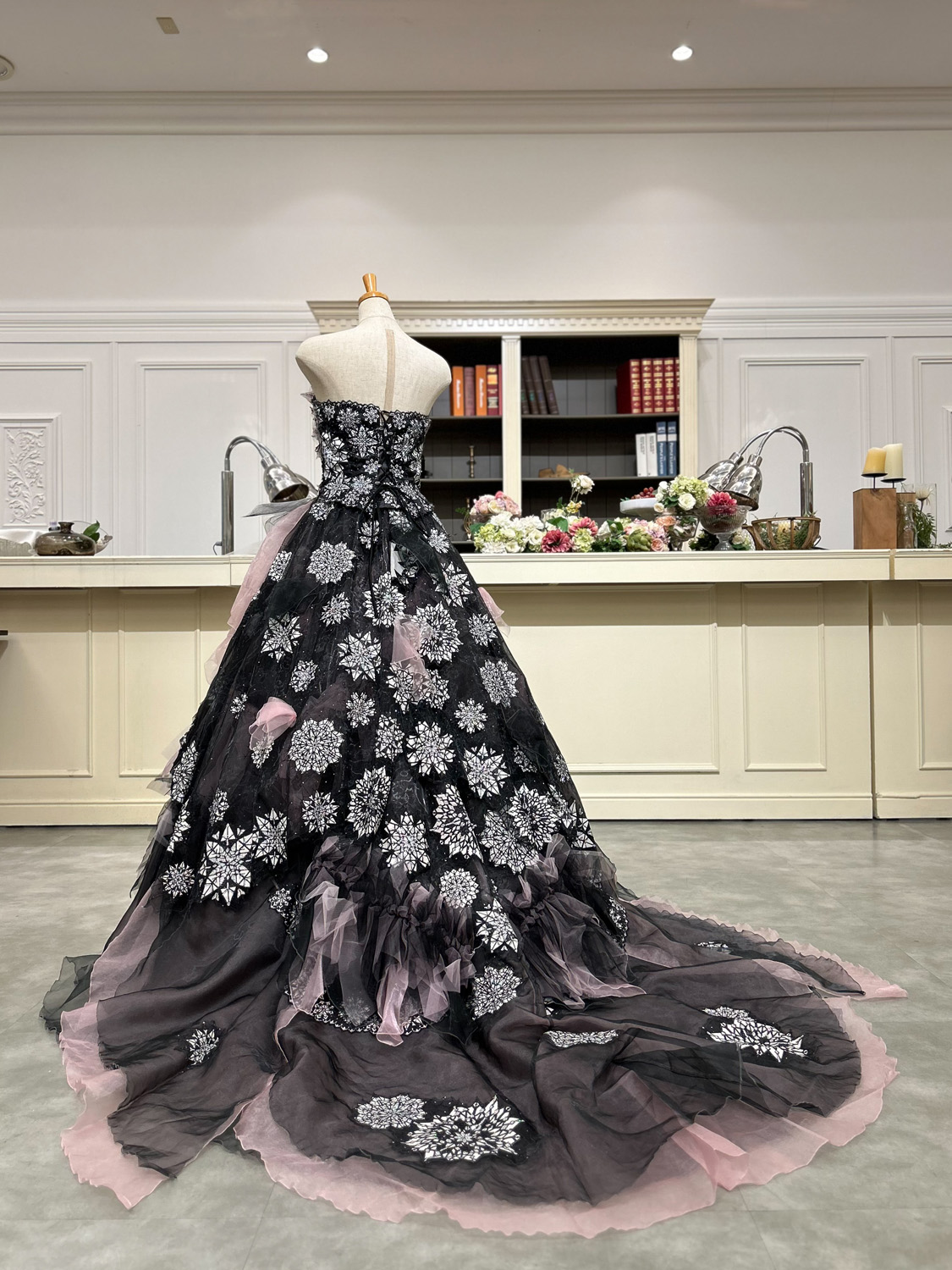 モノトーンの刺繍と淡いピンクチュールが重なり合い、落ち着きのある気品と美しさを放つドレスです。