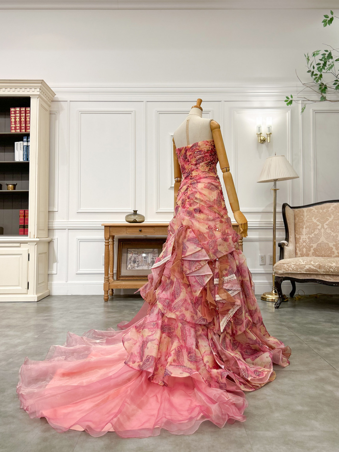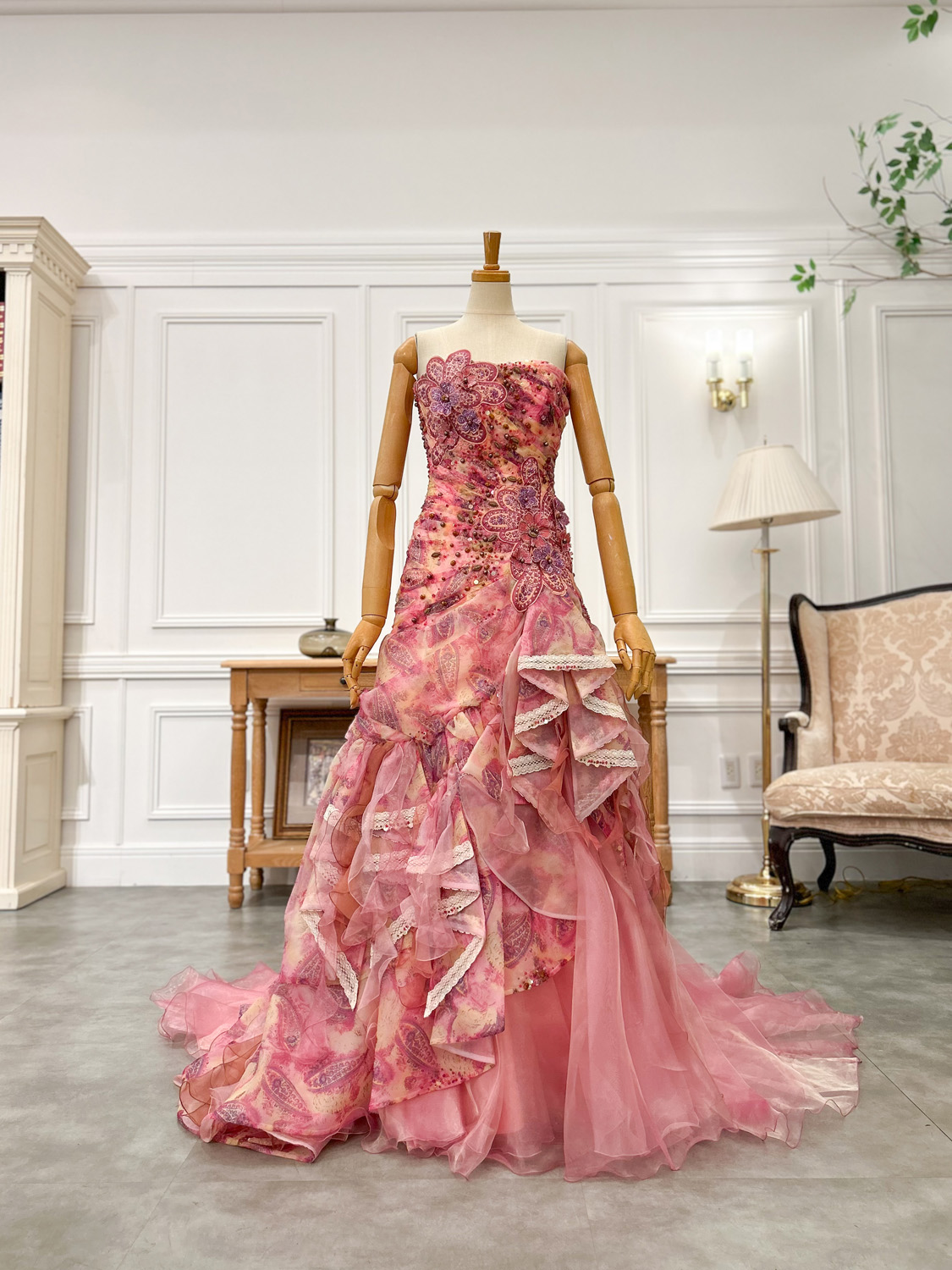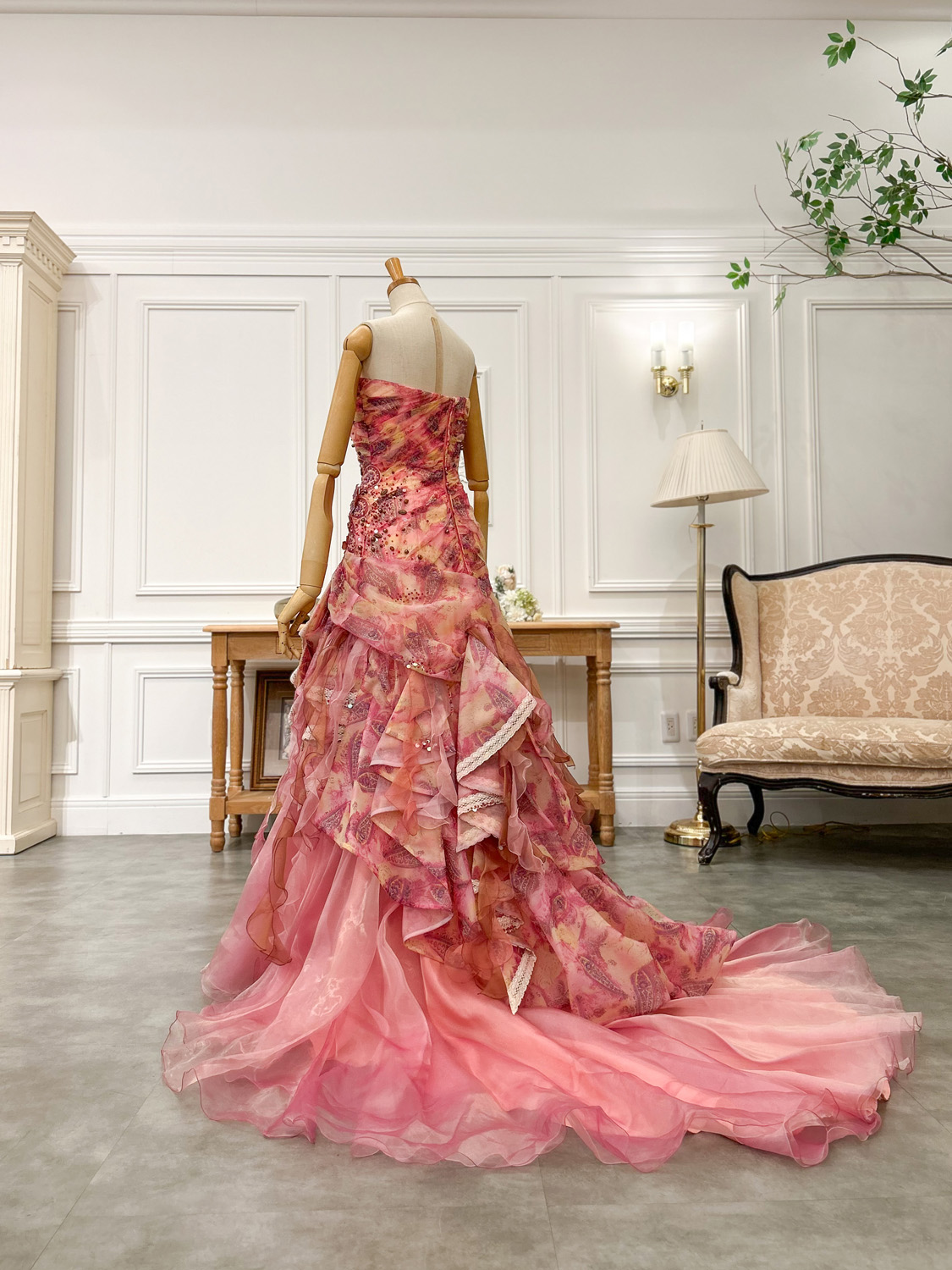 ピンクをベースに、ラズベリーやゴールドのアクセントが華やかに溶け合うカラードレス。