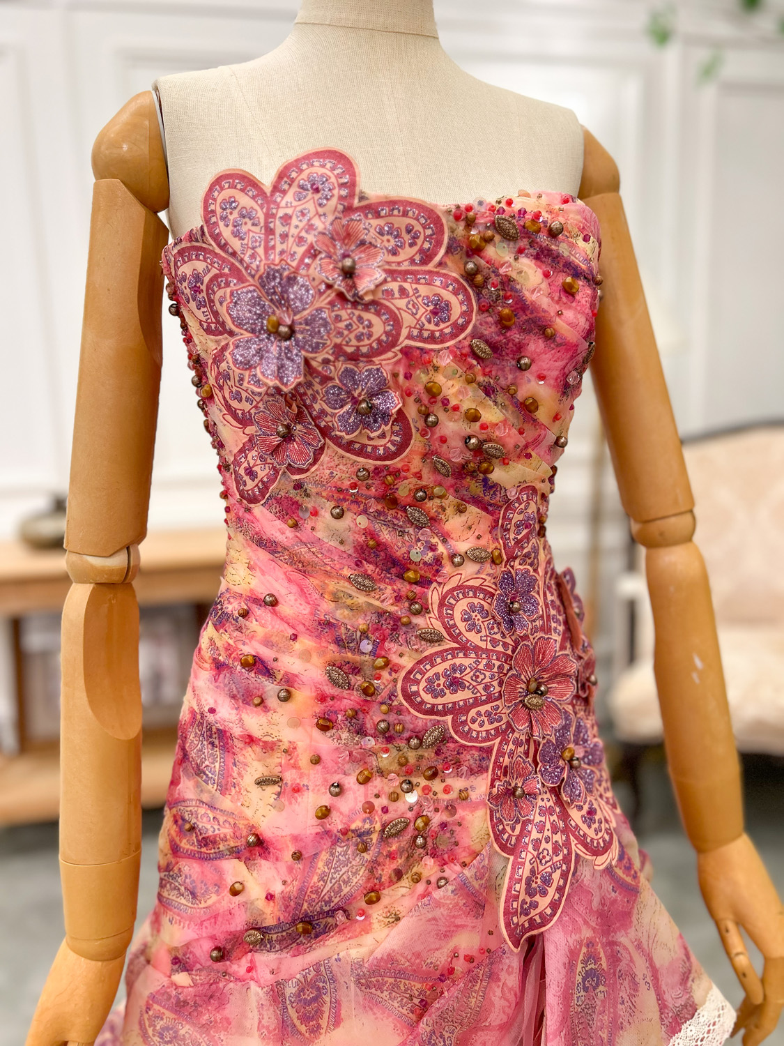 身頃には繊細な刺繍モチーフがびっしりとあしらわれ、光を受けるたびに上品な輝きを放ちます。