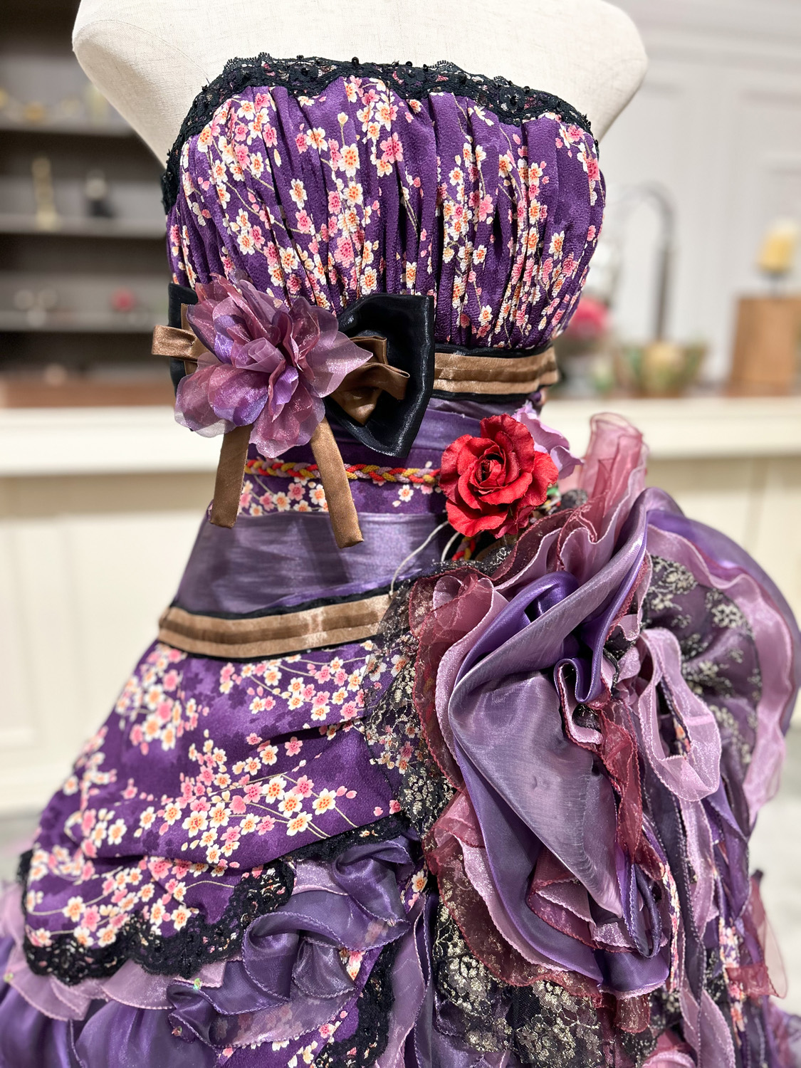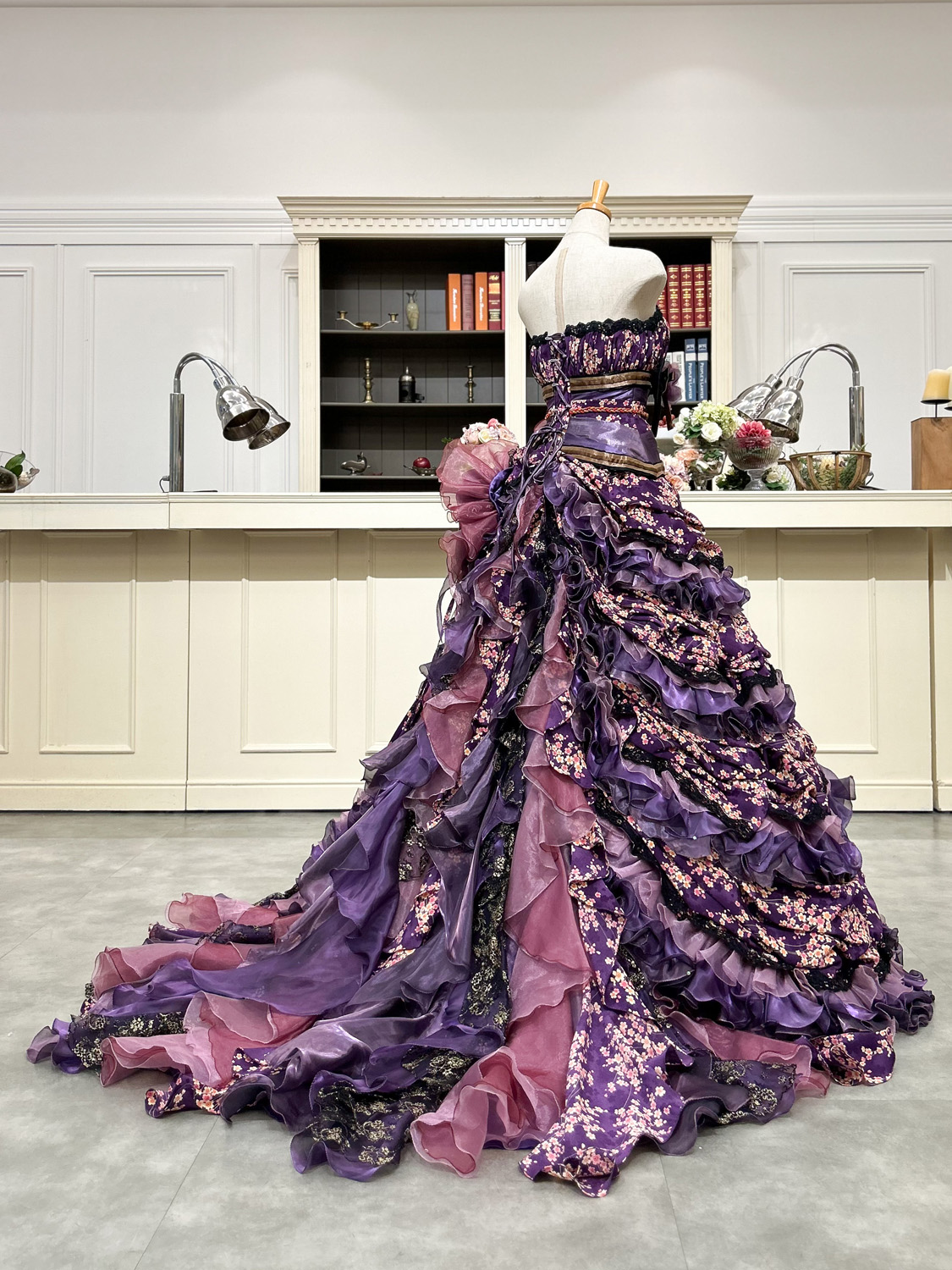 深い紫に咲く小花模様と、艶やかな帯風のウエストデザインが印象的な一着。和のエッセンスを散りばめたモダンなカラードレスは、凛とした美しさと華やぎを両立させ、唯一無二の存在感を放ちます。