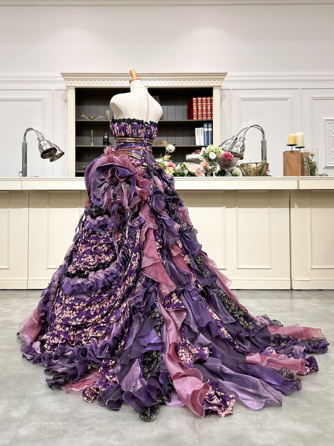 スカート部分は何層にも重ねたラッフルフリルが広がり、ボリューム感と優雅な動きを両立。パープルの濃淡がつくる立体感により、写真映えも抜群です。バックスタイルにもこだわり、ドラマティックなロングトレーンが特別な一日をより一層引き立ててくれます。