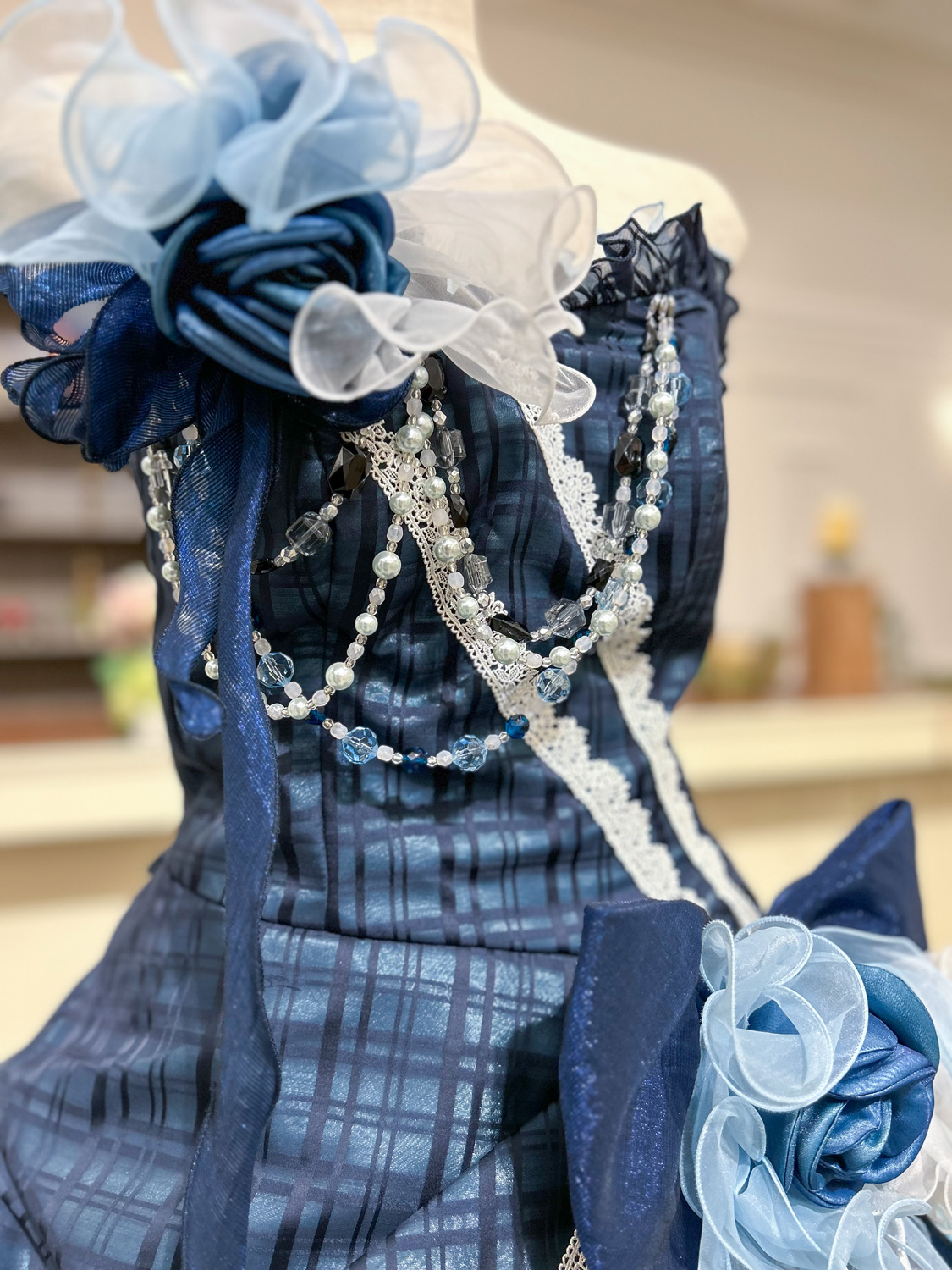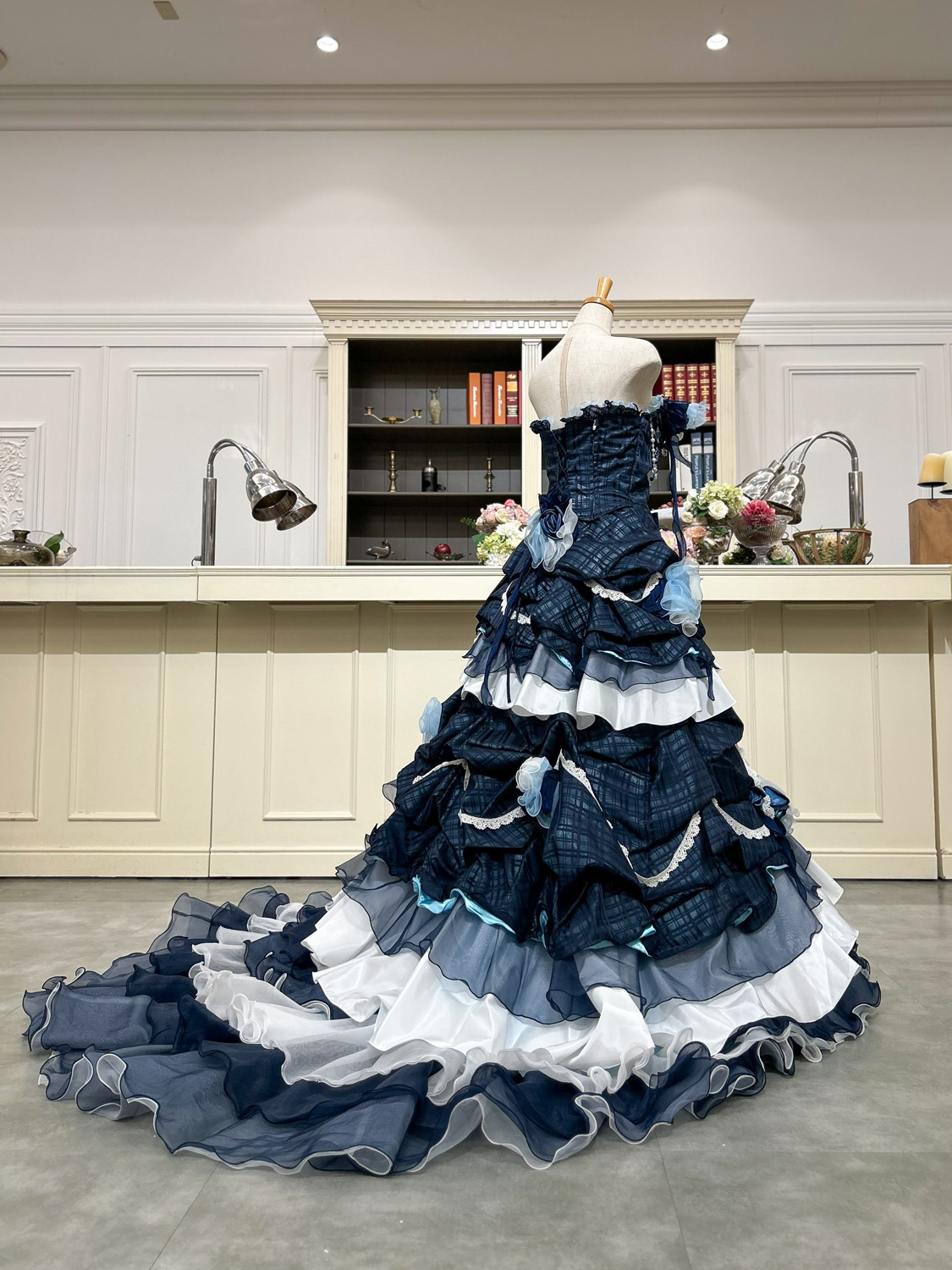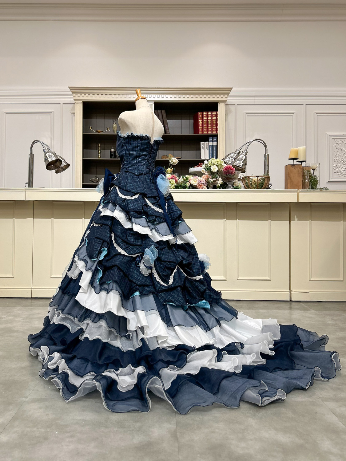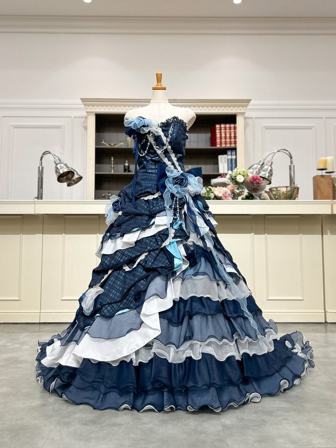ネイビーとアイスブルーの濃淡を美しく重ねた、上品かつ洗練されたカラードレス。