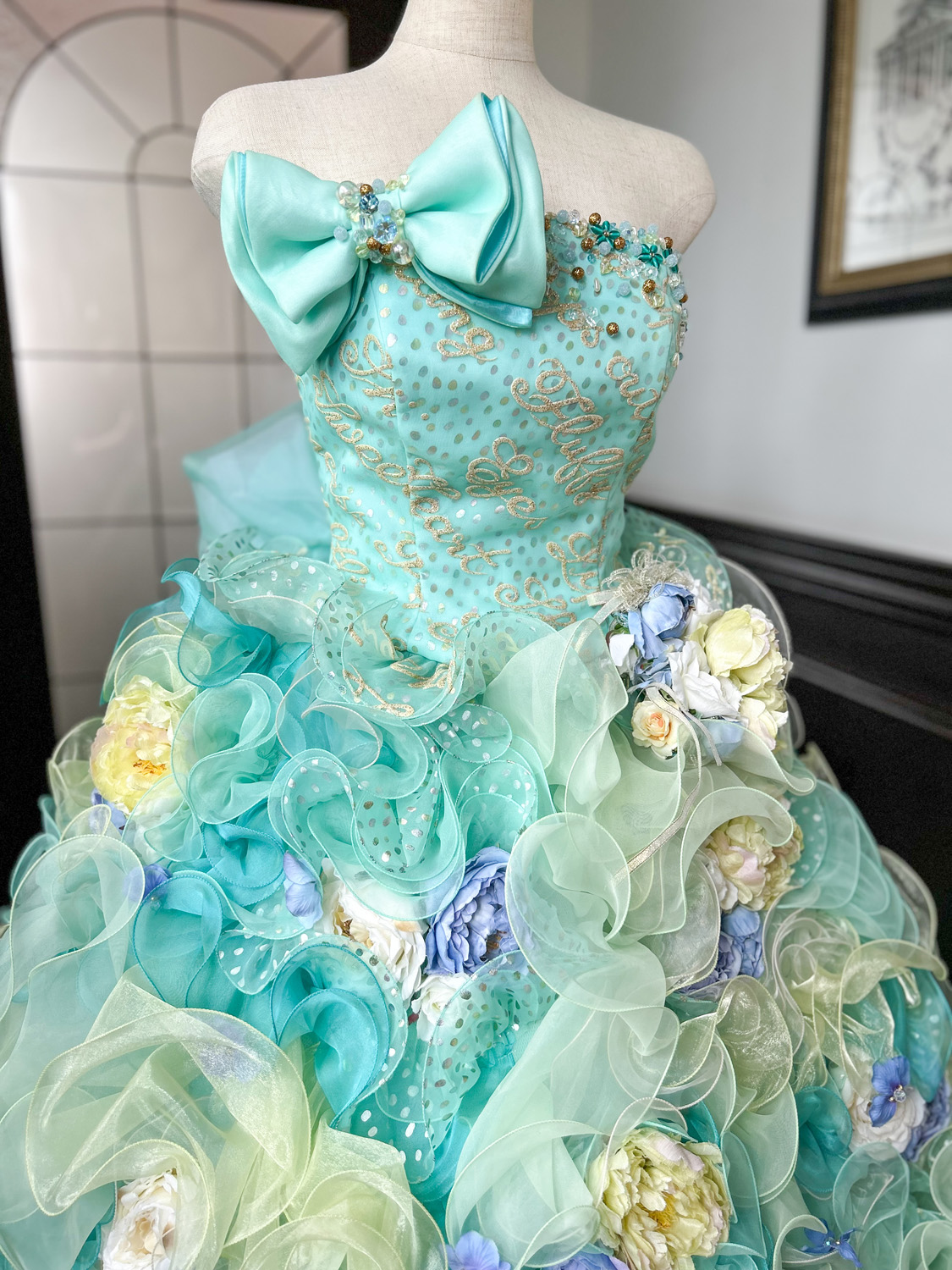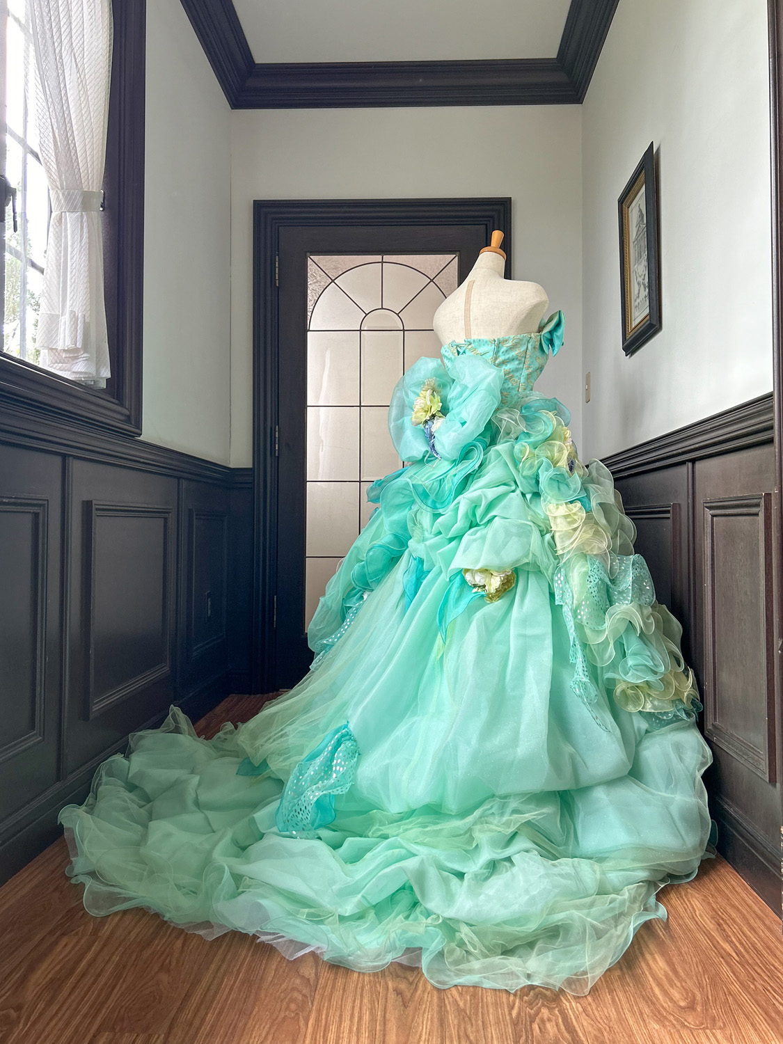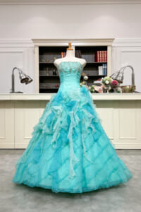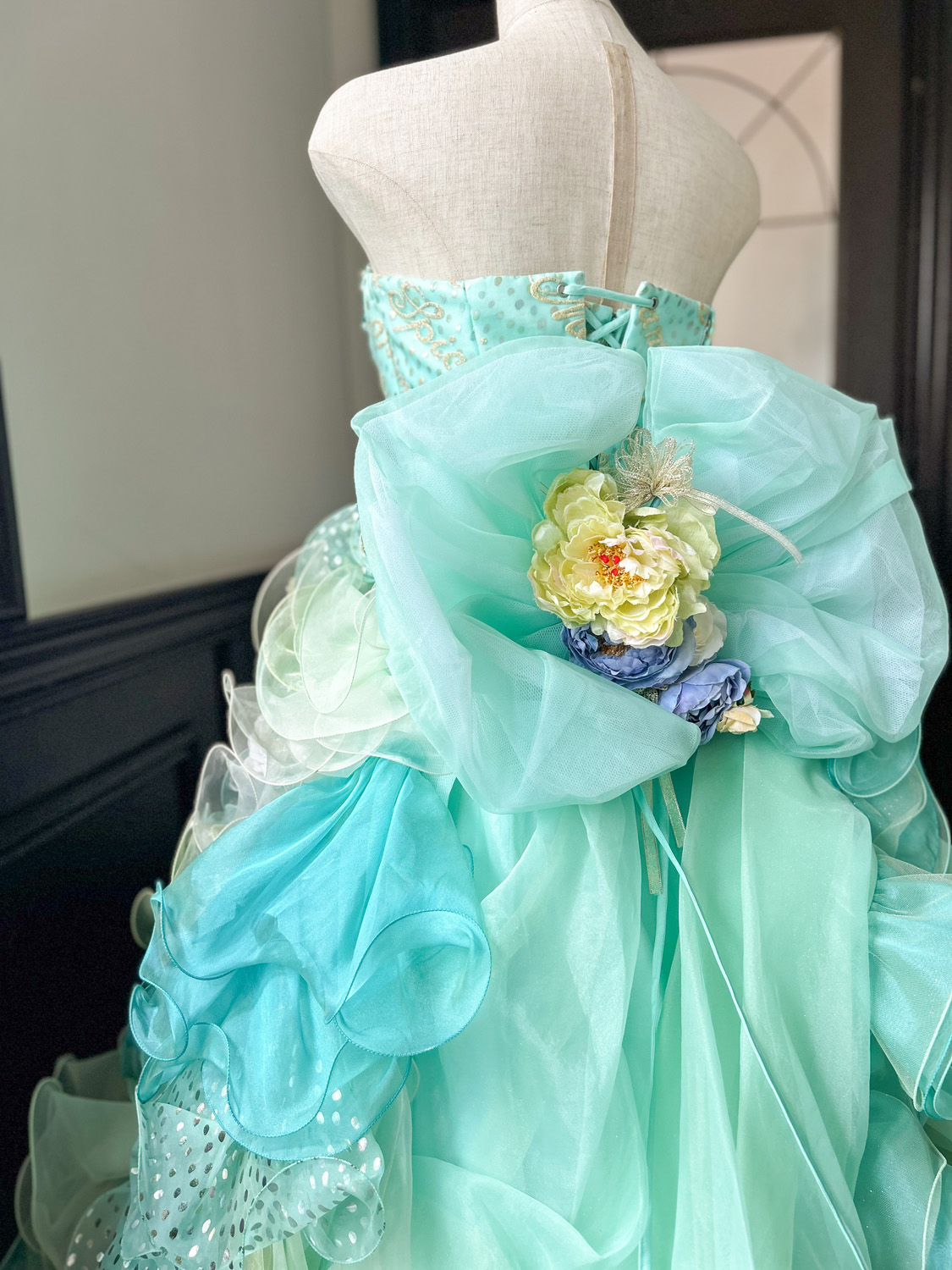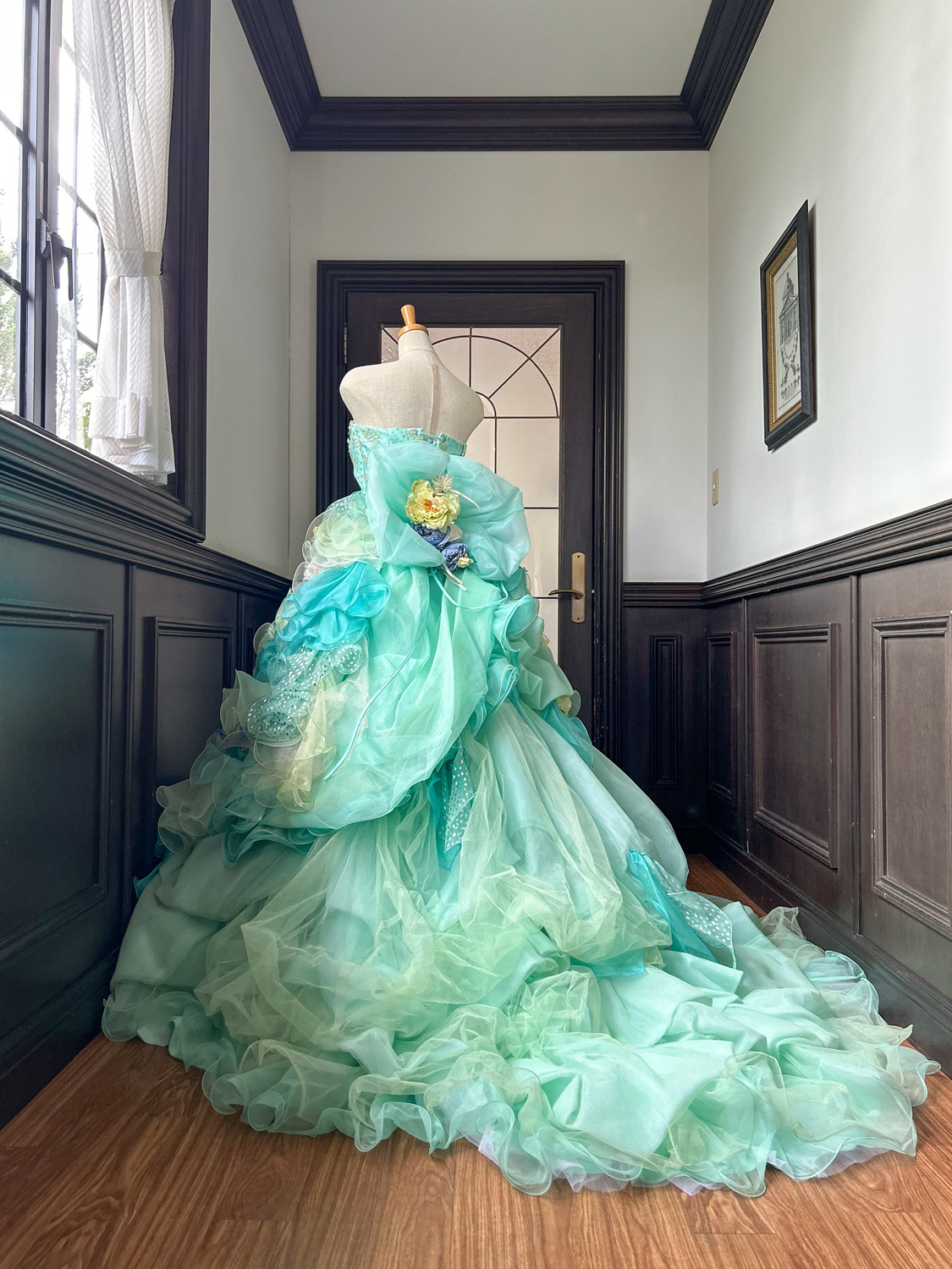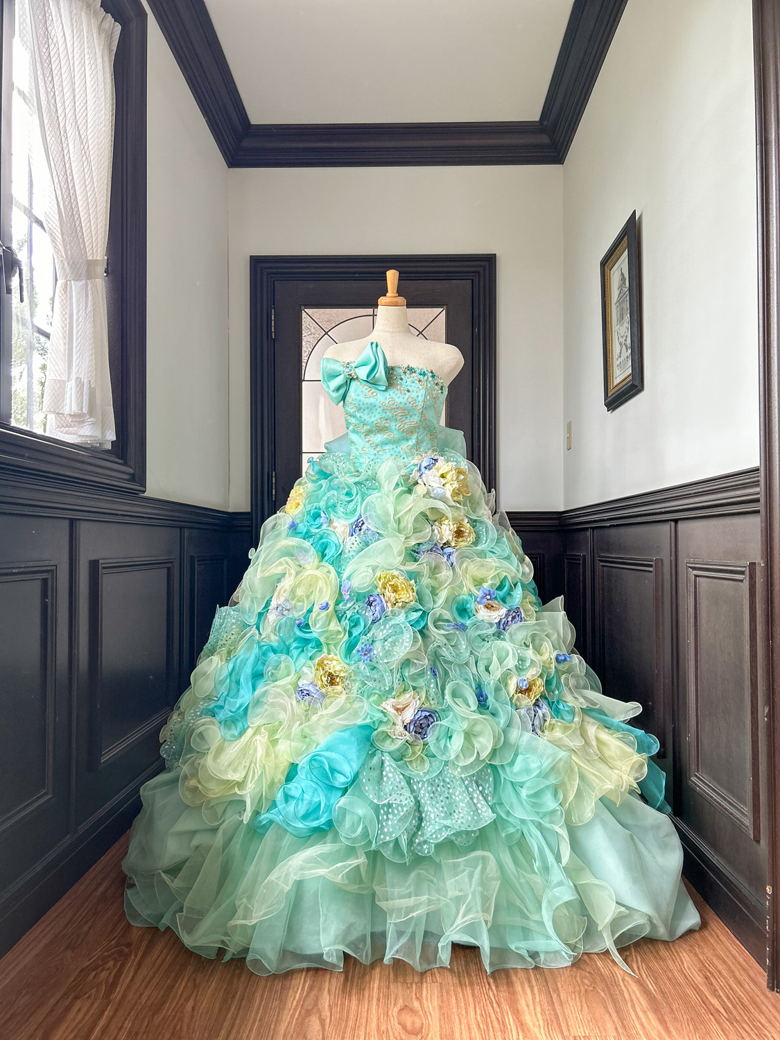 透明感あふれるミントグリーンに、パステルトーンの立体フラワーが咲き誇る華やかなカラードレス。