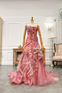 重厚感と華やかさをあわせ持つ、ボルドー×ピンクのカラードレス。