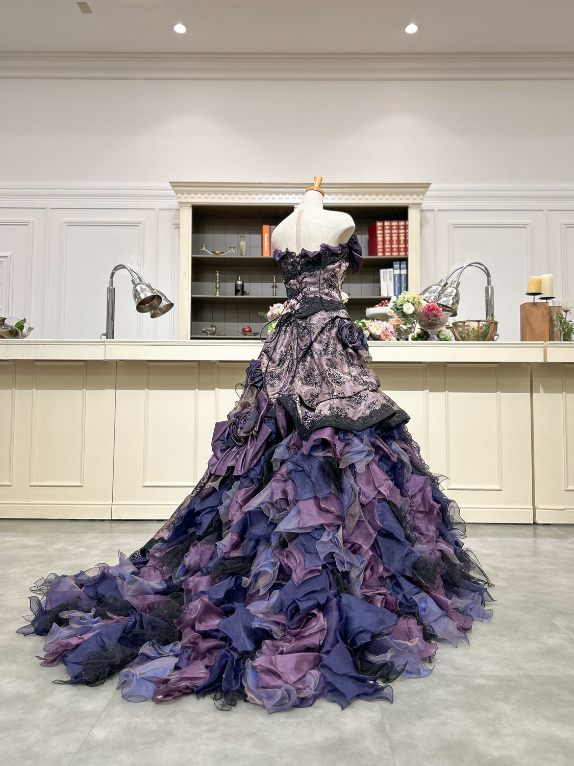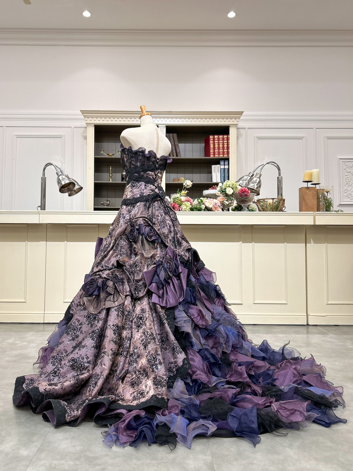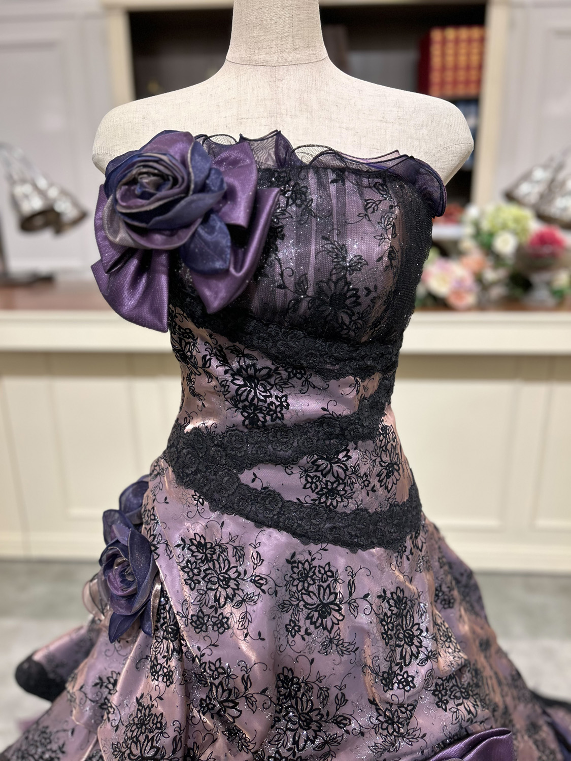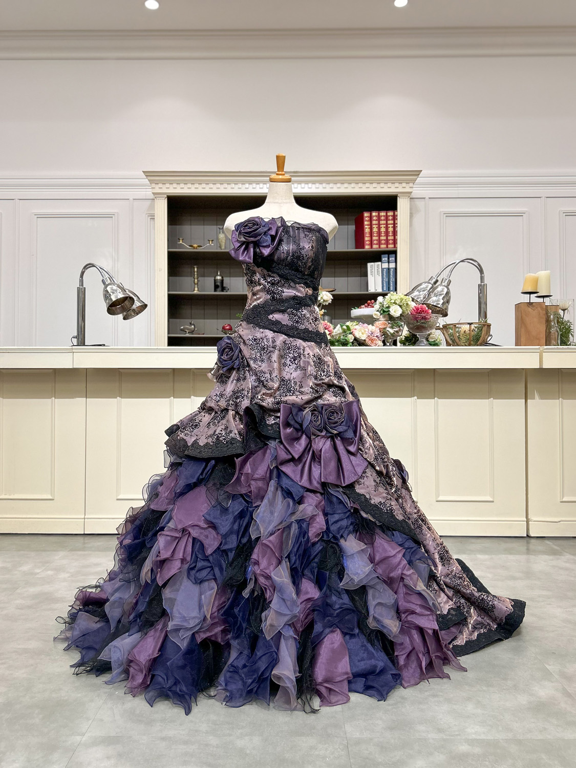 深みのあるダークパープルに、ブラックレースとアシンメトリーなフラワーモチーフが重なり合う、ドラマティックな印象のカラードレス。大人の気品と個性を両立させた一着は、華やかさの中にミステリアスな雰囲気を漂わせ、特別なシーンに強い存在感を放ちます。