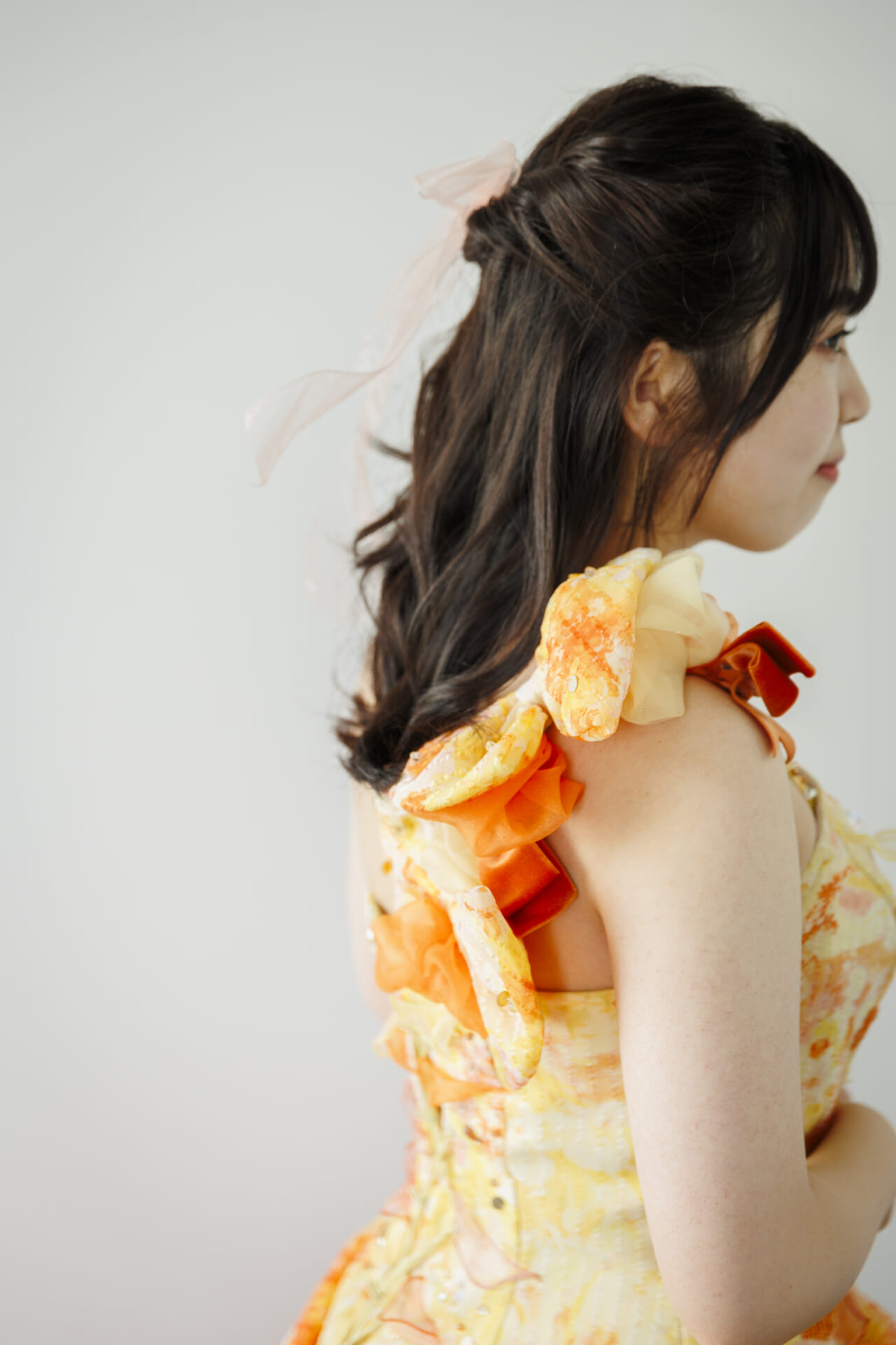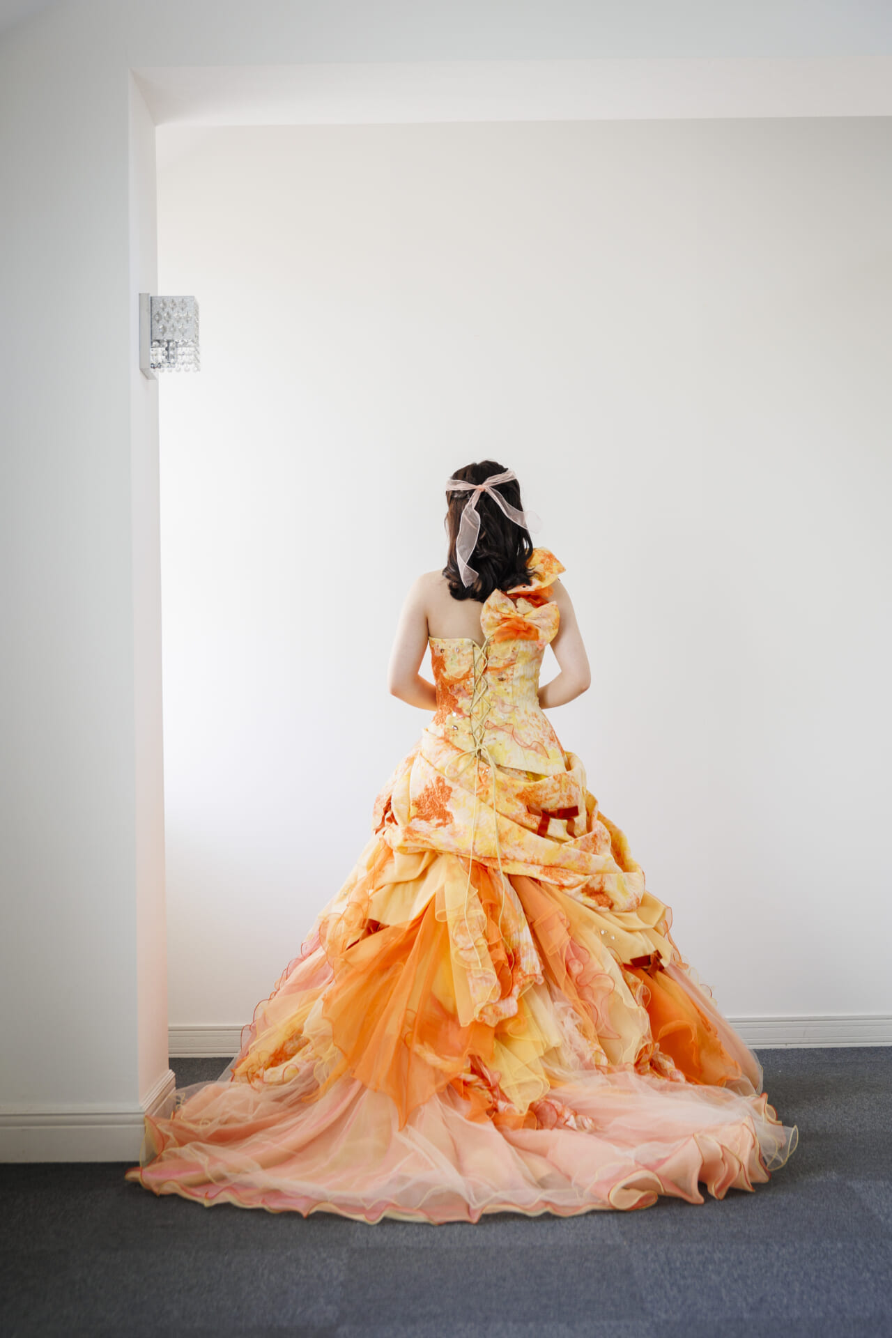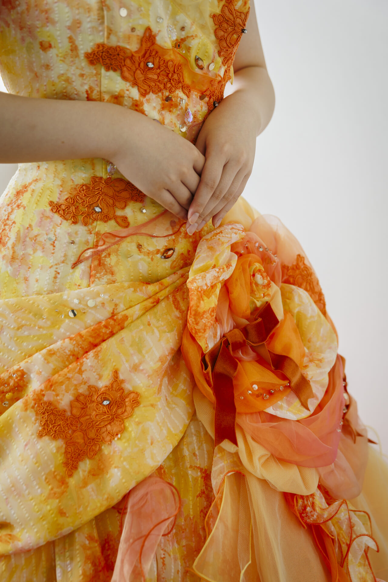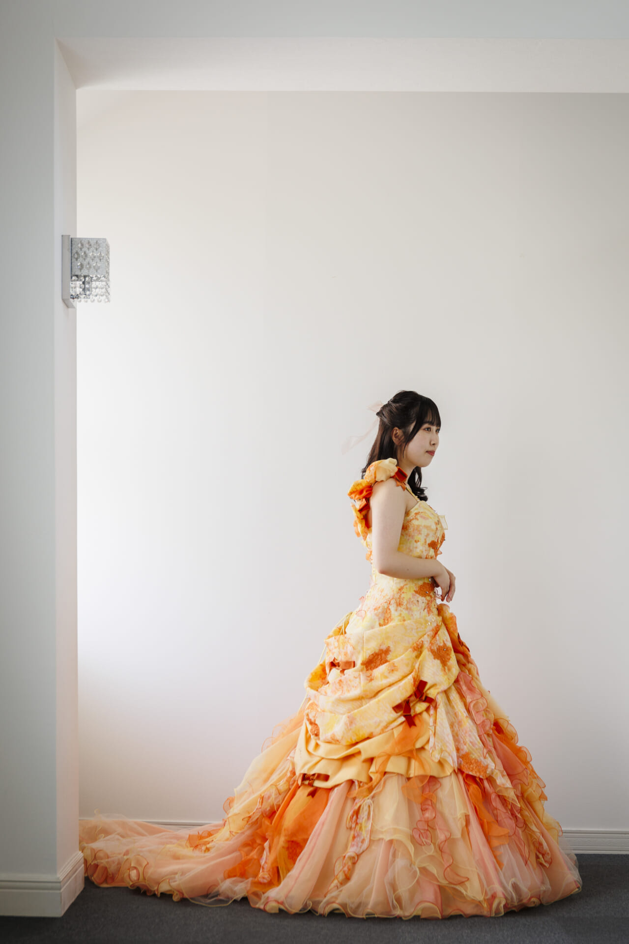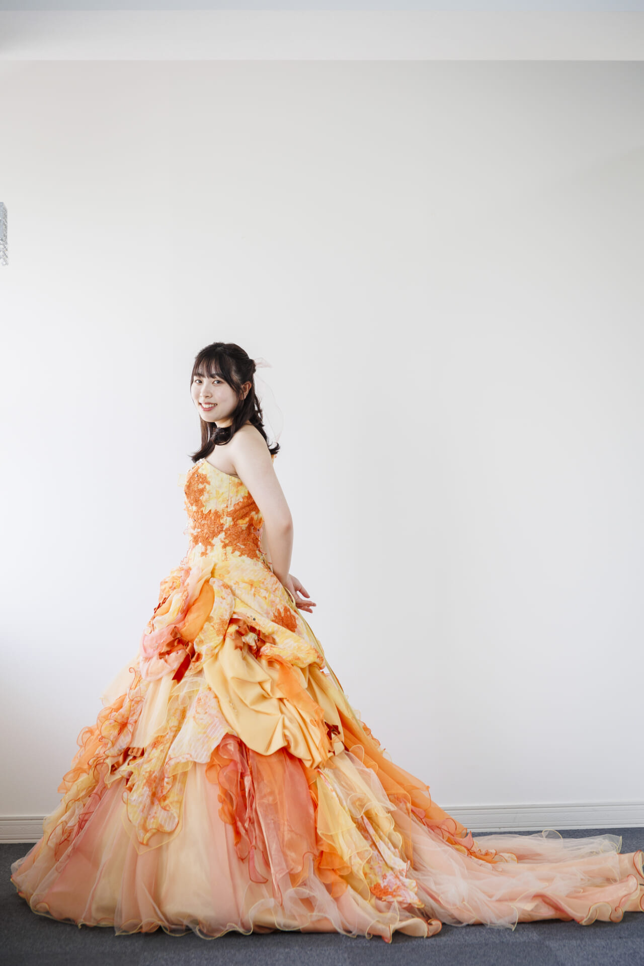 陽だまりのように温かく、鮮やかなオレンジとやわらかなピーチカラーが溶け合う華やかなカラードレス。まるで花びらが何層にも重なるように仕立てられたスカートは、軽やかなチュールとオーガンジーがふんだんに使用され、動くたびにふわりと優しく揺れ、写真に映える立体感を演出します。