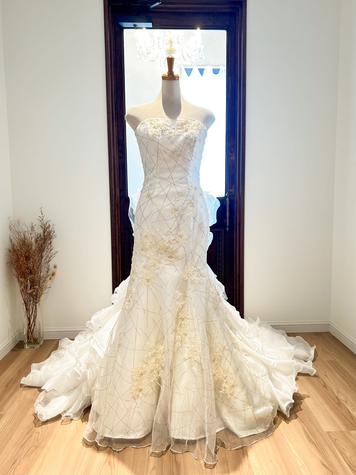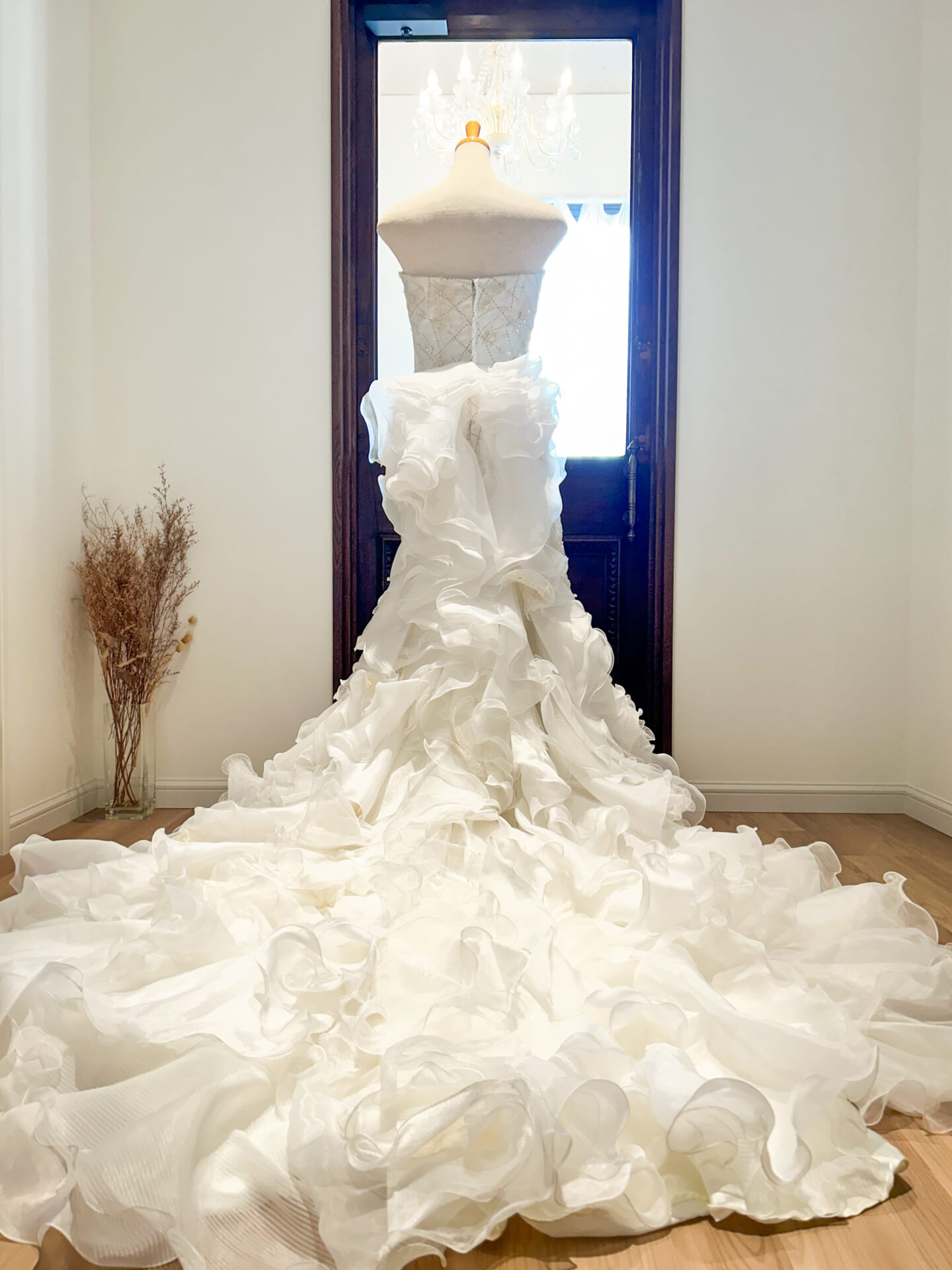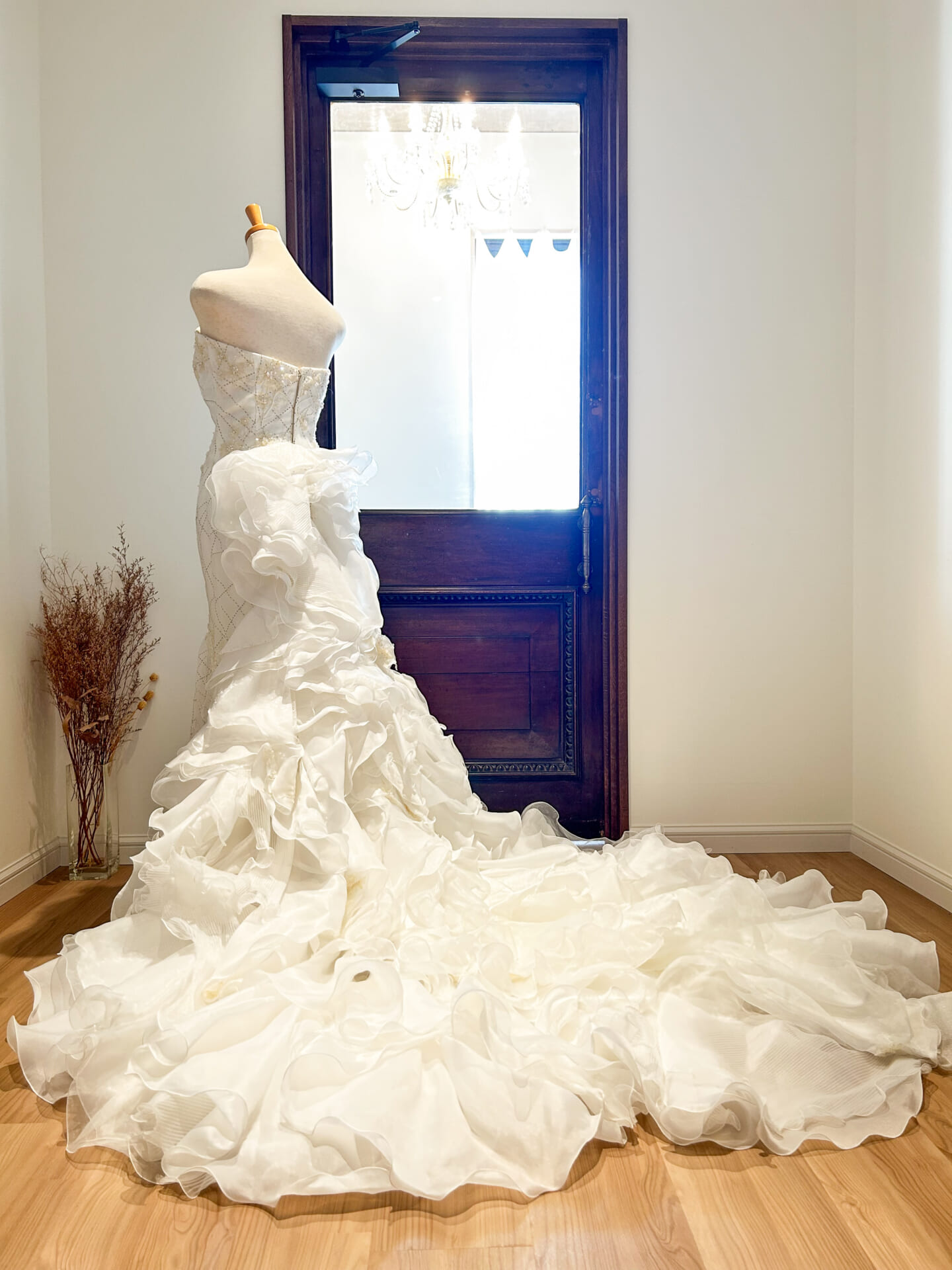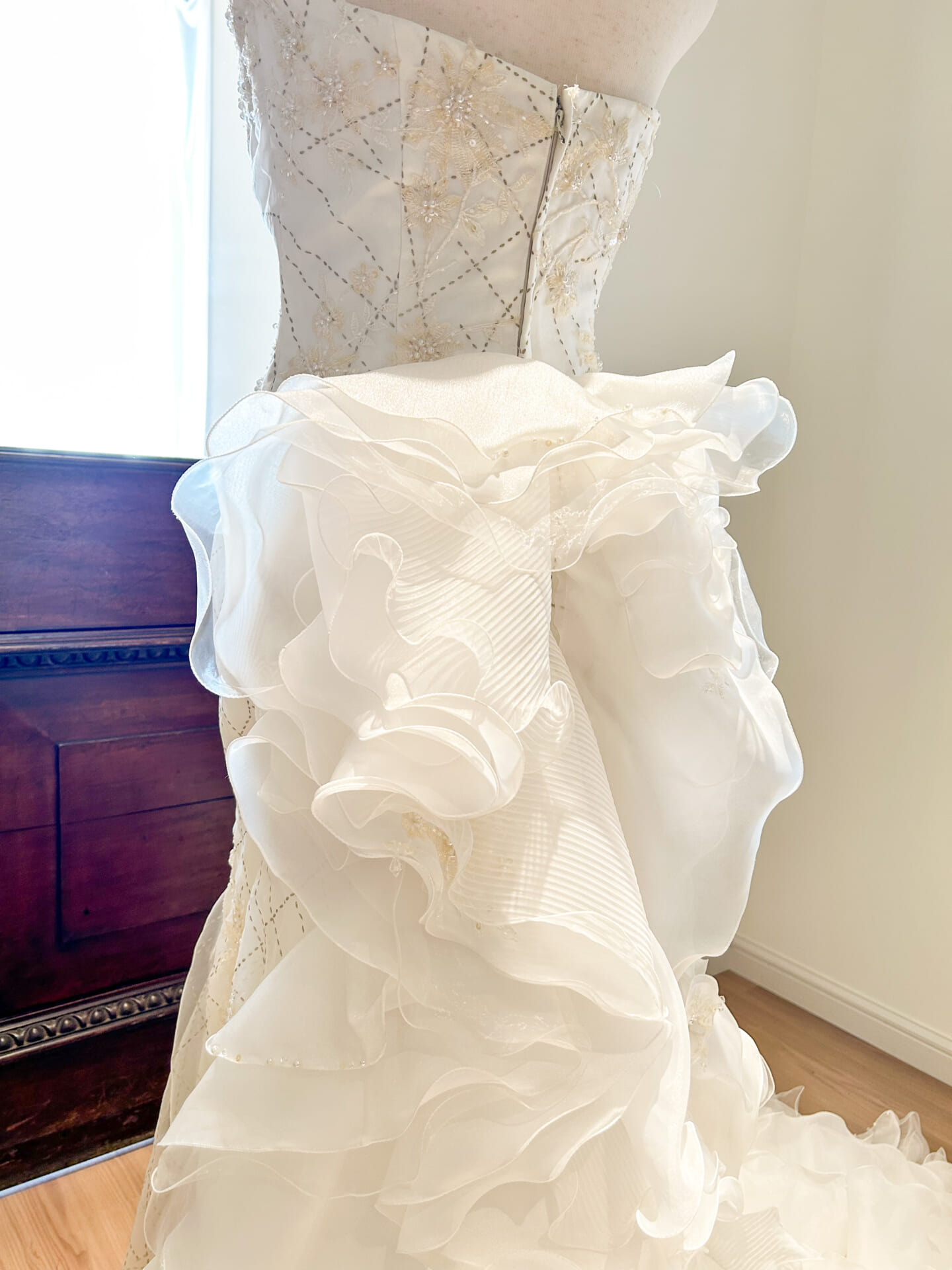ウエストからヒップラインにかけては、すっきりとしたタイトなシルエット。美しいボディラインを際立たせながら、腰元からドラマティックに広がるフリルのトレーンへとつながっていきます。スカート部分はランダムに重ねられたボリュームチュールで構成され、立体的な動きと軽やかな空気感が特徴。バージンロードやフォト撮影で後ろ姿に視線が集まる、印象的なデザインです。