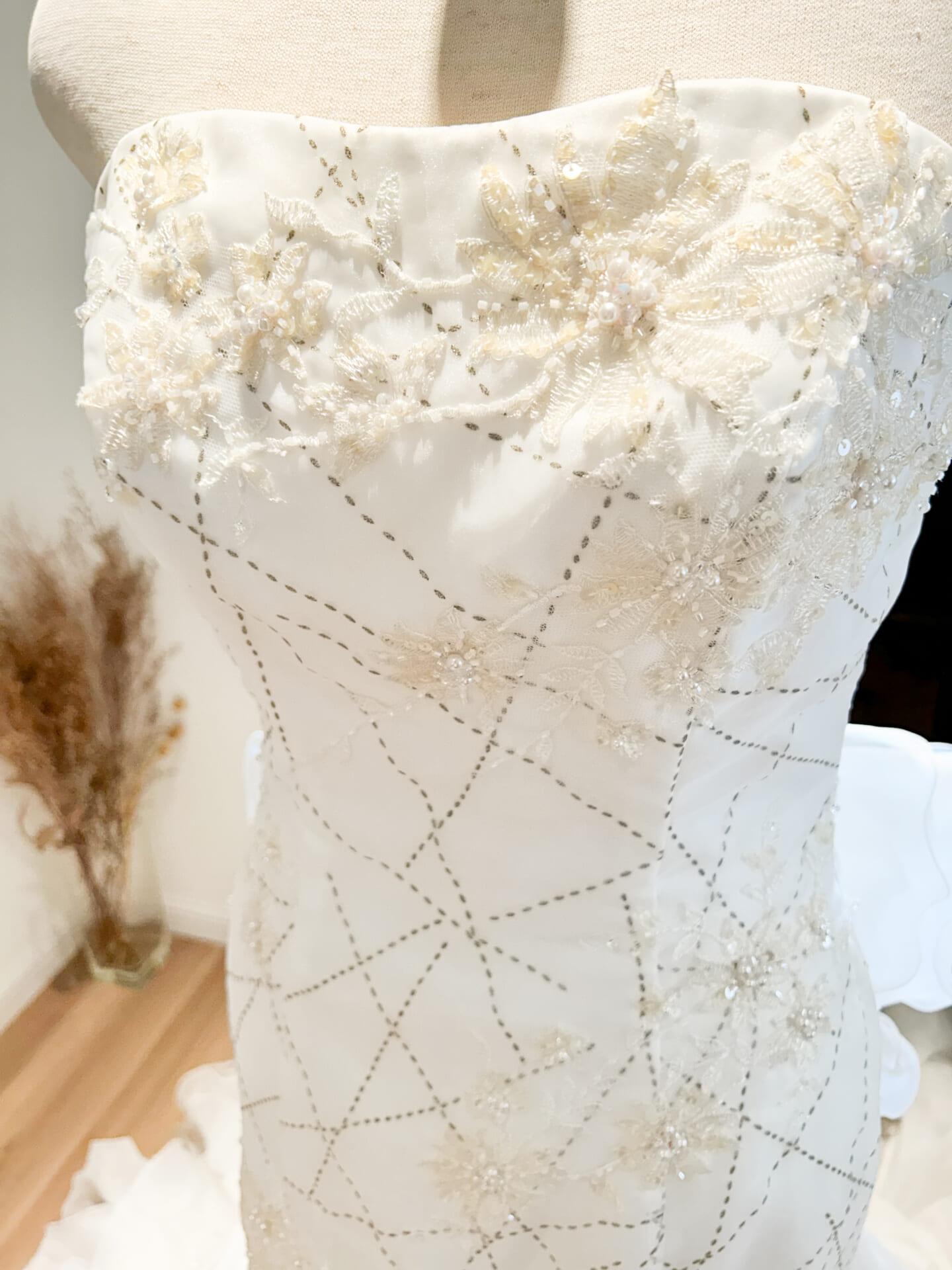 トップスは、オフショルダー風のやわらかなカッティングで、デコルテを上品に演出。胸元には繊細なレースとビジューがあしらわれ、さらに全体には細やかなラインストーンの刺繍が幾何学模様のように配置されています。動くたびにキラリと光を受け、写真映えも抜群です。