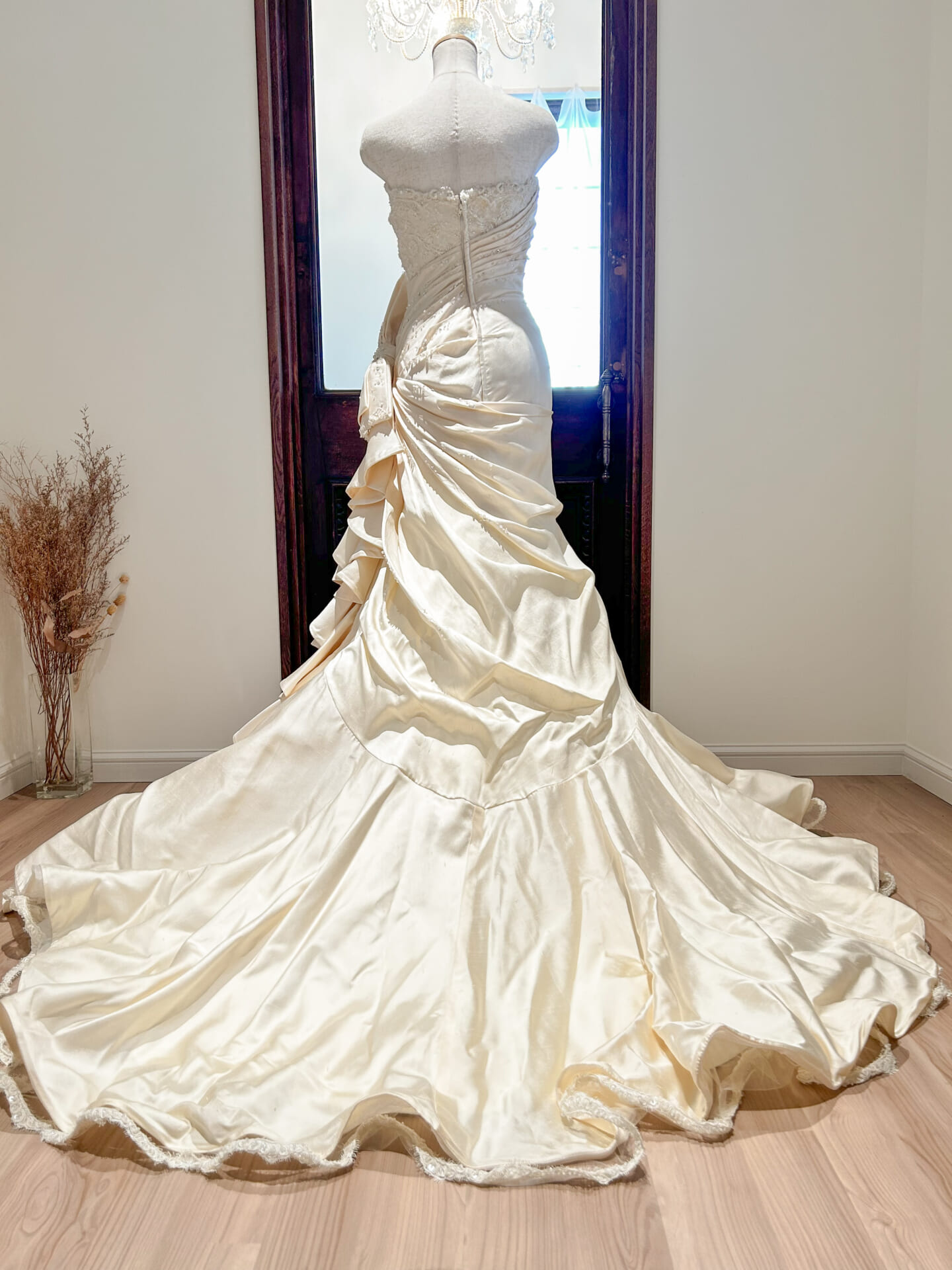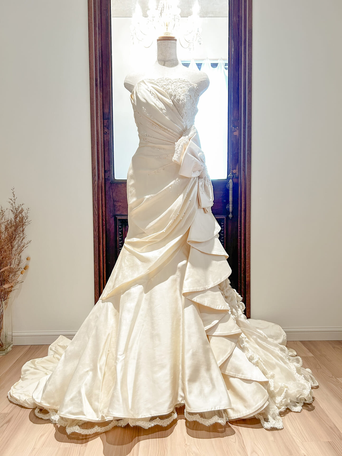 クラシカルな気品と華やかさを併せ持つ、エレガントなマーメイドラインドレス。艶のある上質なサテン生地が贅沢に使用され、光を受けるたびにしっとりとした光沢を放ちます。しなやかなドレープが美しく身体に沿い、立ち姿に気品と風格を与えてくれる一着です。
