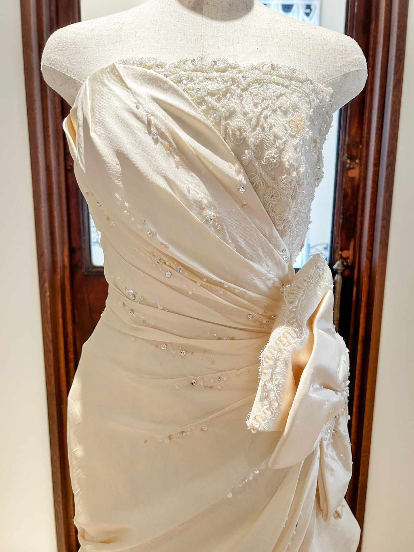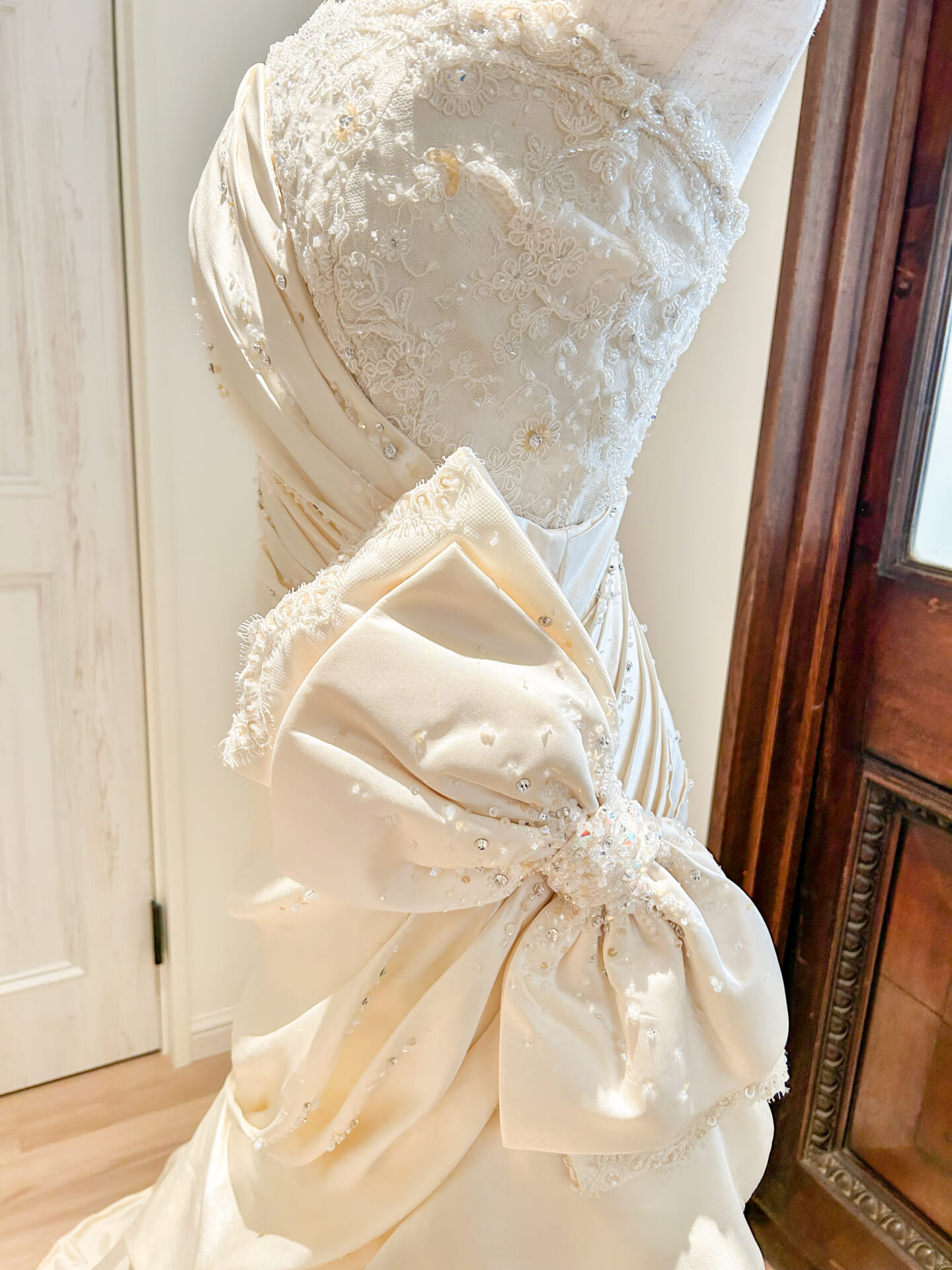 サイドには大きめのリボンモチーフがあしらわれており、存在感のあるアクセントに。立体的なリボンのディテールには繊細なビジューが散りばめられ、角度によってきらめきを放ちます。この華やかなワンポイントが、シンプルなドレス全体に洗練された印象を加えています。