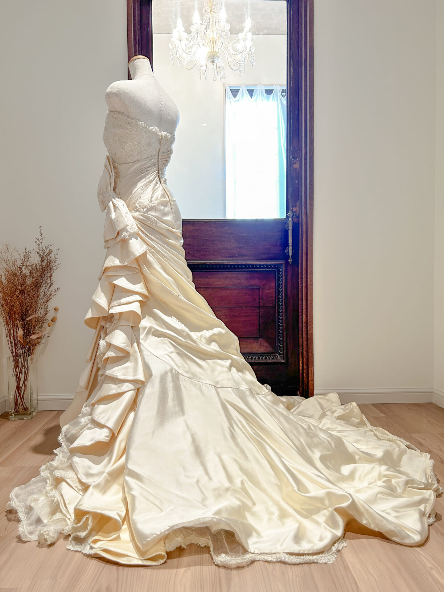 バックスタイルは、立体的に重ねられたラッフルが印象的で、優雅に広がるトレーンがドラマティックな後ろ姿を演出。ボリュームがありながらも重たさを感じさせない絶妙なシルエットバランスで、バージンロードでも写真映えのする一着です。