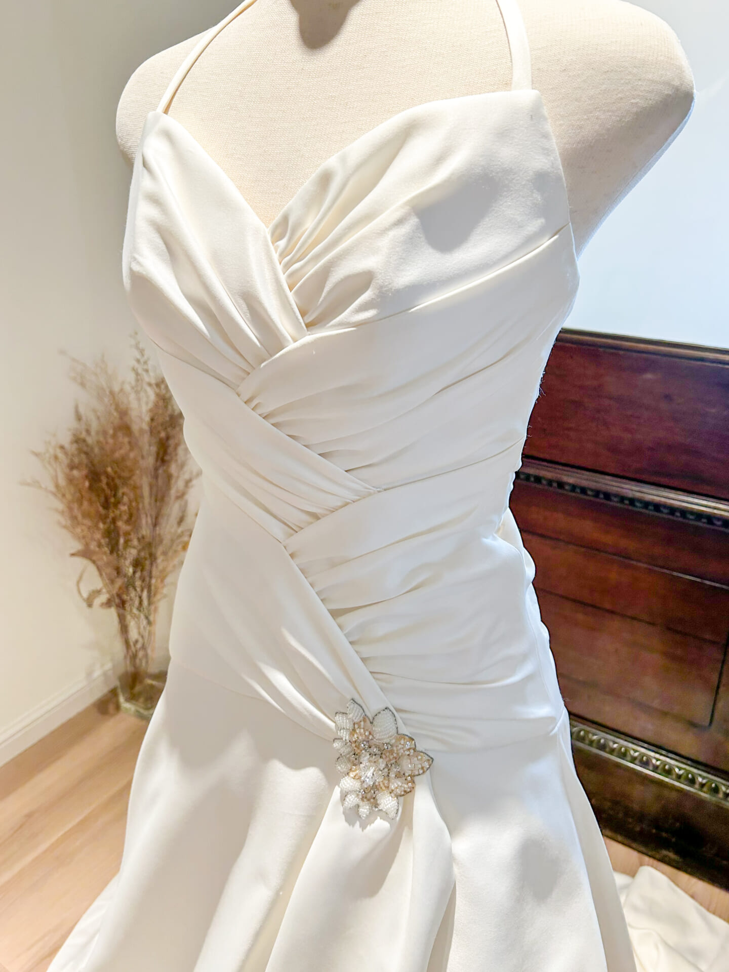 洗練された美しさを湛える、上質なサテン素材のスレンダーAラインドレス。シンプルなデザインの中に、立体的なドレープや美しいカッティングを取り入れた一着は、花嫁のボディラインを優しく引き立て、気品あふれる佇まいを演出します。