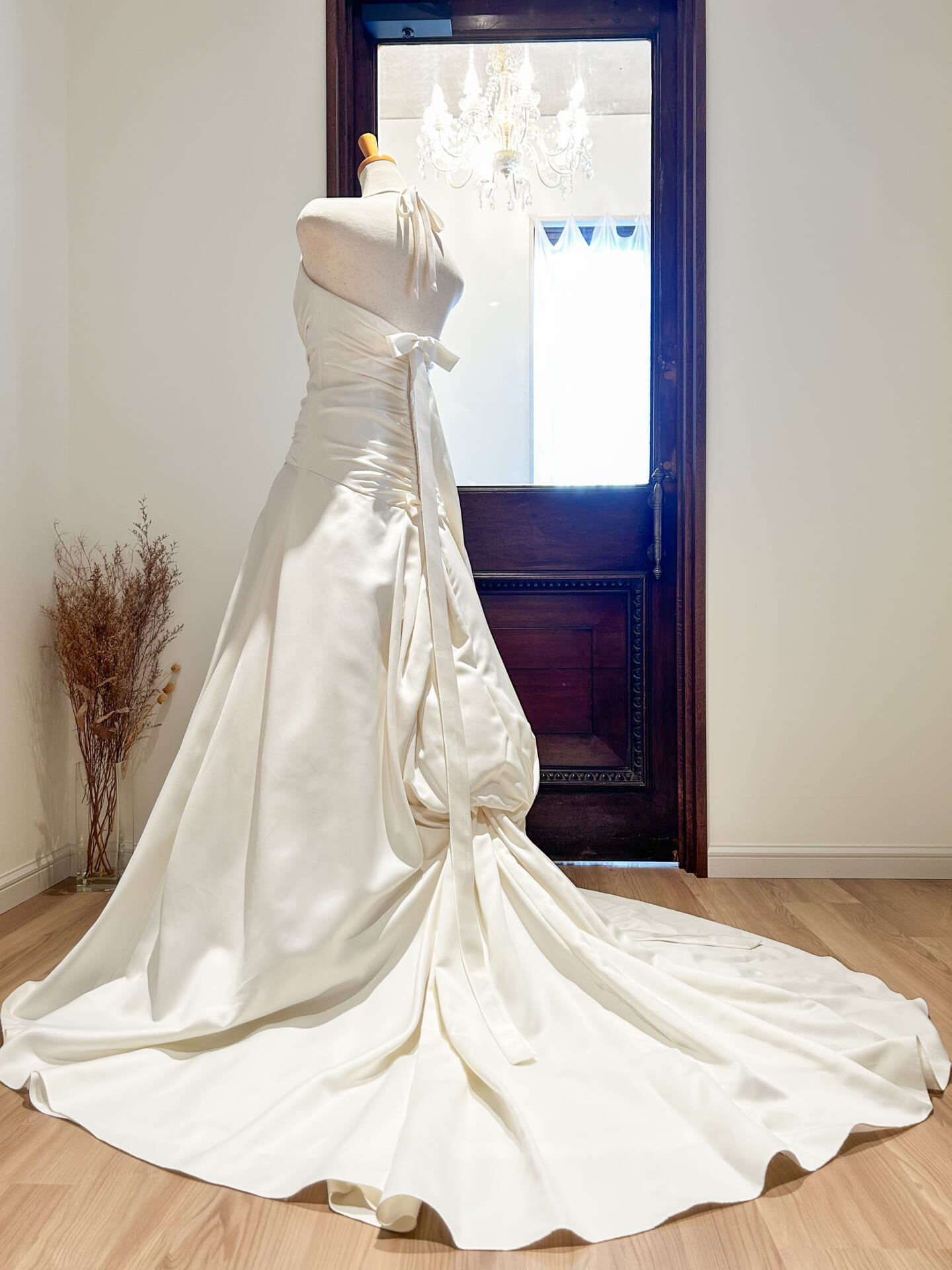スカートには斜めの切り替えを活かした立体的なドレープを施し、どの角度から見ても動きのある美しさを演出。ミニマルな印象ながらも、計算されたデザインと上質素材の組み合わせによって、上品で華やかな存在感が際立ちます。