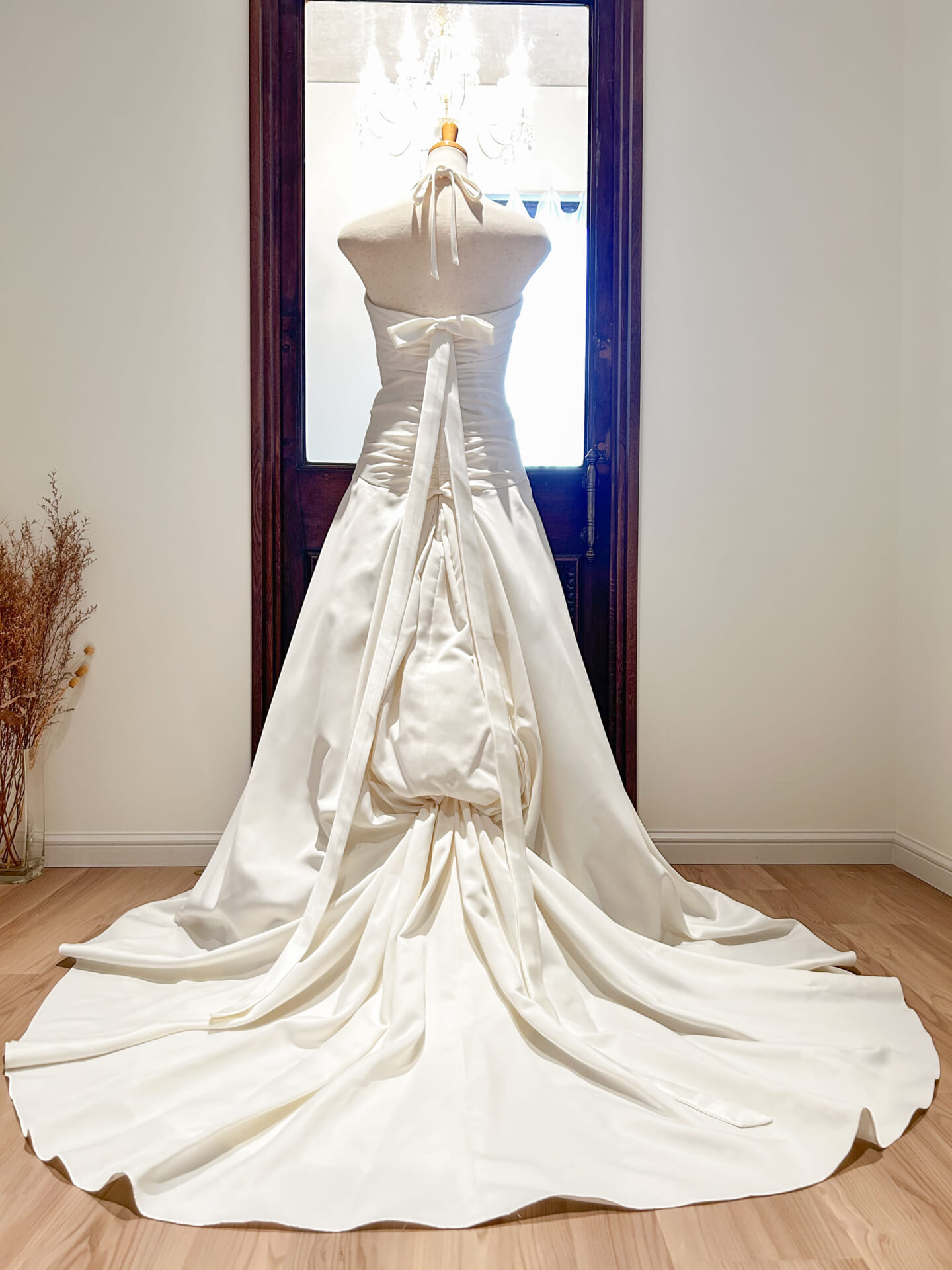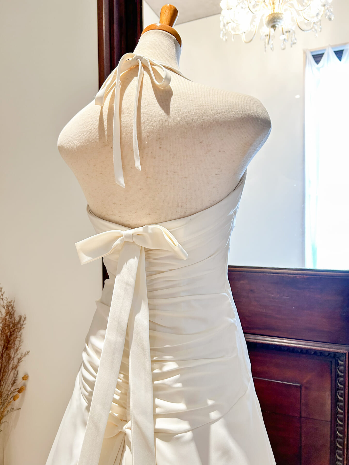 背中側はホルターネックで結ぶリボン仕様。後ろ姿にさりげない可憐さを添えるデザインで、写真映えも抜群です。腰位置から裾にかけて広がるトレーンには、布をたっぷりと重ねたラッフル風のデザインがあしらわれ、歩くたびに揺れる優雅なシルエットを楽しめます。