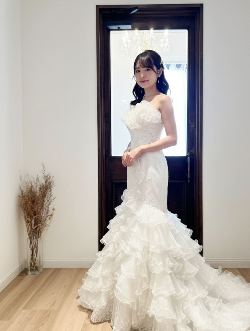 流れるようなシルエットと、柔らかな輝きをまとうラッフルスカートが美しい、ドラマティックなマーメイドドレス。デコルテを華やかに彩る立体的なフリルと、ボディラインを引き立てるすっきりとしたシルエットが、花嫁の魅力を最大限に引き出します。