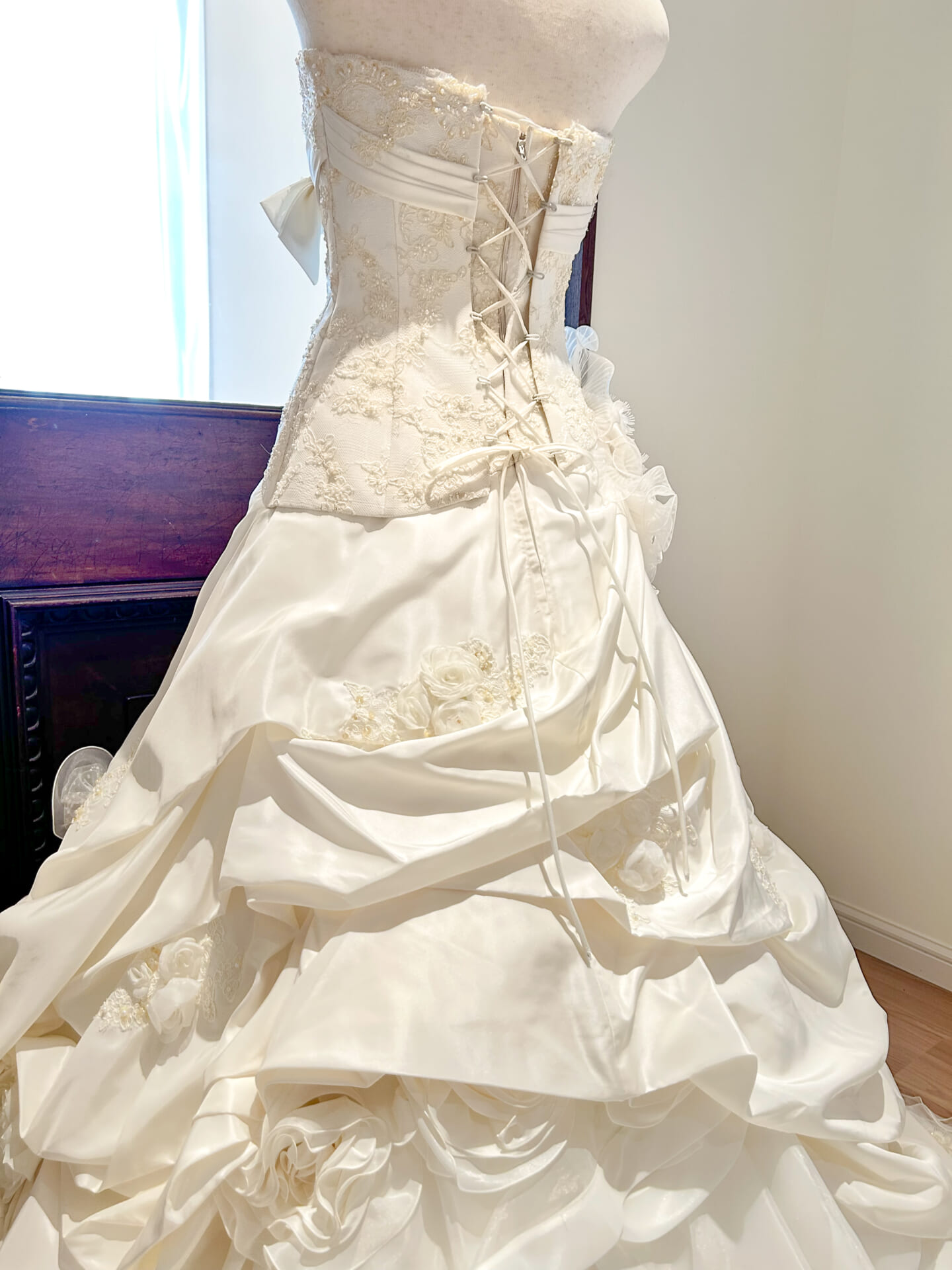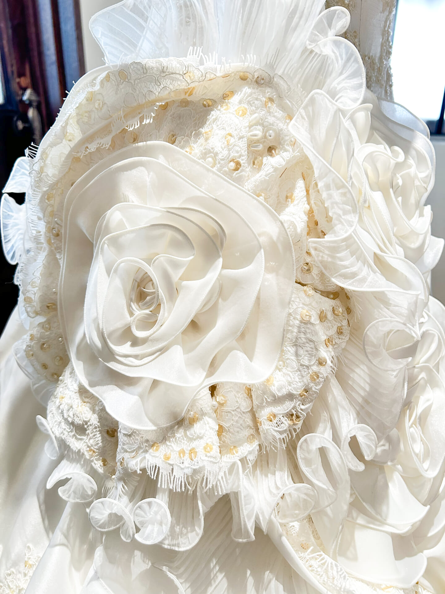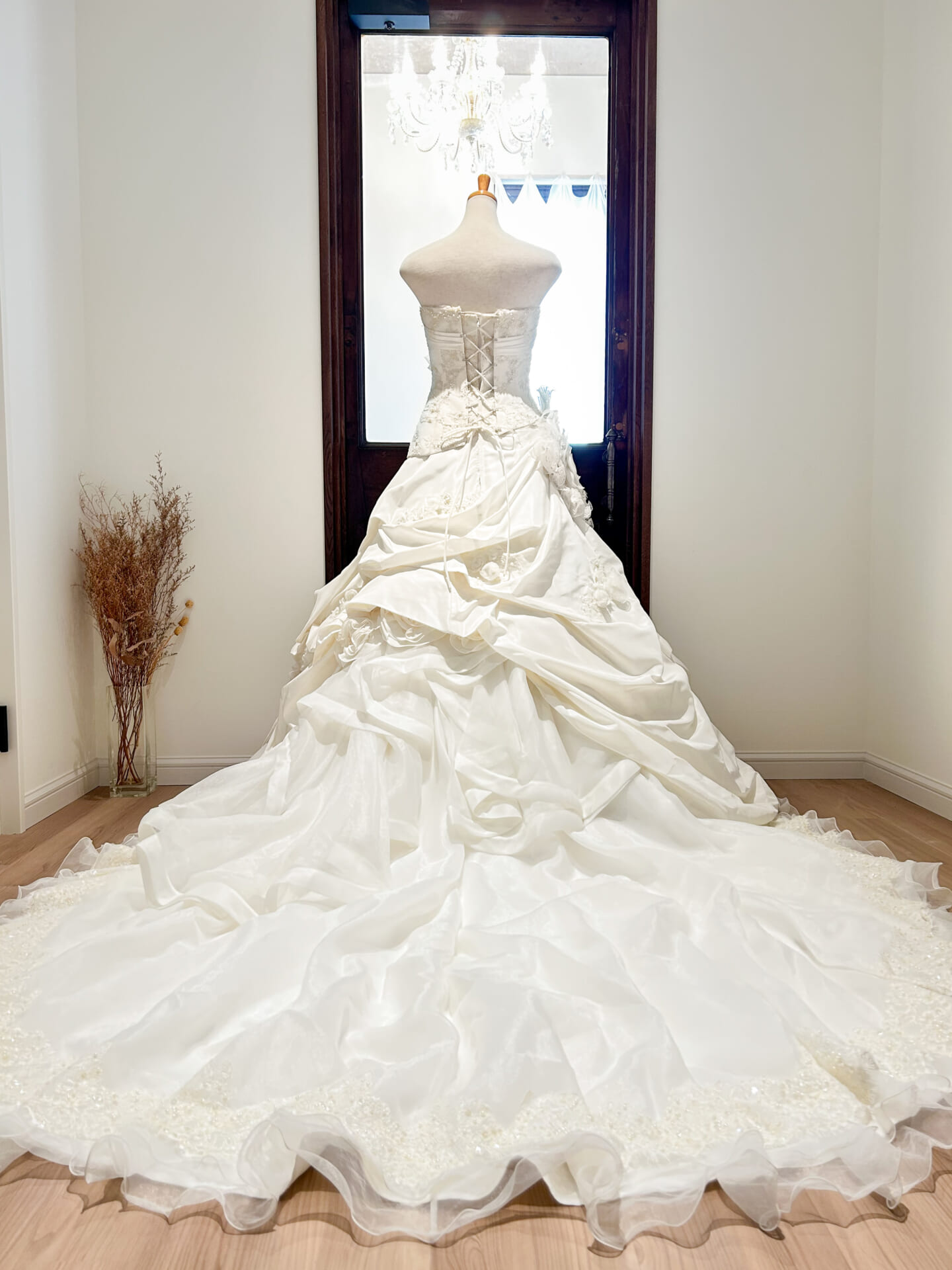 バックスタイルはドラマティックなフリルとトレーンが美しく、ヒップ下から立体感のあるラッフルが流れるように広がります。サテンのリボンが後ろ姿にも華やかさを添え、チャペルでの入場やフォト撮影にも映える仕上がりに。長めのトレーンも優雅さを際立たせ、クラシックなウエディングシーンにもぴったりです。