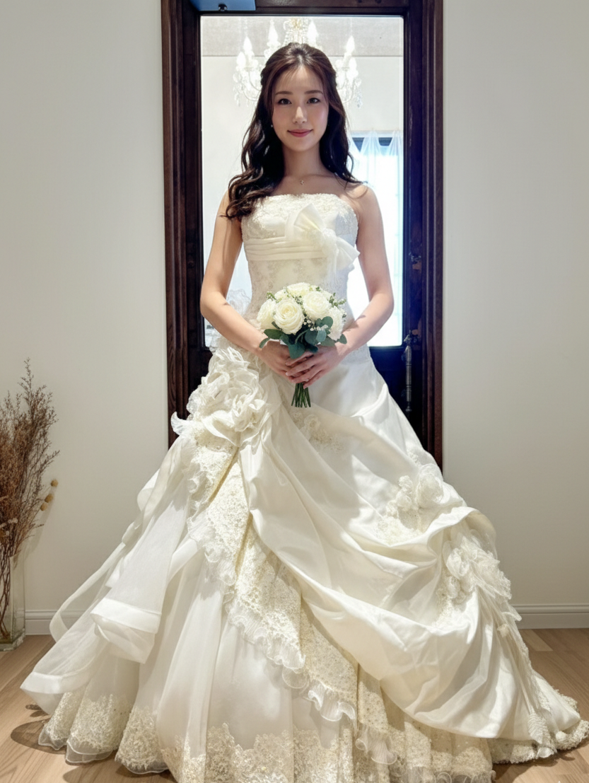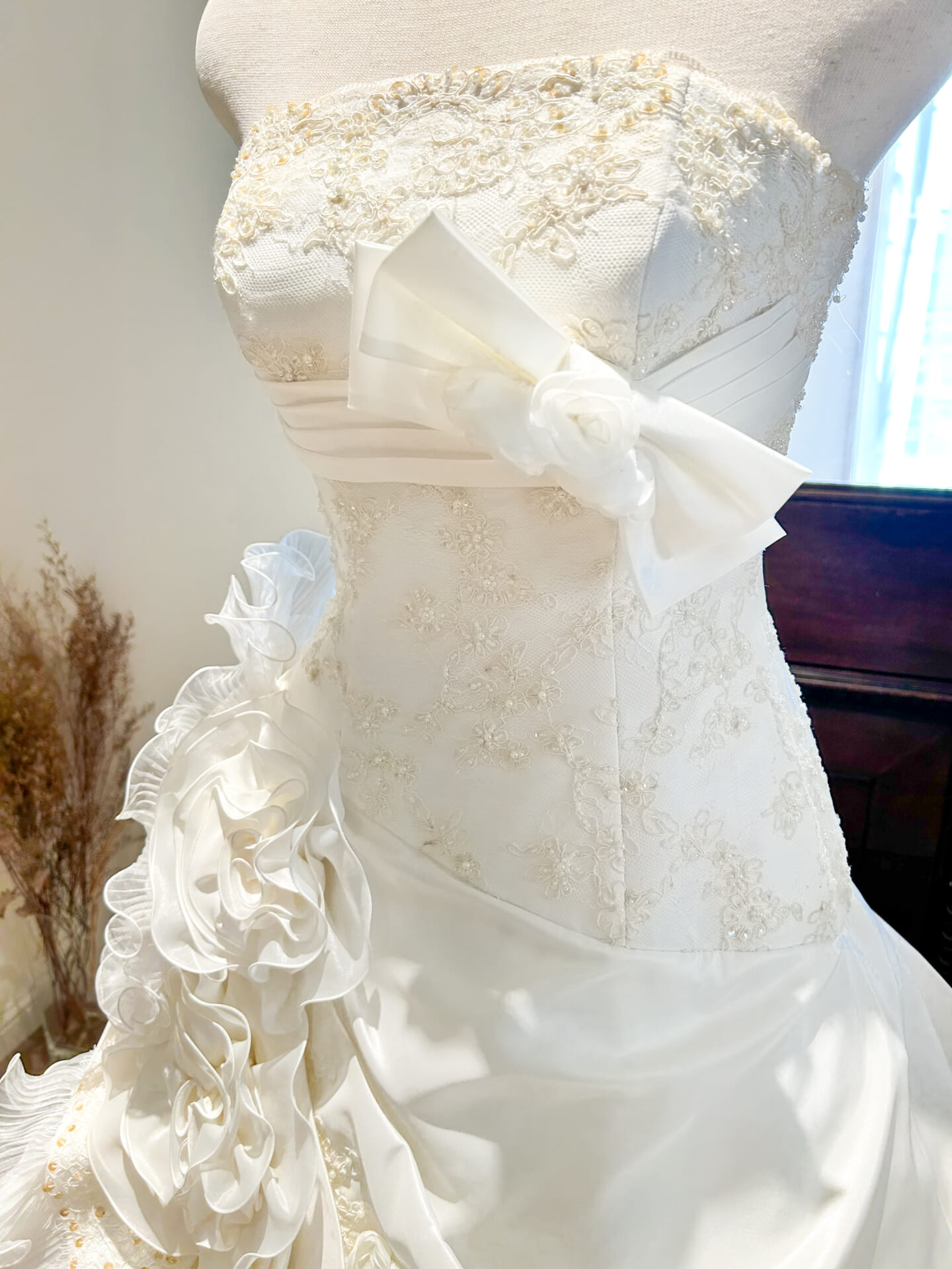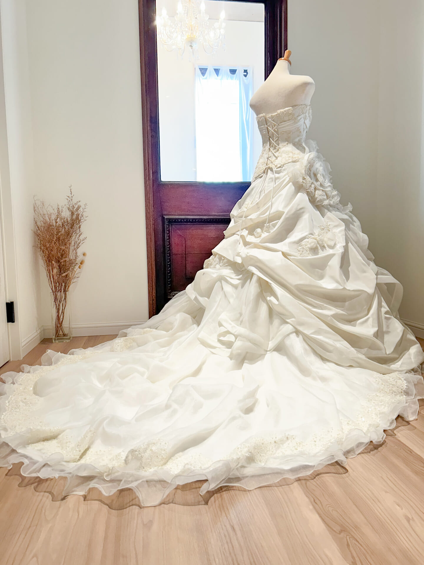 バックスタイルはドラマティックなフリルとトレーンが美しく、ヒップ下から立体感のあるラッフルが流れるように広がります。サテンのリボンが後ろ姿にも華やかさを添え、チャペルでの入場やフォト撮影にも映える仕上がりに。長めのトレーンも優雅さを際立たせ、クラシックなウエディングシーンにもぴったりです。