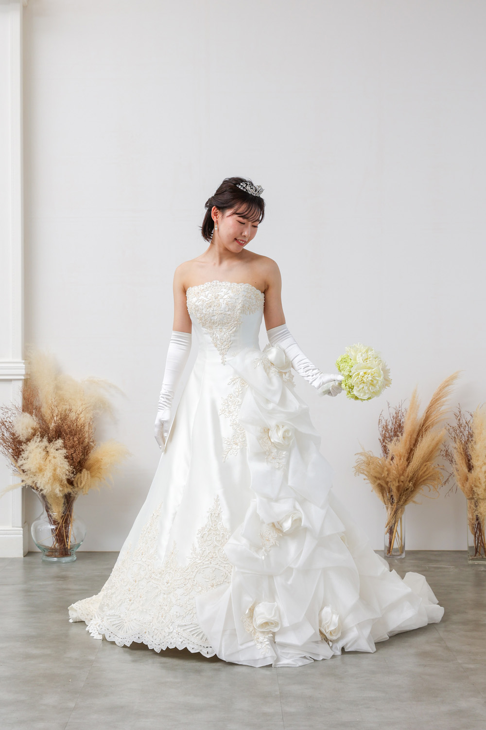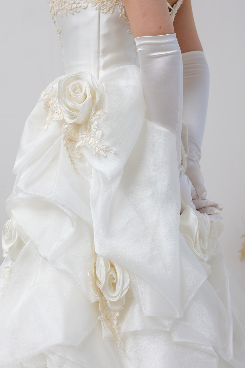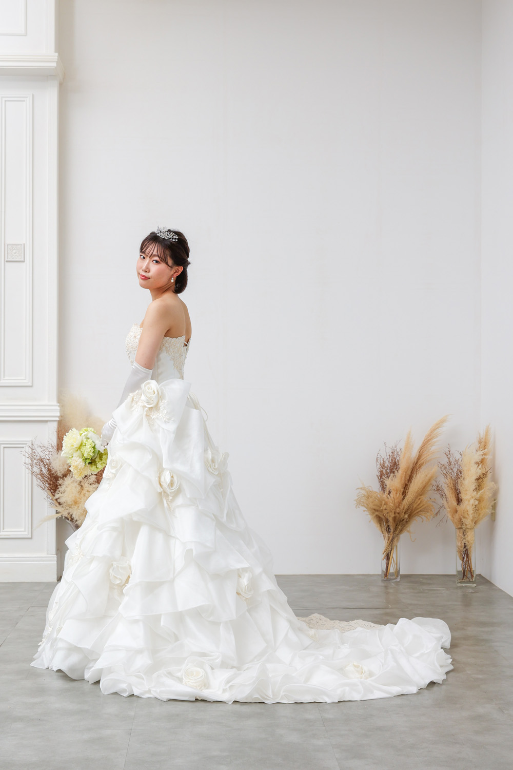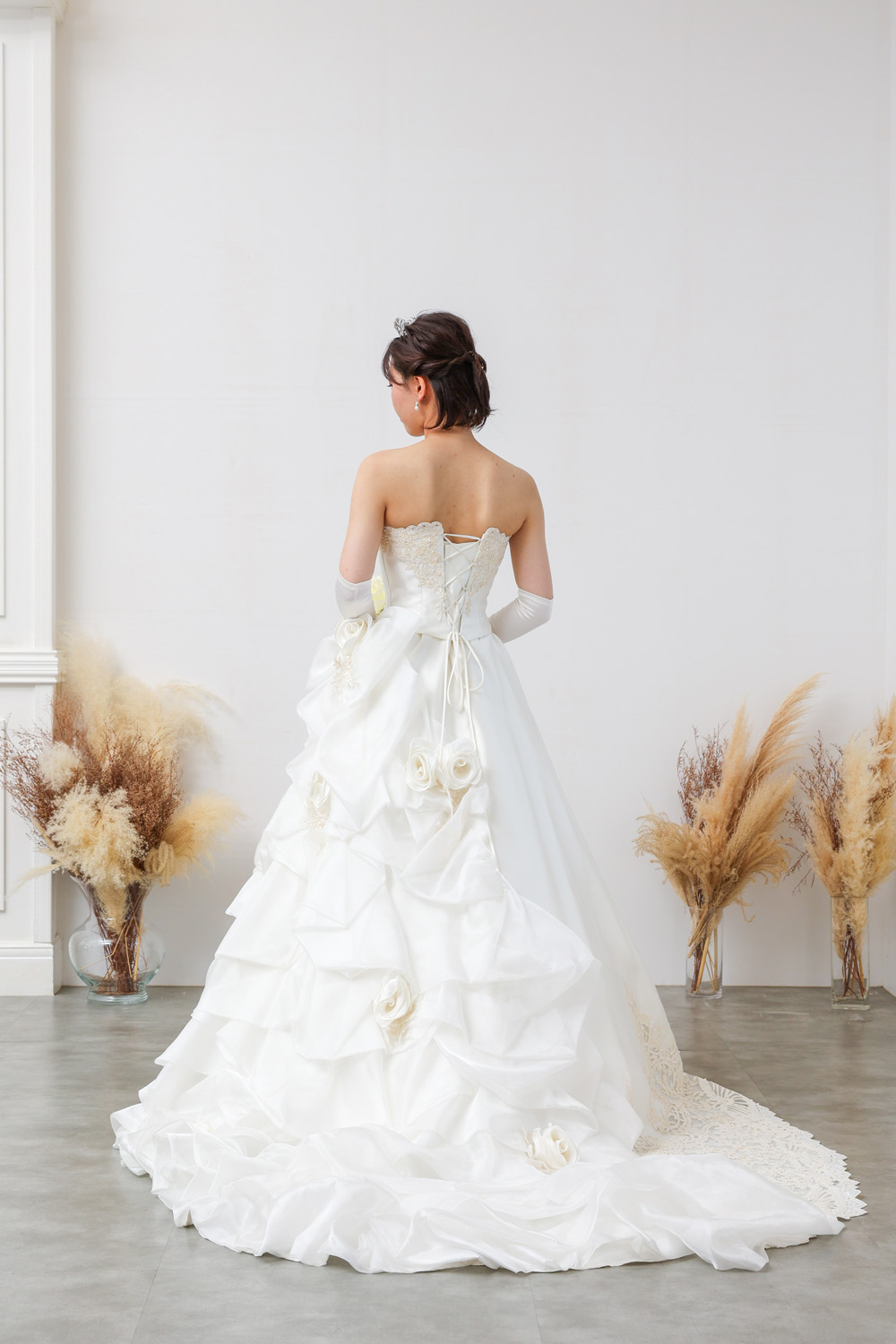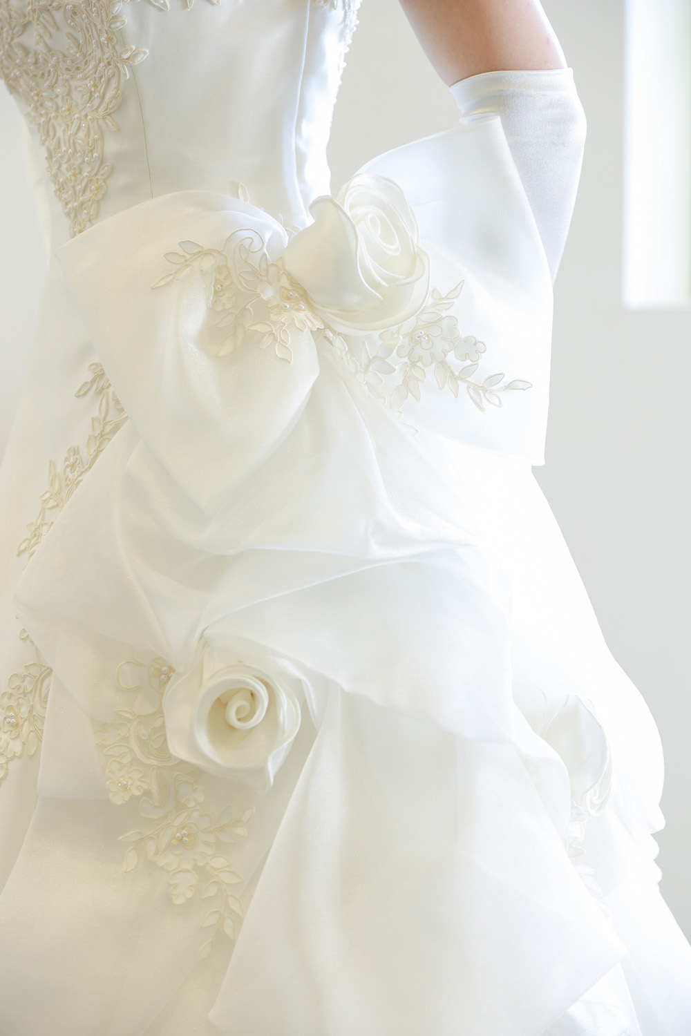 背面にも、ローズや立体フリル、ボウモチーフが贅沢にあしらわれており、どこから見ても華やか。ボリューム感がありながらも軽やかさがあり、後ろ姿にもしっかり気品を感じられる仕上がりです。
