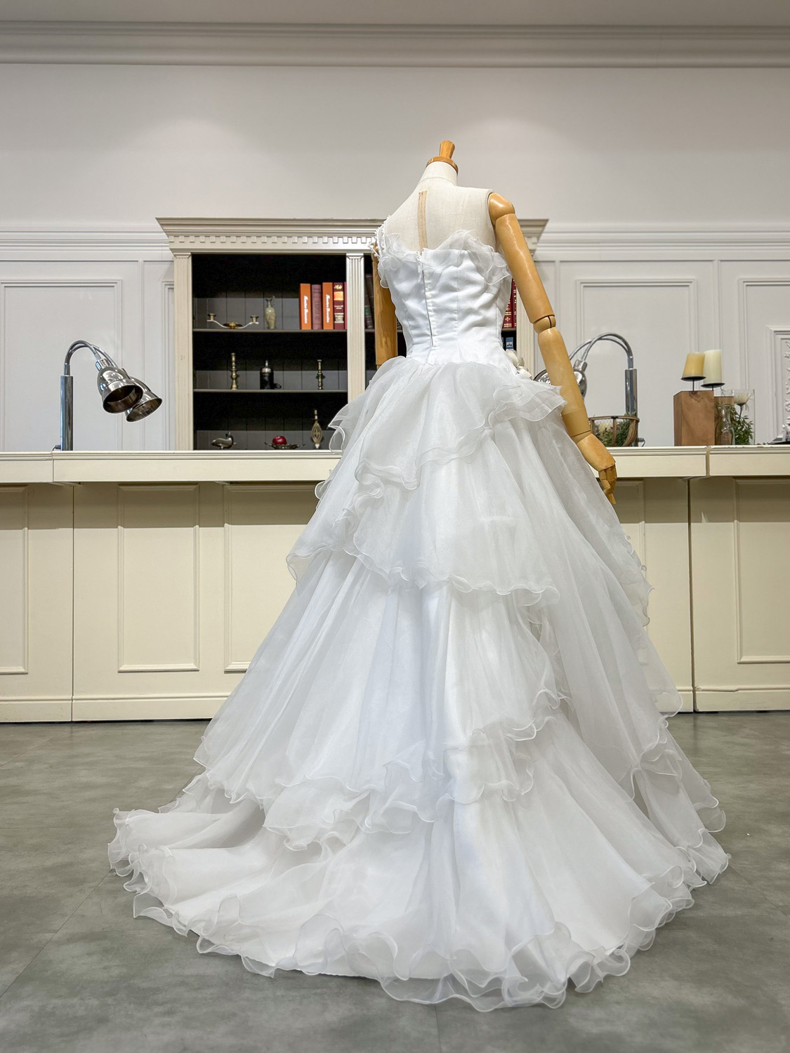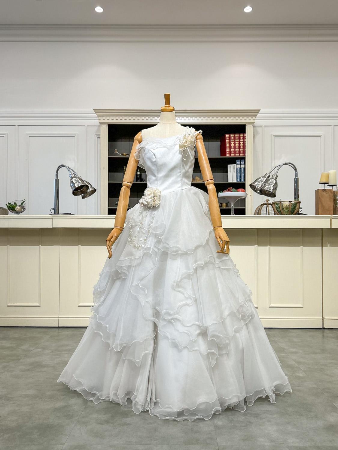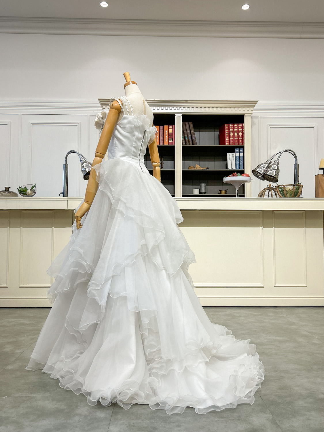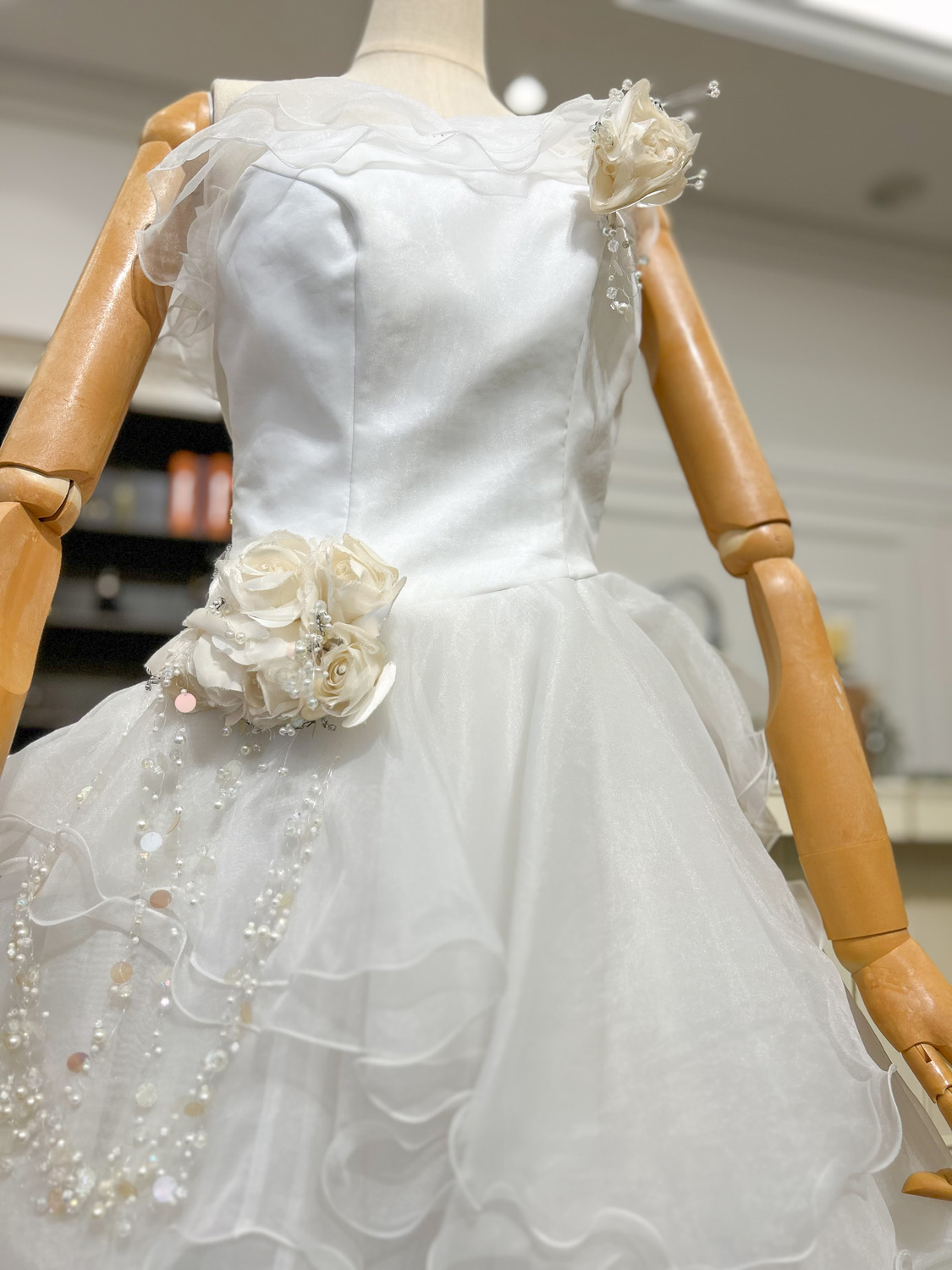 クラシカルな印象の中に個性が光る、ハイネック風の肩付きデザインが特徴的な1着。デコルテを覆う透け感のあるオーガンジーと、胸元からウエストにかけての立体フラワー、繊細なビーズ刺繍が調和し、上品で華やかな印象に仕上がっています。ややハイウエストの切り替えで脚長効果もあり、スタイルアップを叶えてくれるデザイン。スカートには軽やかなオーガンジー素材が幾重にも重なり、歩くたびに柔らかく広がるシルエットが魅力です。後ろ姿はフリルが段状に重なり合い、可憐なボリューム感と動きを演出。程よい長さのトレーンは、チャペルやフォトウェディングでもバランスよく映えます。肩付きのデザインは、クラシカルな雰囲気の挙式やロケーション撮影にもよく合い、他のドレスとはひと味違う印象を残したい花嫁様にぴったり。背中は編み上げ仕様となっており、サイズの微調整がしやすく、フィット感の高い着用が可能です。