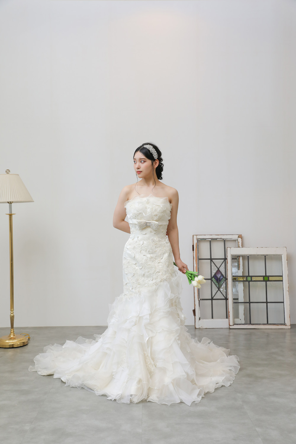 ウエストからヒップにかけてはフィット感を出しつつ、裾に向かって柔らかく広がるラインが、歩く姿も写真も美しく見せてくれます。動きやすく軽やかなので、前撮りやロケーションフォトにもぴったり。