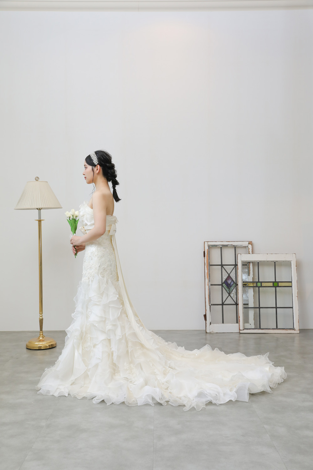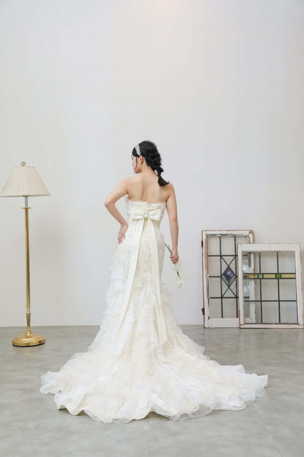 バックスタイルはトレーンが長すぎず、扱いやすさと写真映えを両立。ドレープのある後ろ姿が柔らかさを引き出してくれ、チャペルや自然光のスタジオなど、幅広いシーンで着映えするデザインです。