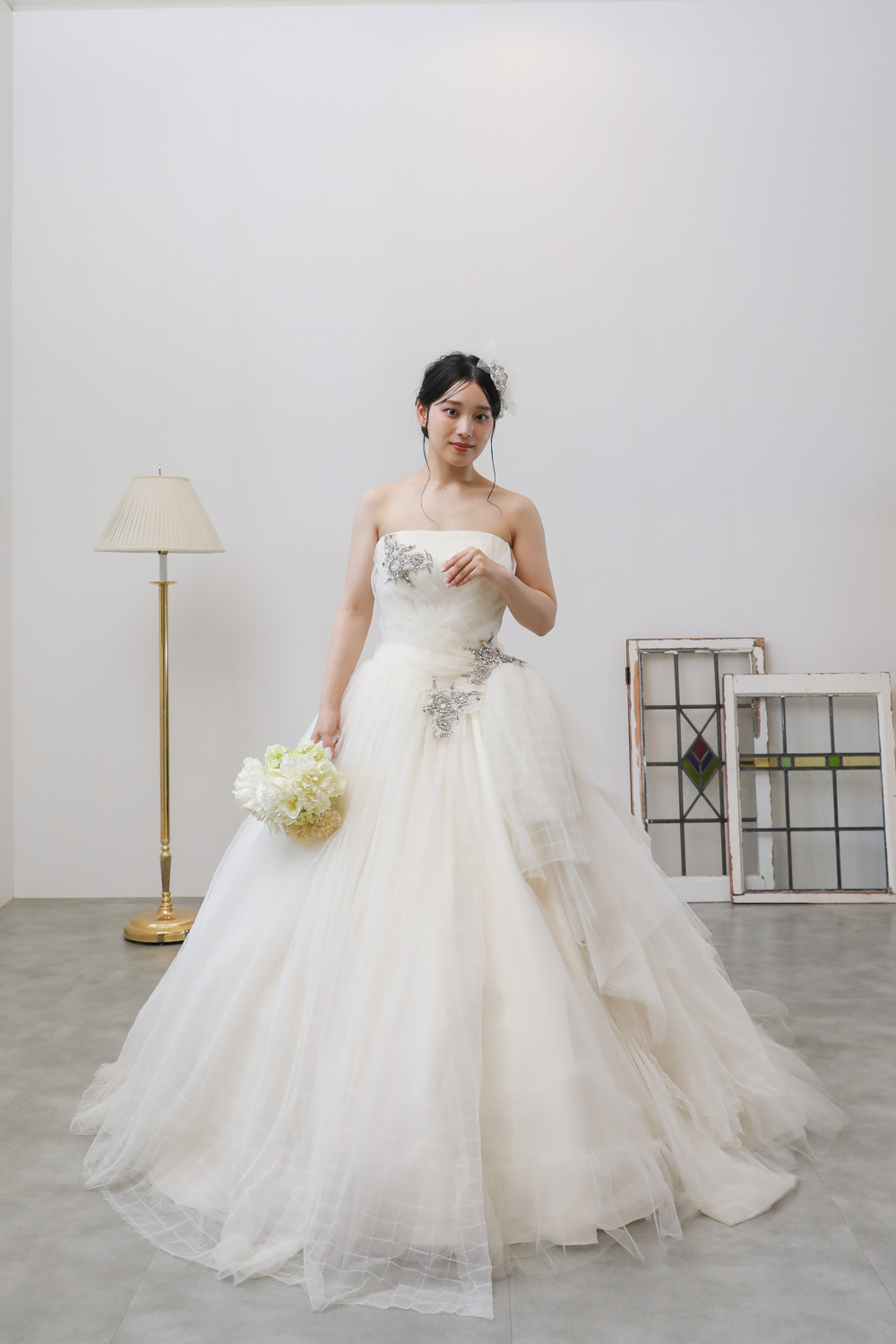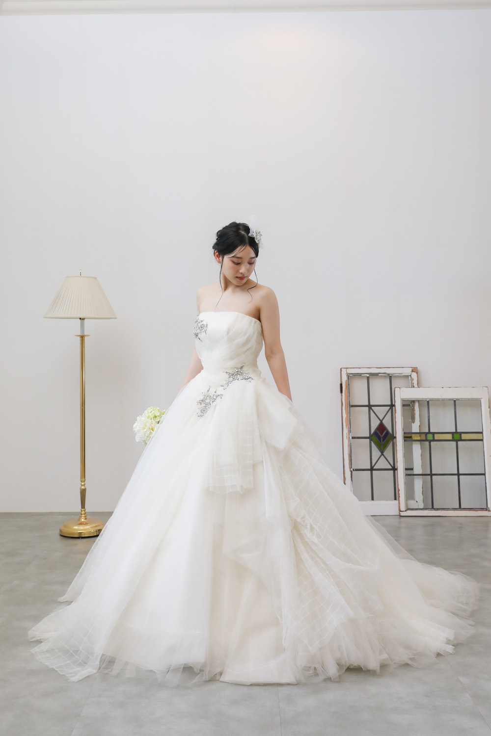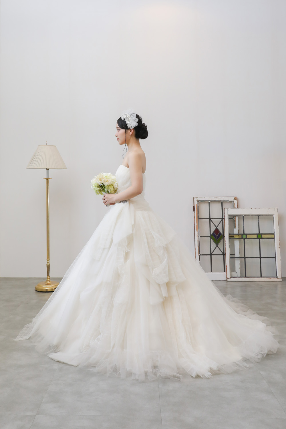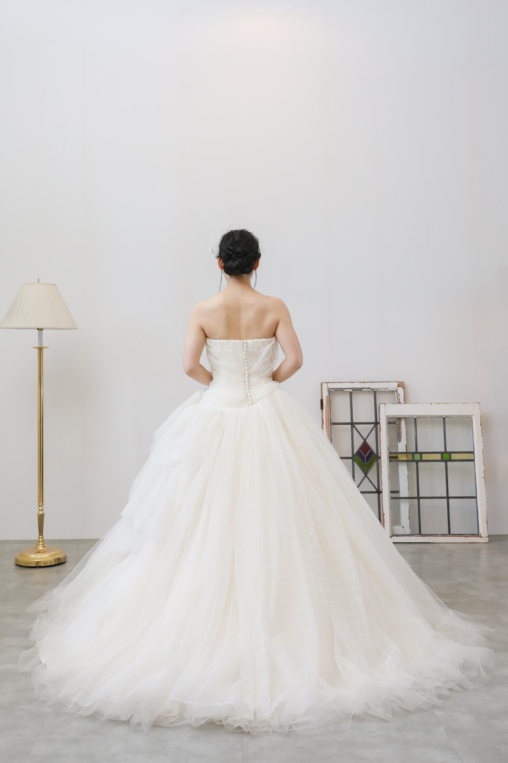 スカート部分は、何層にも重ねたチュールとタフタが自然な広がりをつくり、後ろ姿まで優美に演出します。