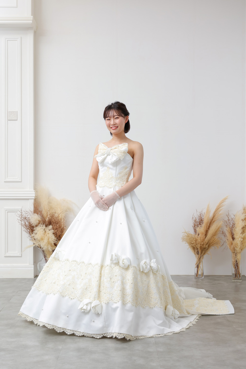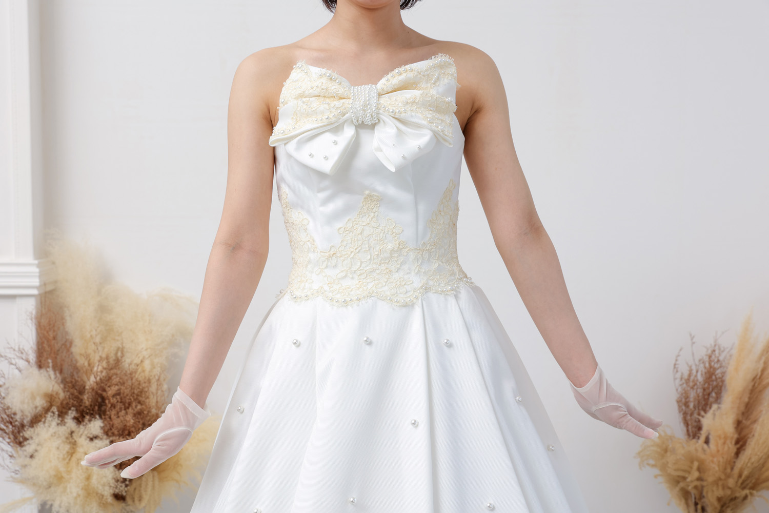胸元には立体的なサテンの大きなリボンモチーフを配置。