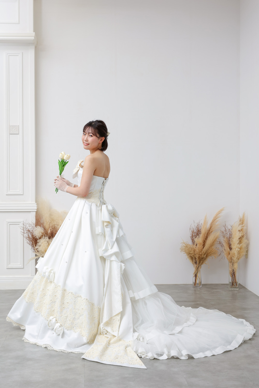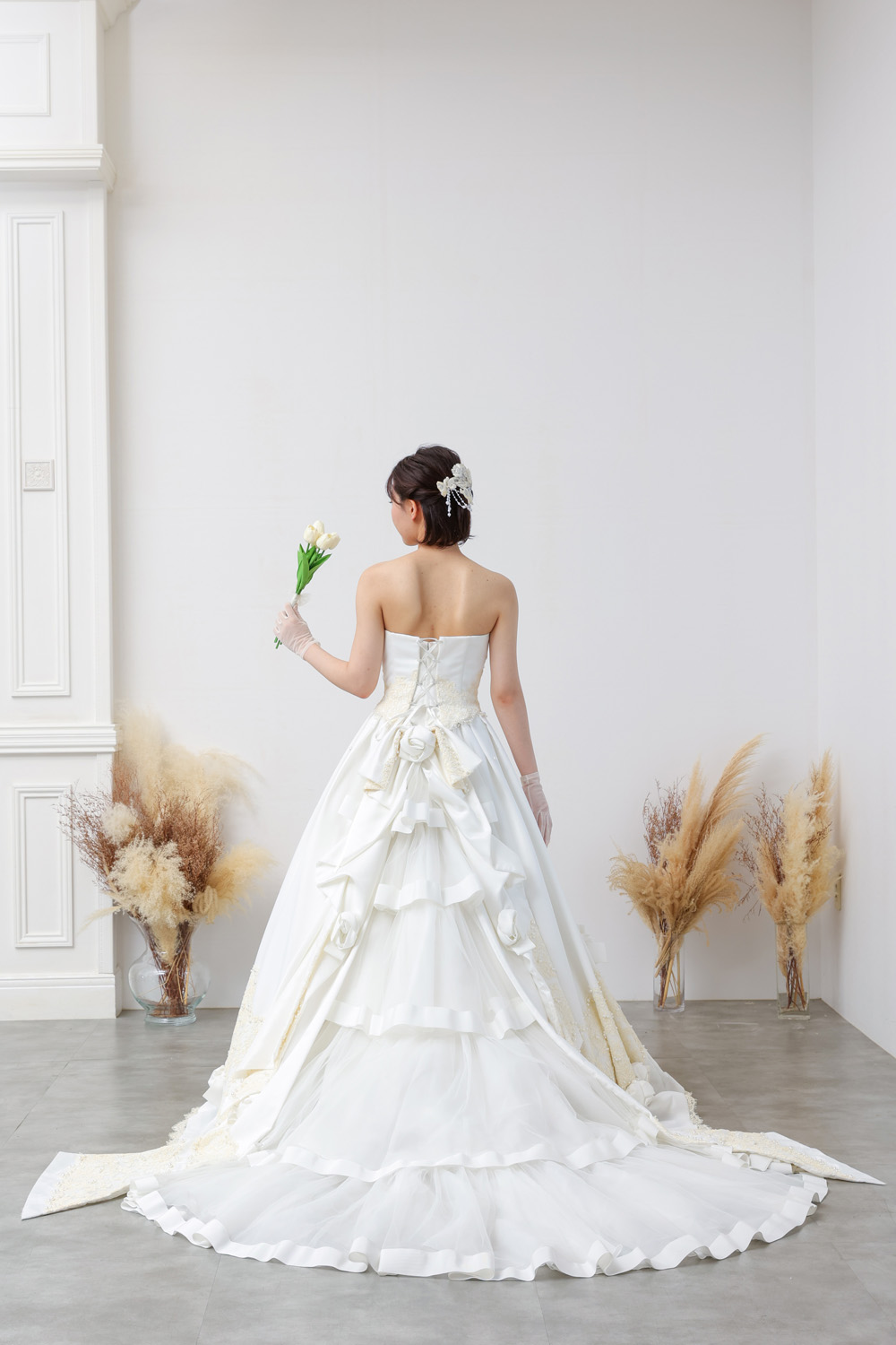バックスタイルには、リボンのデザインを引き継いだような立体フリルのアレンジが施されており、後ろ姿まで華やか。トレーンの長さも程よく、前撮り・チャペル・ガーデンなど幅広いシーンに対応できます。