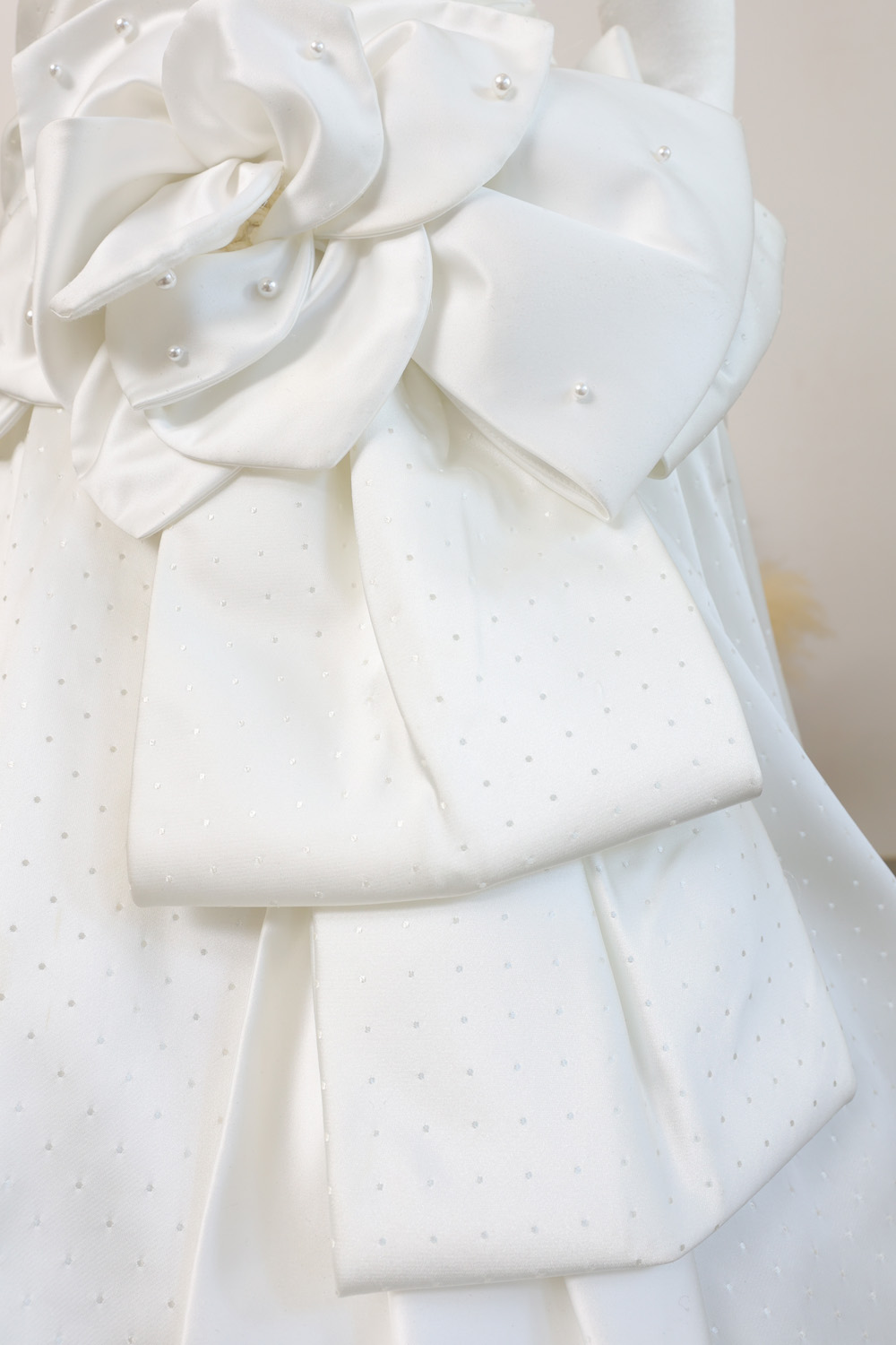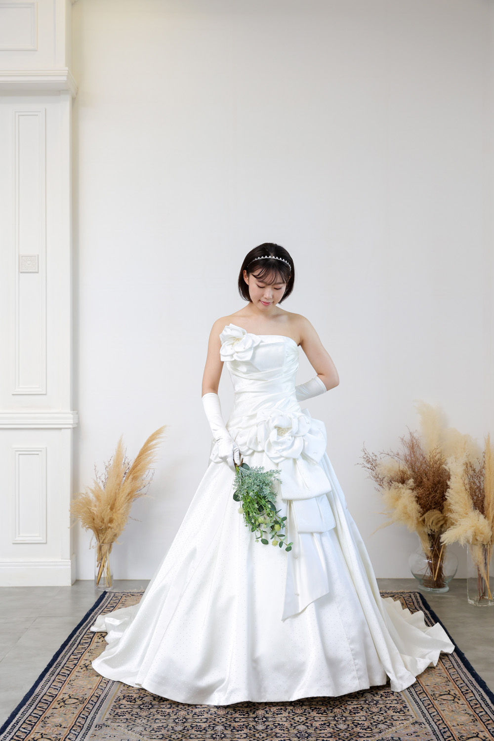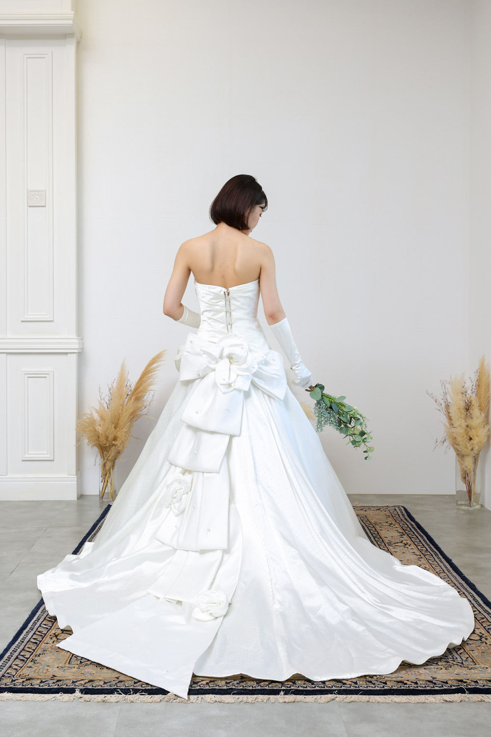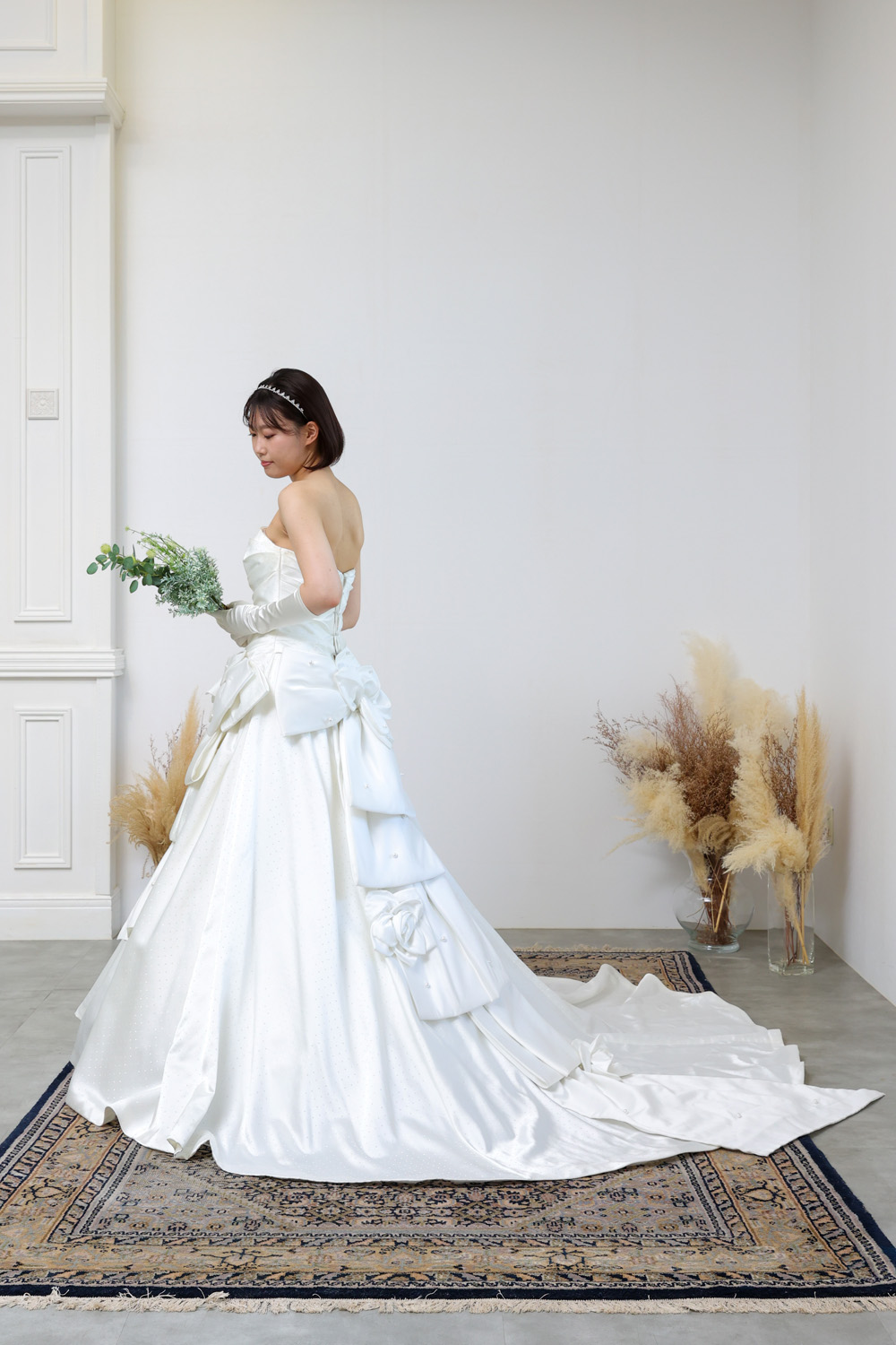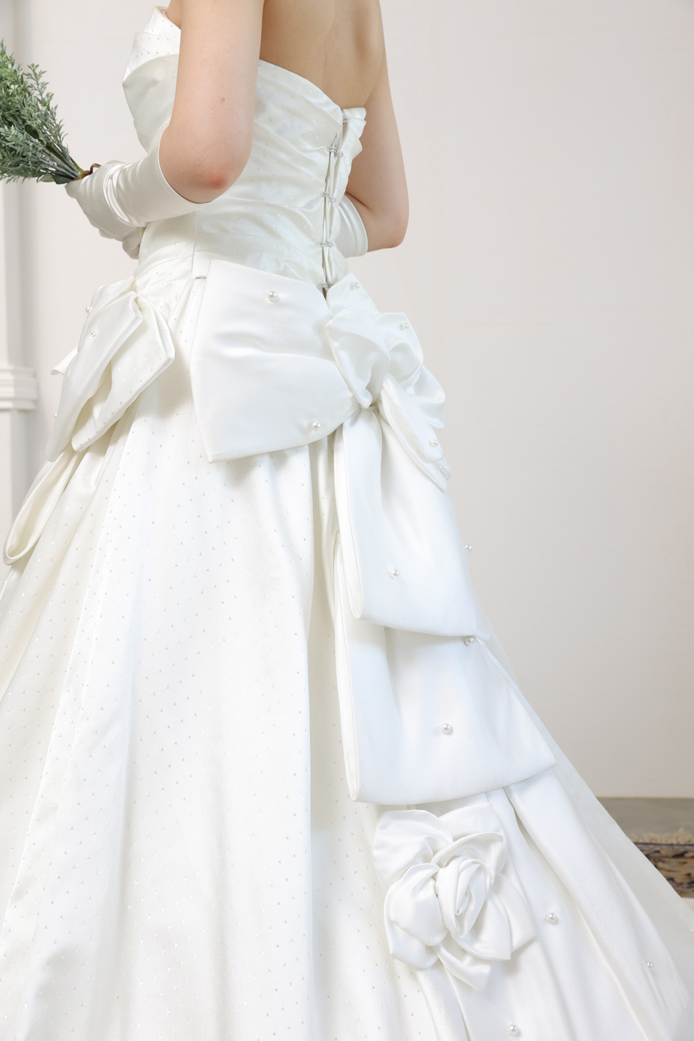 立体感のあるフリルと大ぶりなリボンが目を引く、華やかな存在感を放つ1着。ハリのある上質なサテン素材を使用し、上品な光沢と美しいシルエットを実現しています。胸元にはドレープとフリルをあしらい、視線を上に集めることでスタイルアップ効果も。ウエスト部分からスカートにかけて施されたアシンメトリーなデザインが、洗練された個性を演出しながらも、正統派の美しさをしっかりキープ。バックスタイルにはいくつもの大きなリボンモチーフが重なり合い、360度どこから見ても華やかさと可憐さを兼ね備えています。リボンにはさりげなくドット模様が施され、細部にまでこだわった遊び心のあるディテールも魅力。トレーンも長すぎず、チャペルはもちろんガーデンやレストランウェディングにもよく映えるデザインです。背中は編み上げ仕様で、体にぴったりとフィットしやすく、美しい後ろ姿をキープしてくれます。