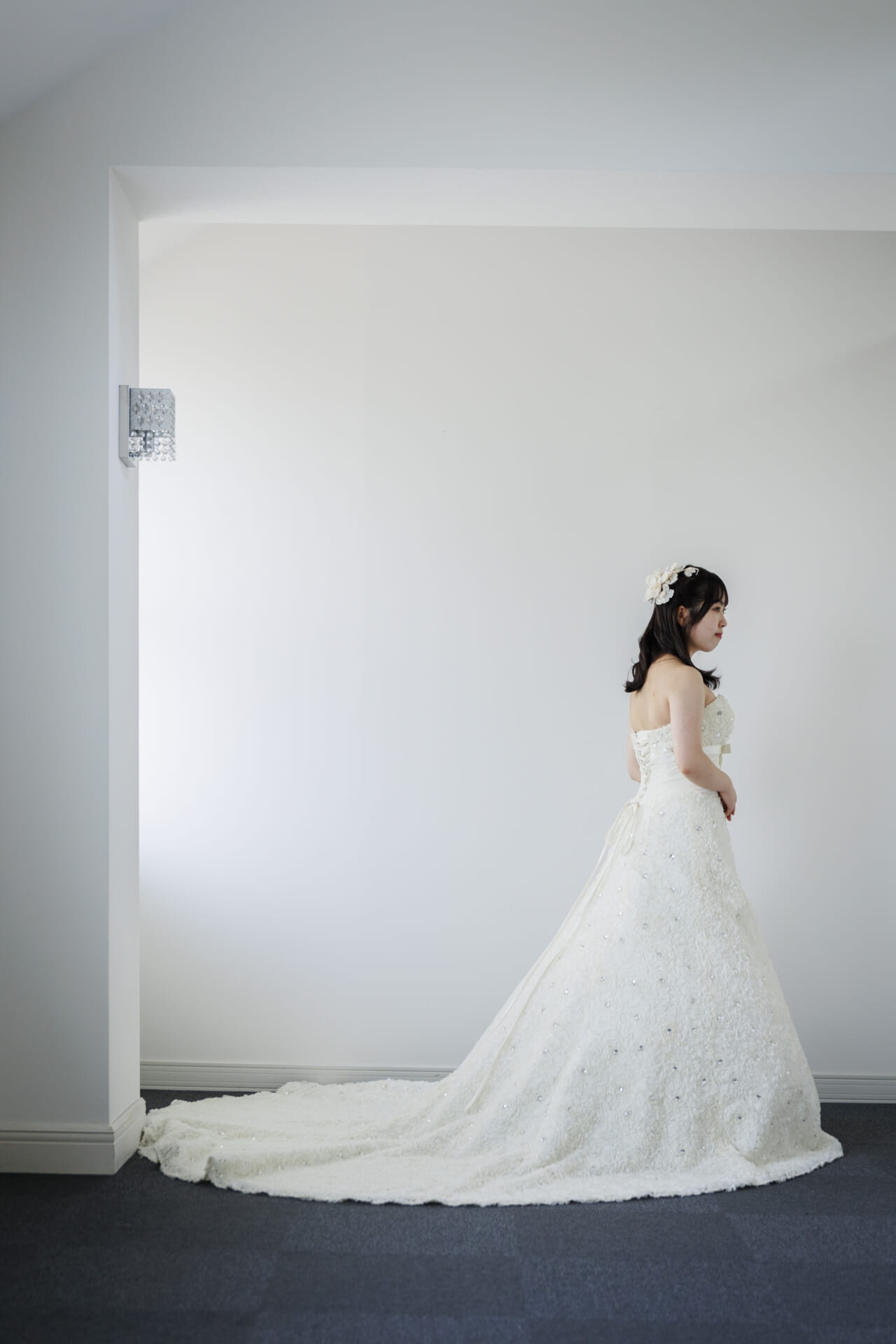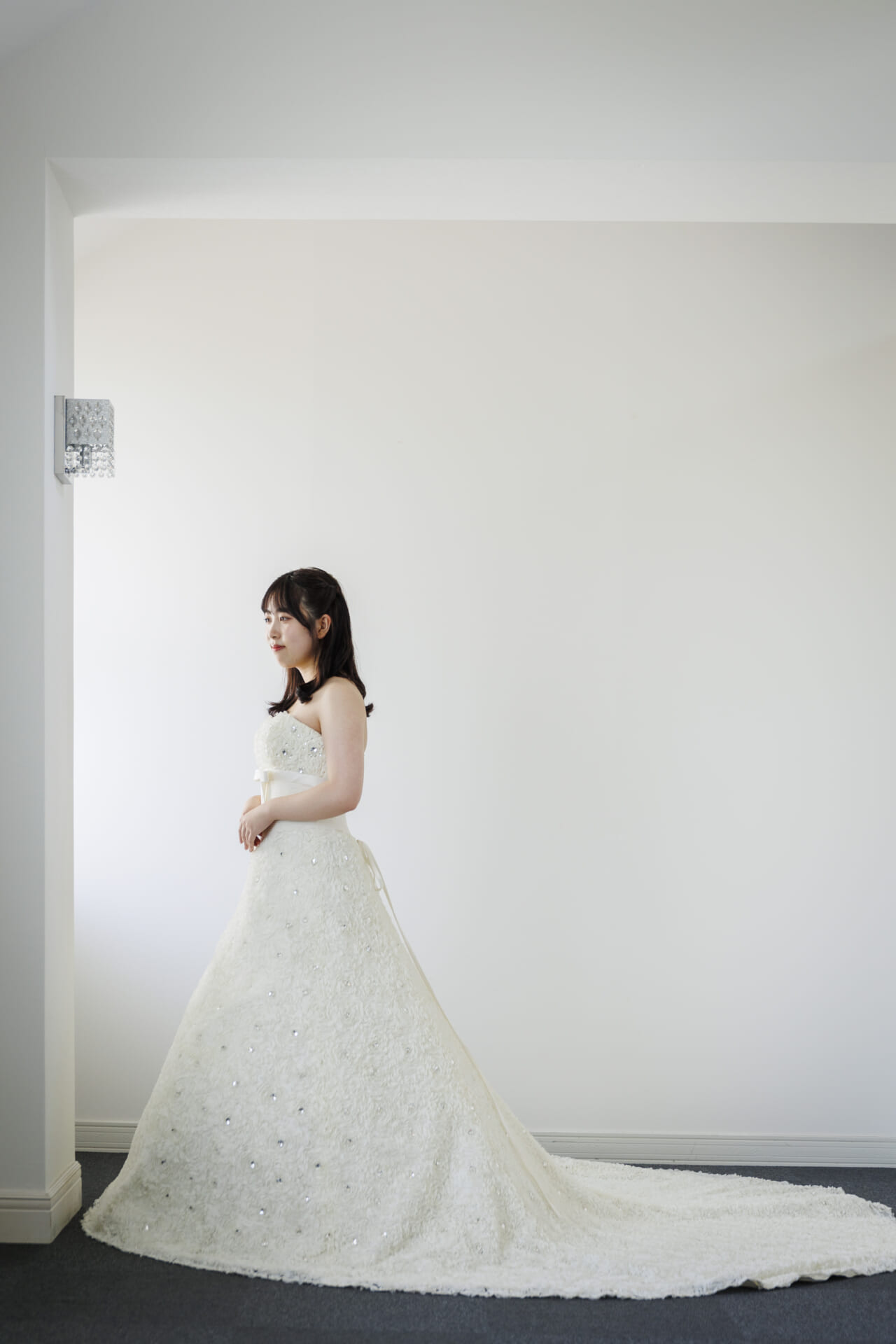 トレーンに向かって緩やかに広がるスカートラインは、ドラマティックなバックスタイルを演出し、挙式シーンやチャペルフォトにもぴったり。シャンタン特有のハリ感が、しっかりとした形を保ちながらも着心地は軽やかで、立ち姿だけでなく歩く姿やターンする瞬間も美しく映えます。写真にも映える立体的なディテールは、前撮りやロケーションフォト、ホテルやゲストハウスでの披露宴にもおすすめです。