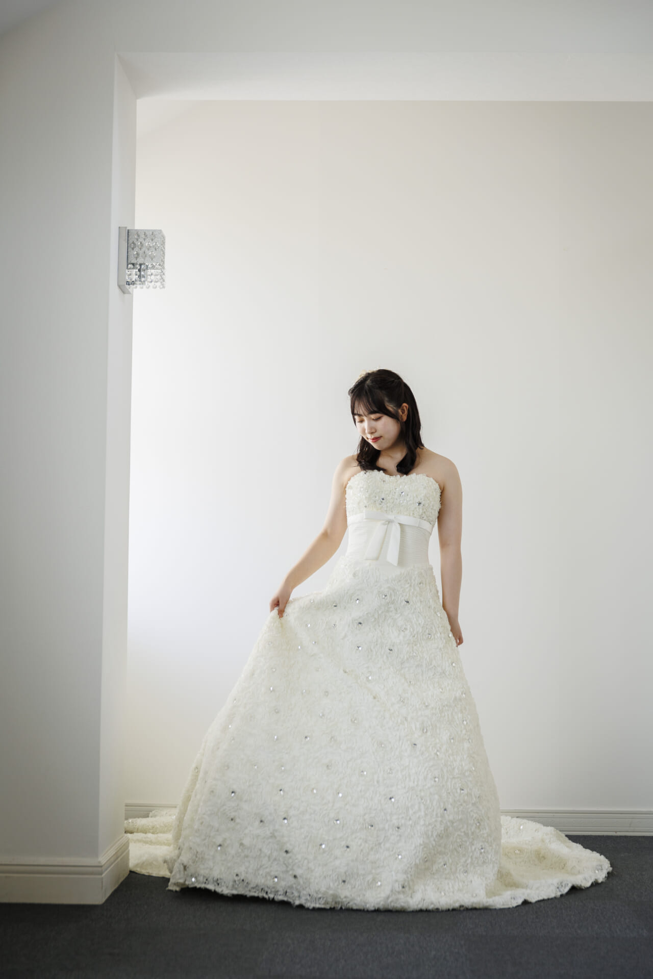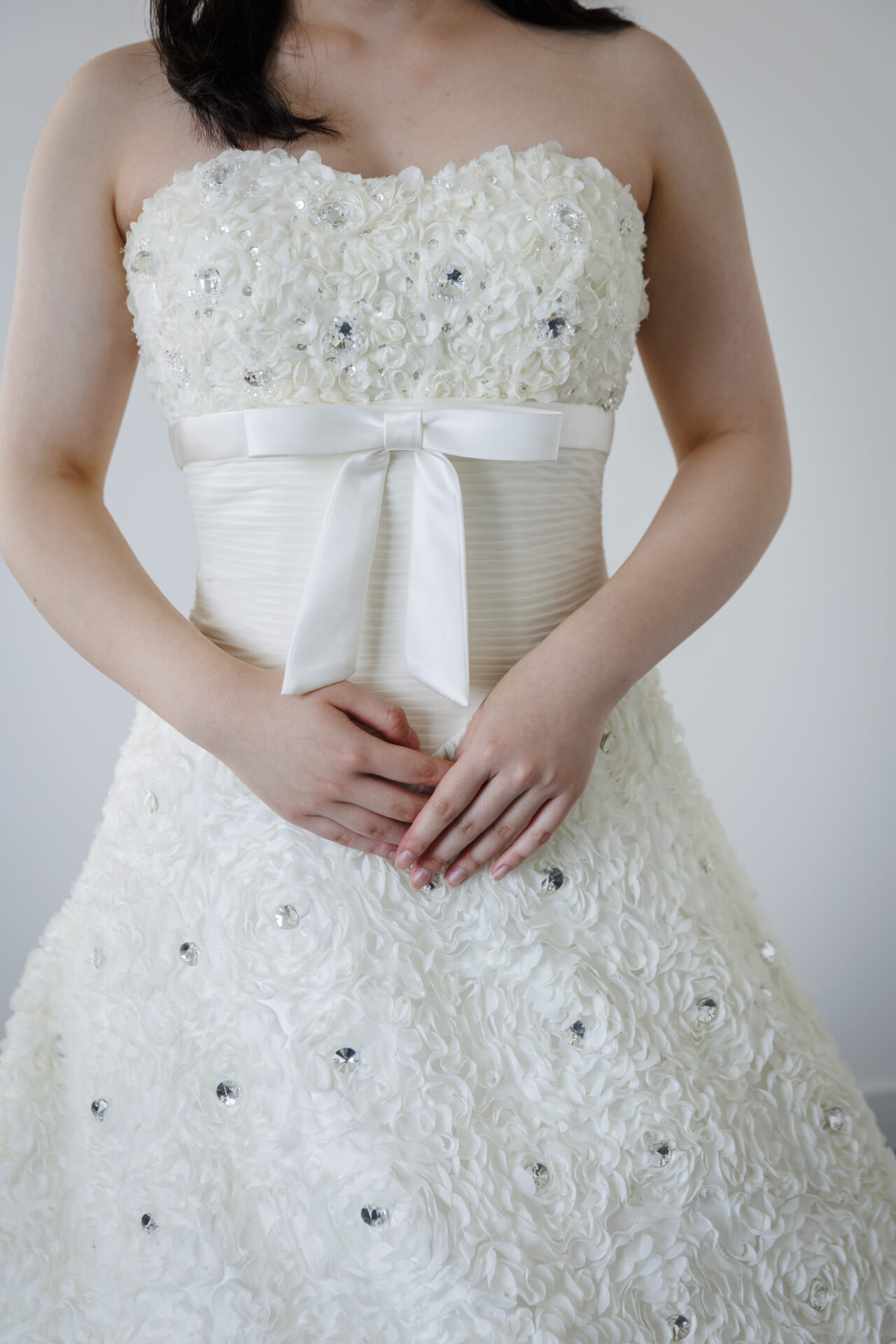 立体的なフラワーモチーフが全身にあしらわれた特別感、ほどよい光沢とハリのある上質なシャンタン素材、美しいAラインシルエット、ビジューの輝きが華やかさをプラス、胸元のボリューム感とリボンが可憐な印象、バックスタイルのトレーンまで華やかに、写真映えと実用性を兼ねた軽やかな着心地、挙式・披露宴・前撮りなど幅広いシーンで活躍できる一着。