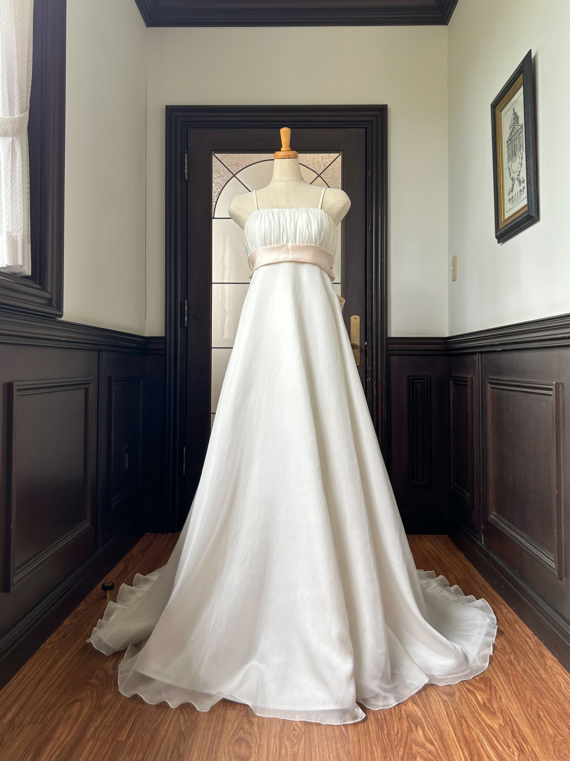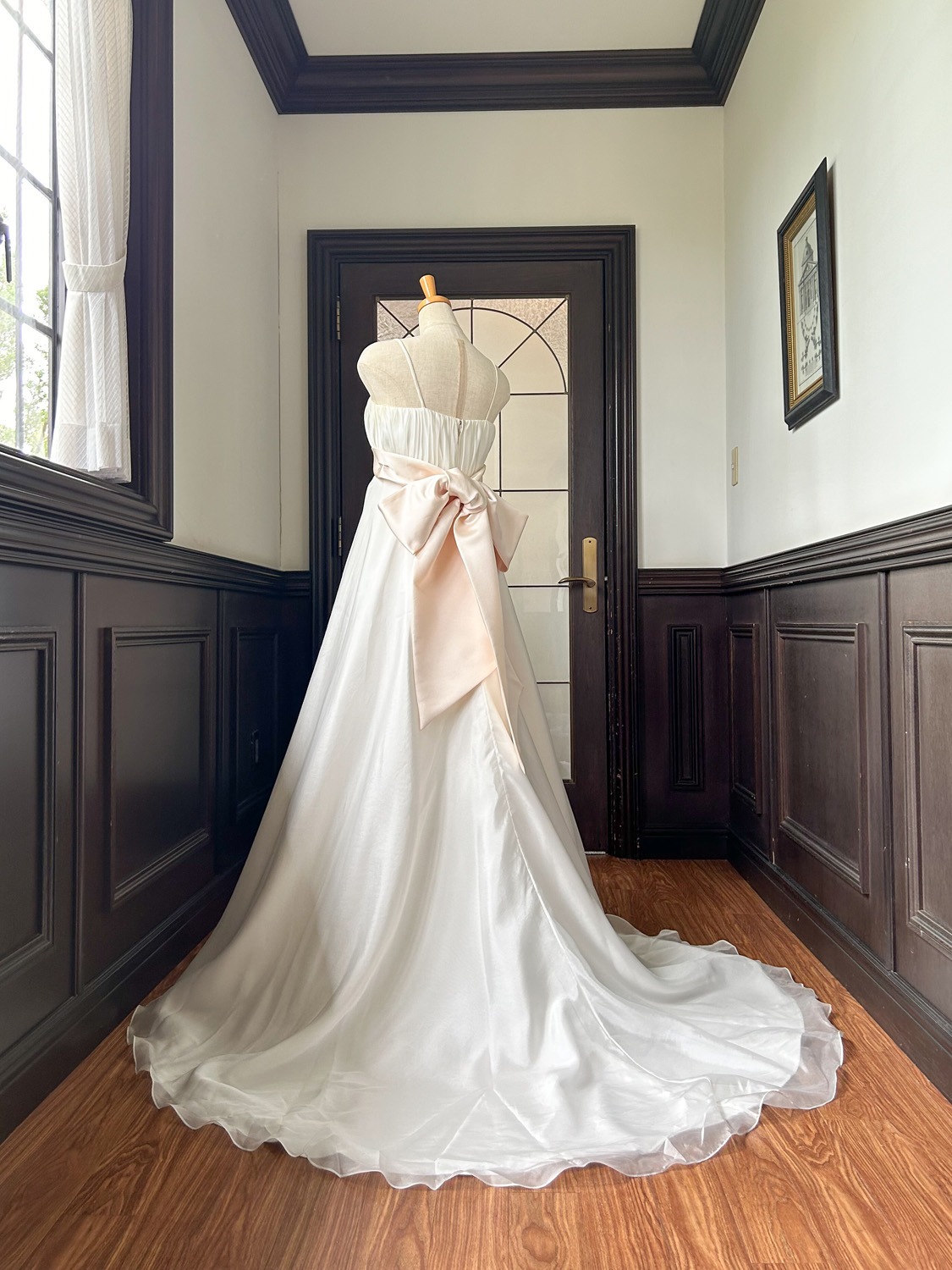 まず目を惹くのは、胸下で切り替えたエンパイアラインの美しいシルエット。
