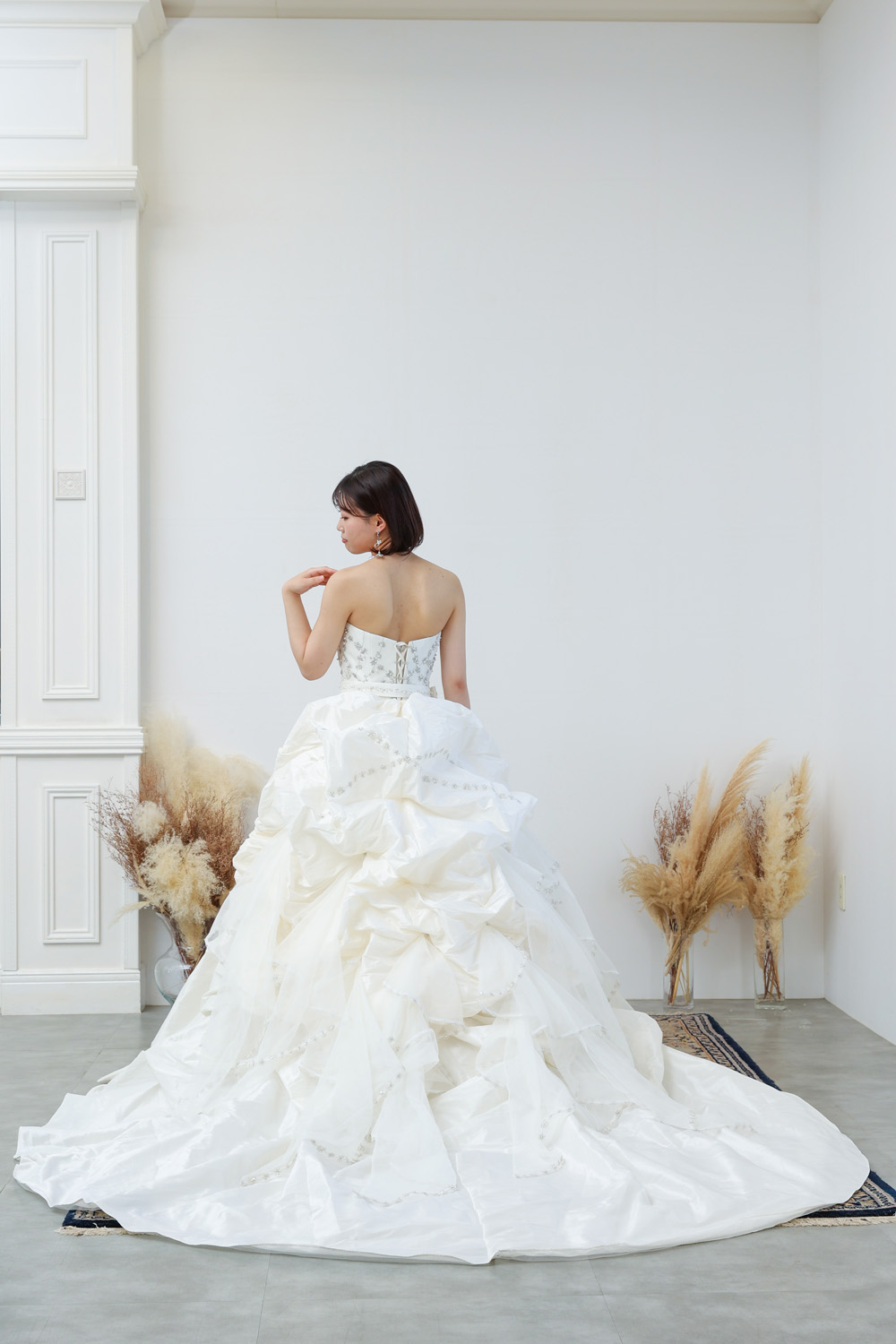 背中からトレーンへと続く流れるようなフリルは、後ろ姿に豊かな立体感を与え、バージンロードや階段でのシーンをより印象的に彩ります。特に挙式の入場や披露宴のお色直し、前撮り撮影など幅広いシーンで映えるデザインで、花嫁を誰よりも華やかに見せてくれる一着です。しっかりとした生地感がシルエットを美しく保ちつつも、柔らかな光沢が女性らしい優しさをプラス。ウエストラインを自然に引き締め、どの角度から見てもエレガントに見える構築的なデザインは、アンテプリマならではの計算された美しさを感じさせます。