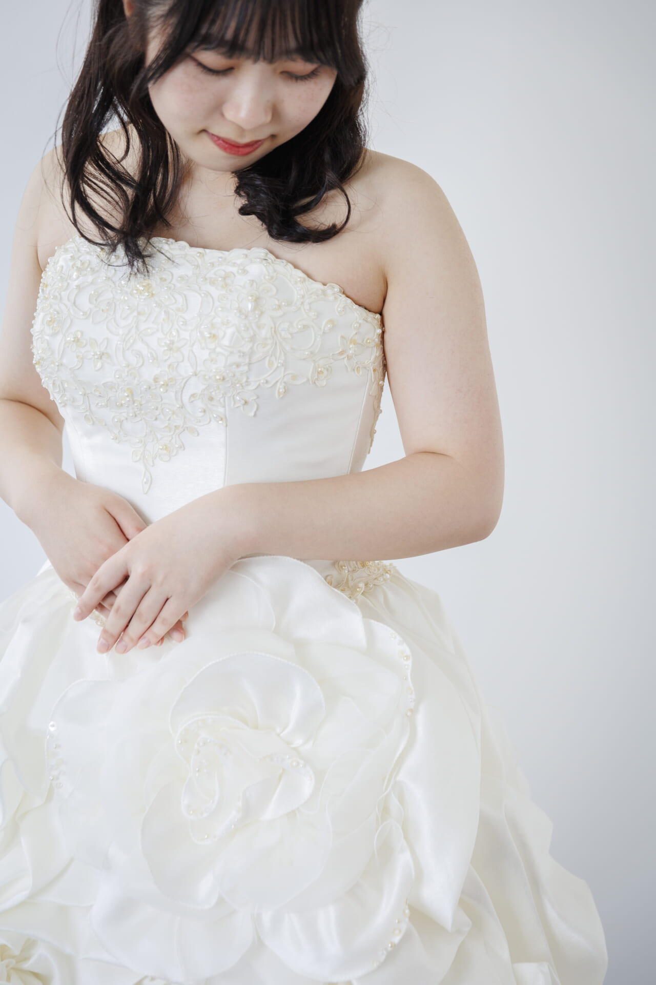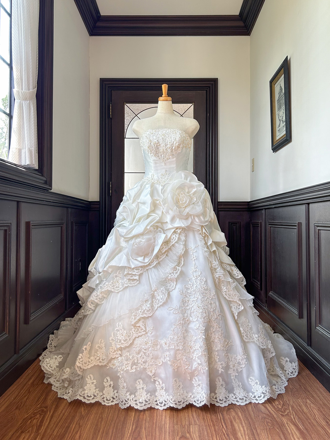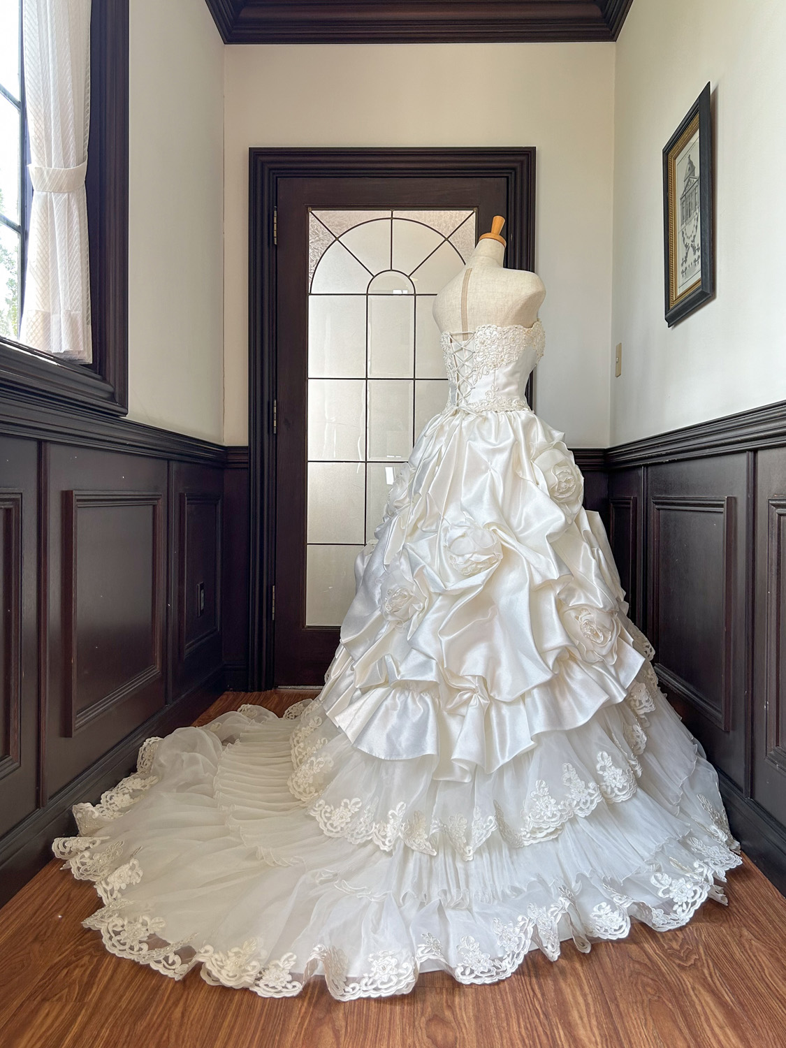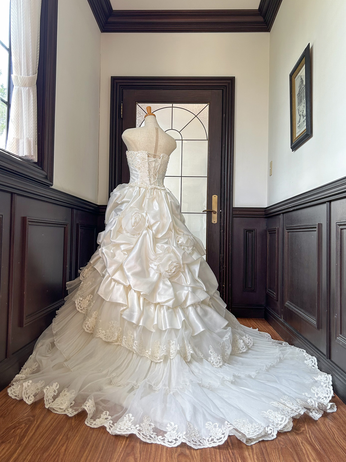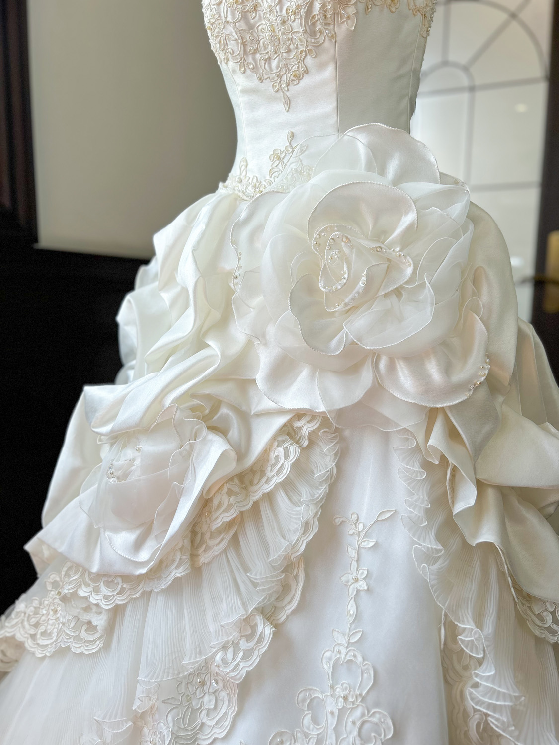 幾重にも重なるラッフルと、大輪のフラワーモチーフが目を引く、華やかでロマンティックなプリンセスラインドレス。スカート全体には繊細なレースをふんだんに使用し、細部にまでこだわったディテールが花嫁の美しさを引き立てます。ハリのある素材と柔らかなチュールを組み合わせることで、動きのある立体的なシルエットを実現。胸元は立体的なカッティングでデコルテをきれいに見せ、上品さと華やかさを両立させたビスチェデザインに仕上げられています。ウエストからヒップにかけて広がるアシンメトリーなフリルは、動きに合わせて美しく揺れ、どの角度から見ても絵になる存在感。バックスタイルには大きなフラワーモチーフがあしらわれ、後ろ姿にも抜かりない華やかさを演出。裾まわりのスカラレースも贅沢で、チャペルやホテル挙式はもちろん、クラシカルなロケーション撮影にも映える一着です。背中は編み上げ仕様で、サイズ調整がしやすく、体にフィットさせて美しいラインを保てます。
