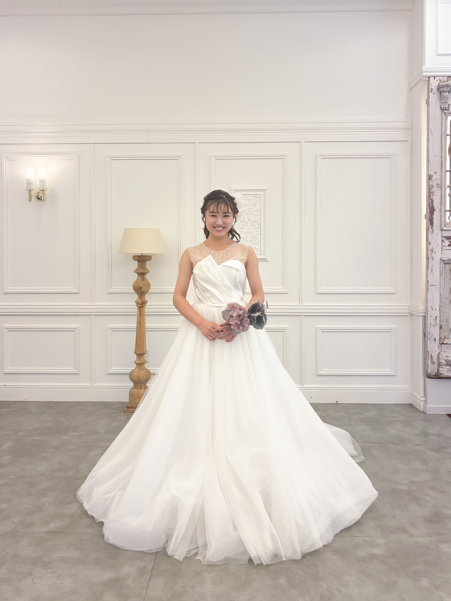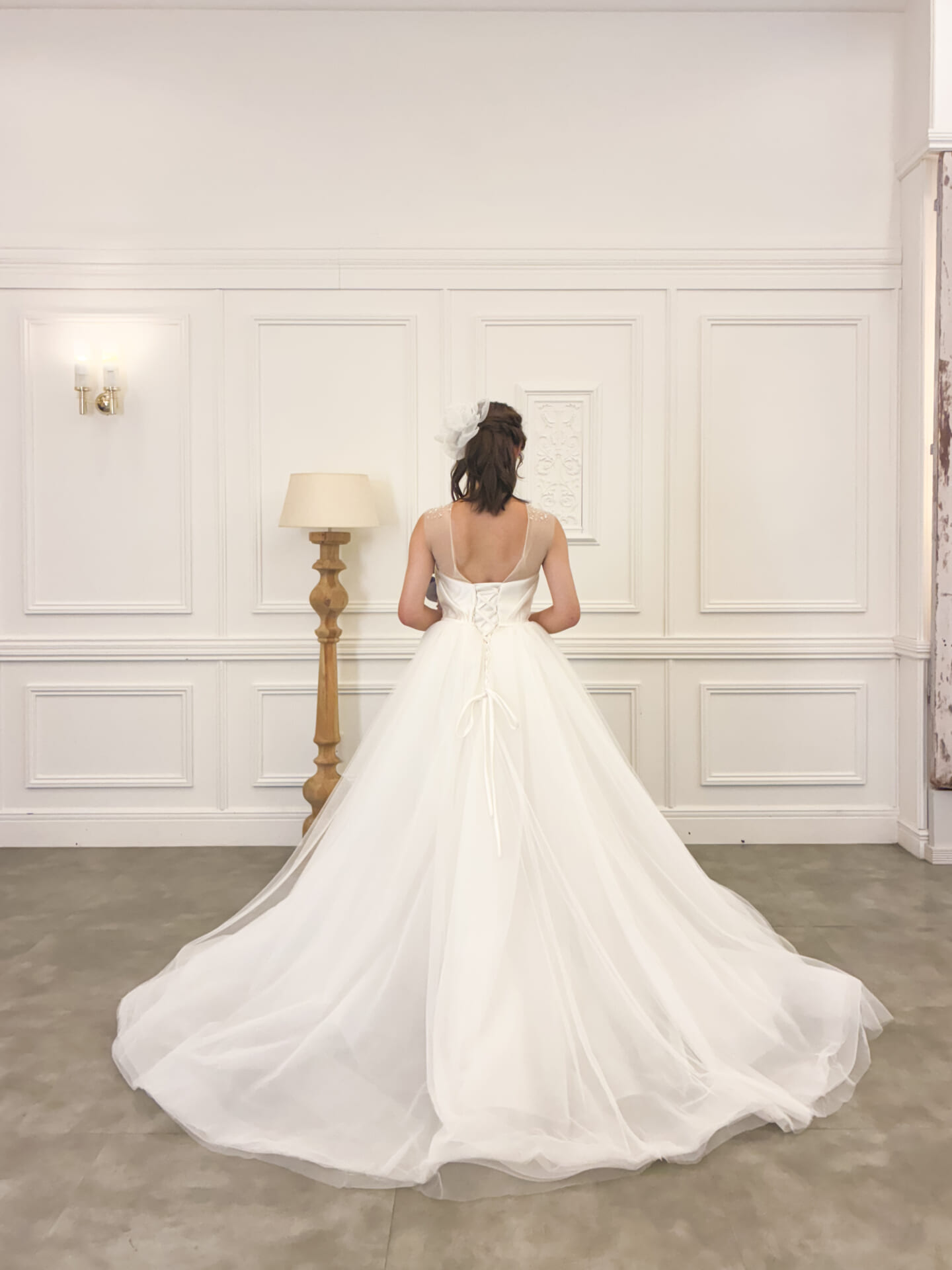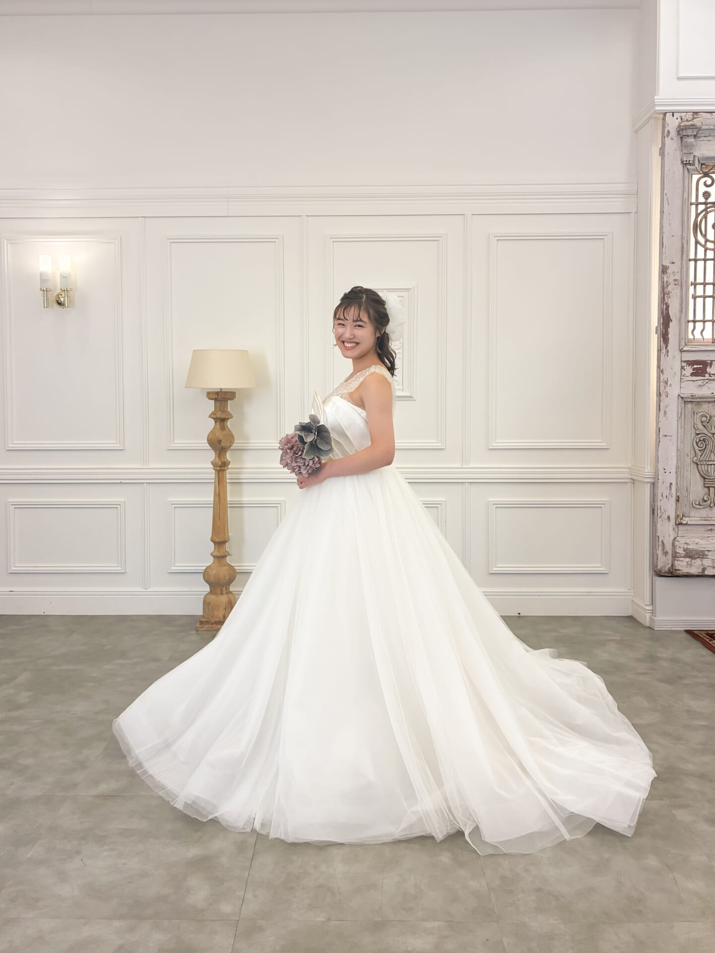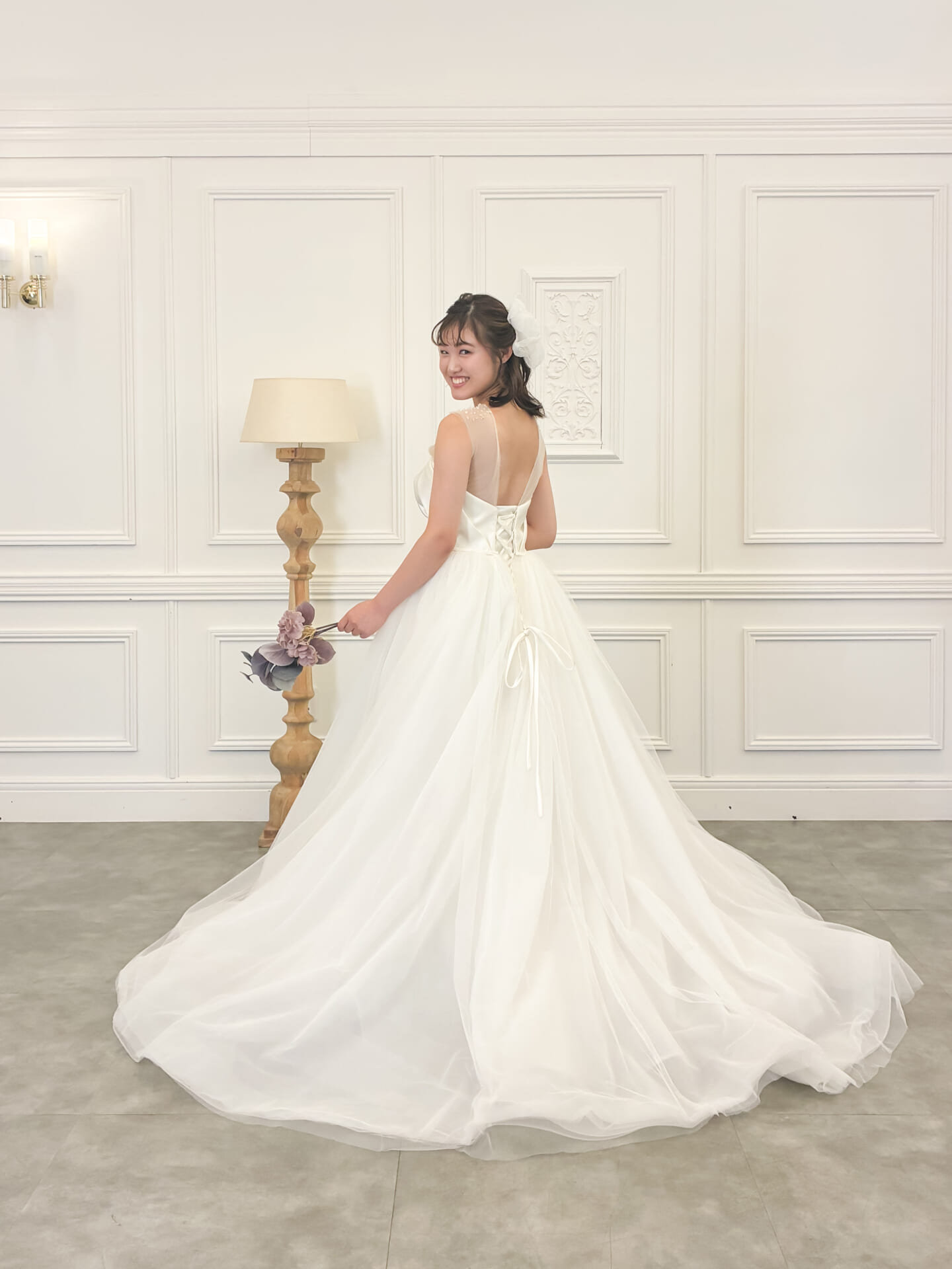 トレーンは程よい長さで、上品さと歩きやすさを兼ね備えている点も嬉しいポイント。動きのあるシーンでも扱いやすく、さまざまなウェディングスタイルにフィットします。