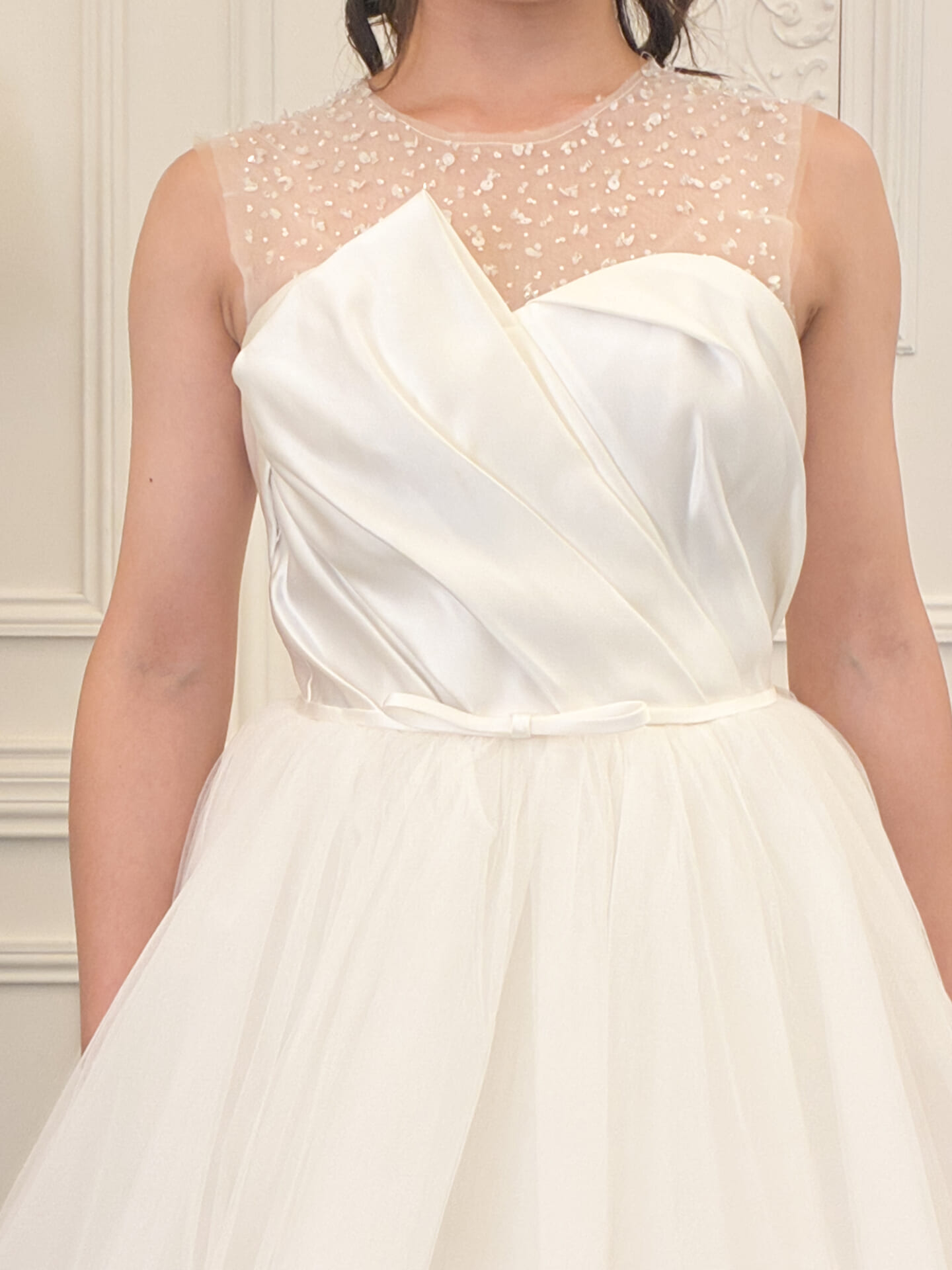 印象的なのは、胸元から肩にかけての透け感あるチュール。細かなパールが散りばめられたデザインは、まるでナイトスカイに星が瞬いているかのような繊細な美しさ。ビスチェスタイルが苦手な方や、露出を抑えたい方にもおすすめできる安心感のあるデザインです。