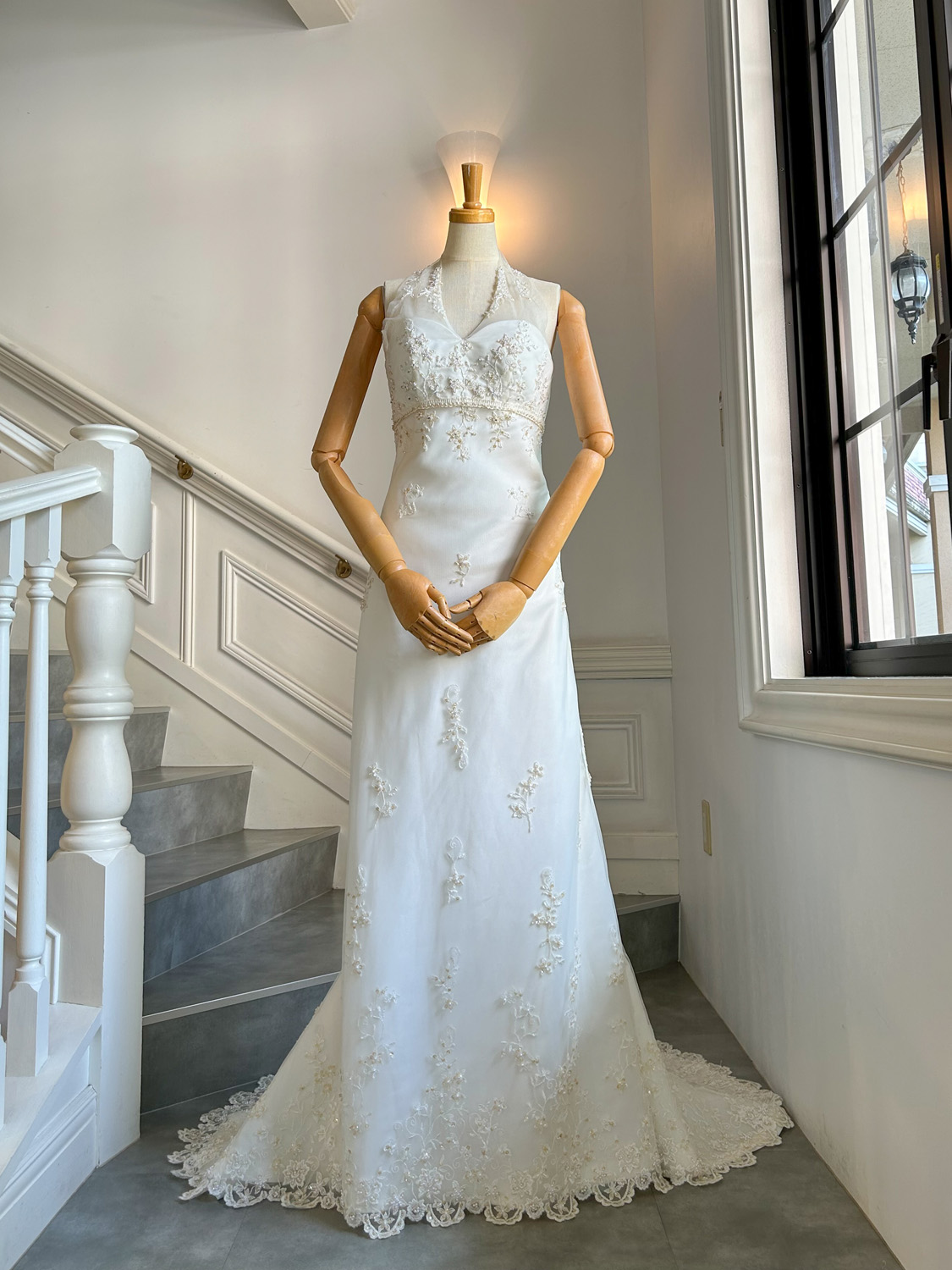 このドレスは、繊細なレースと刺繍で魅せる、品格あるスレンダーラインの一着です。