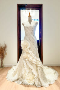 そして背中から流れるトレーンには、繊細なフラワーレースが全面に広がり、まるで刺繍のベールをまとっているかのような優雅さを演出。大きな装飾に頼らず、レースそのものの美しさで魅せる設計だから、品格と洗練された印象が残ります。