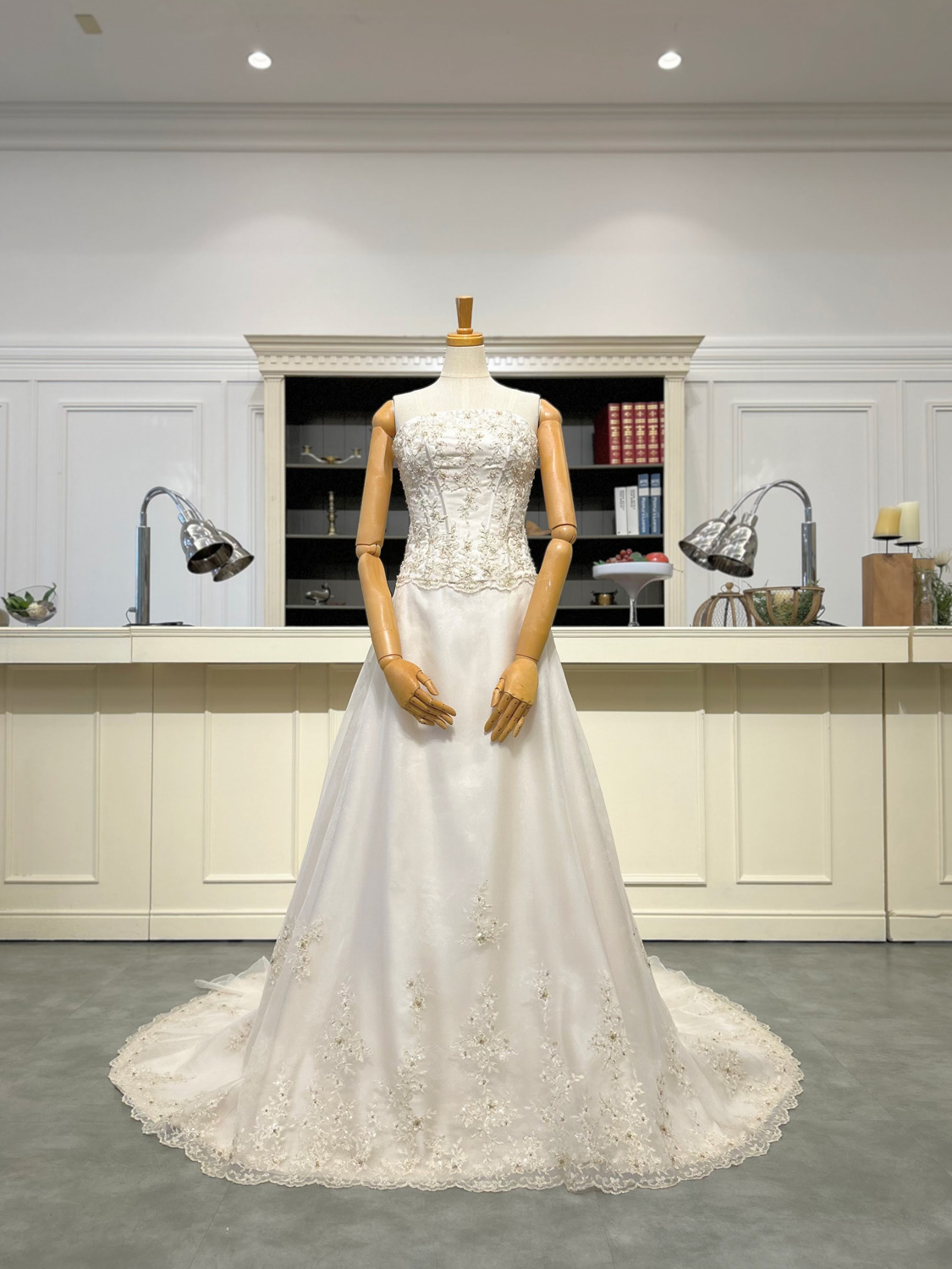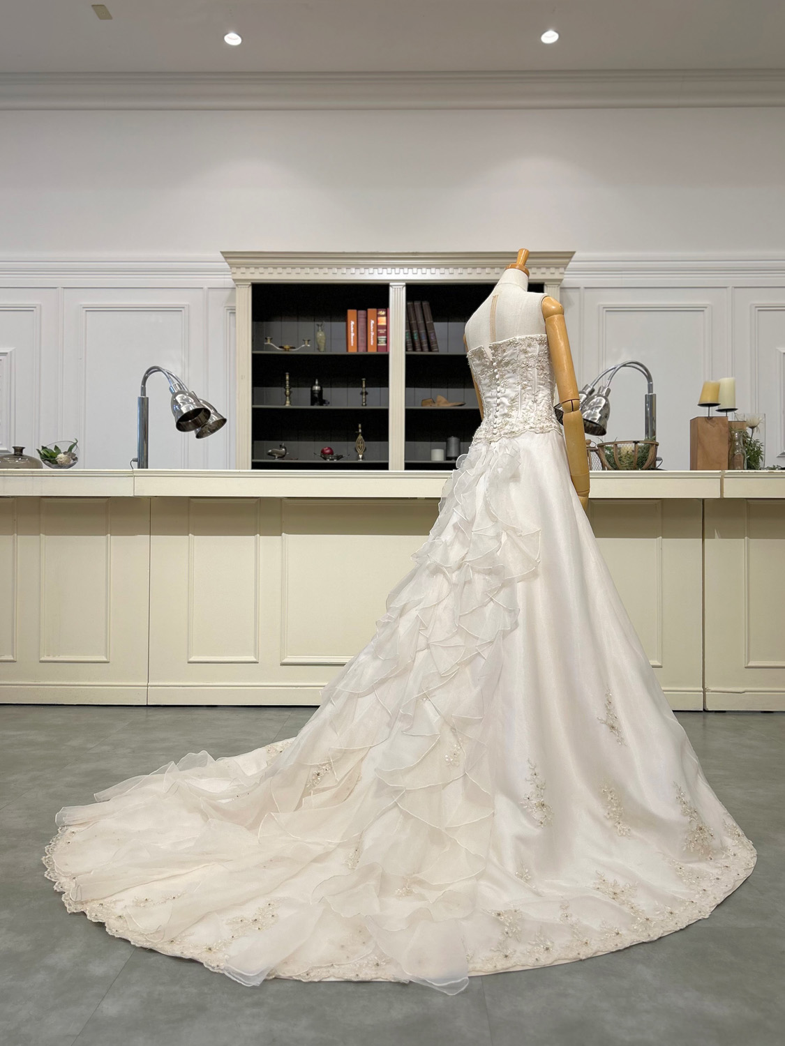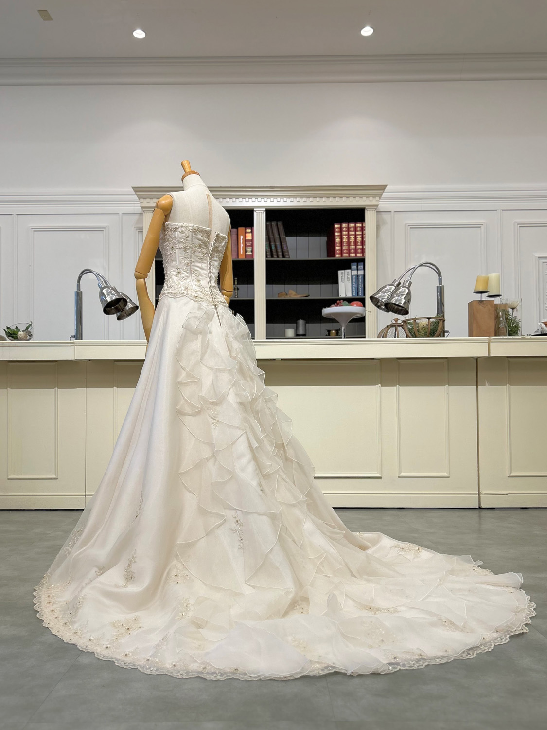 バックスタイルには、立体的なフリルと控えめなトレーンが優雅さを添えます。