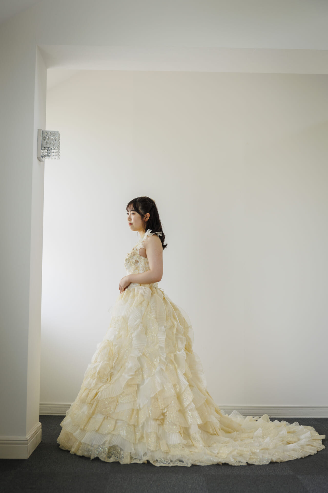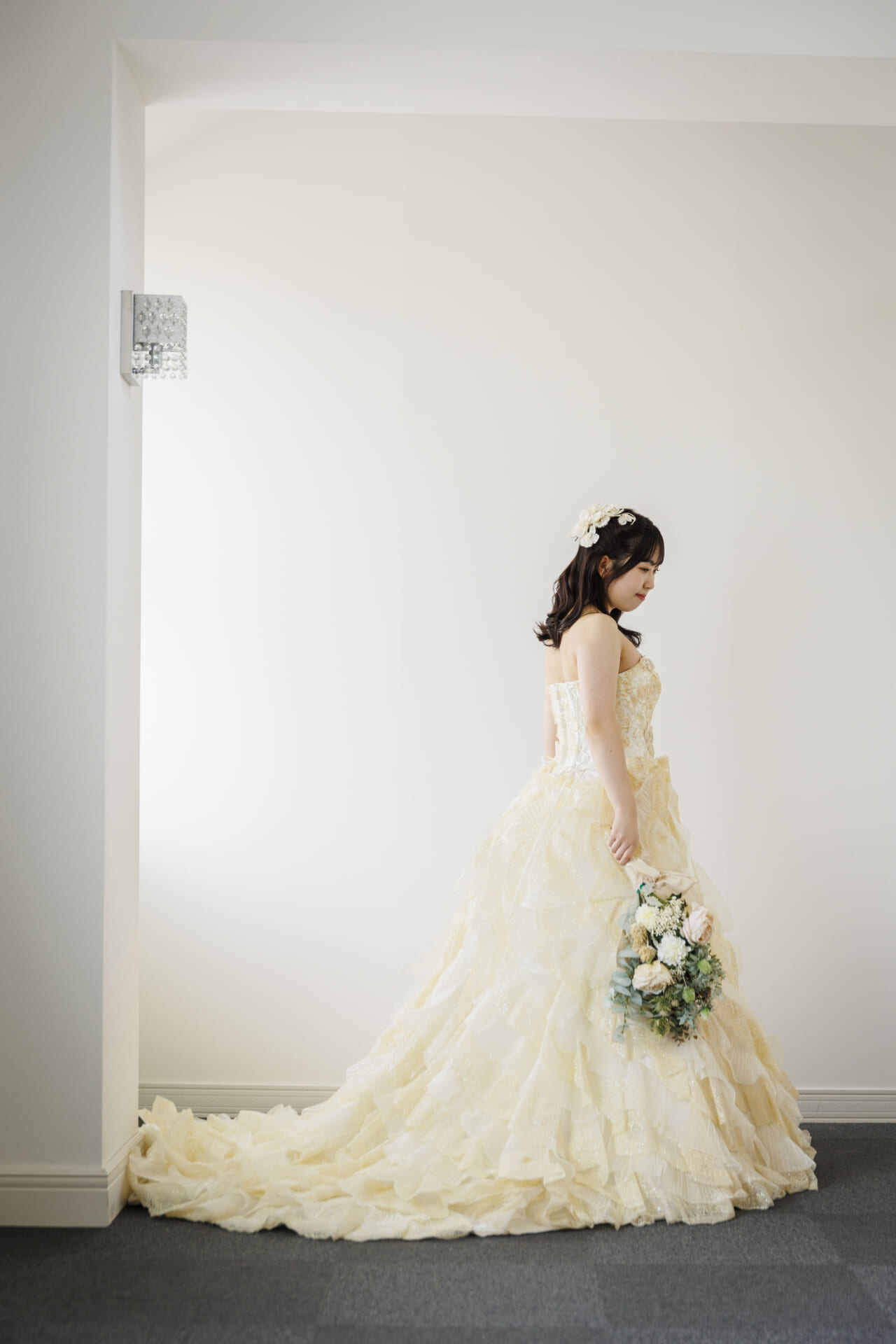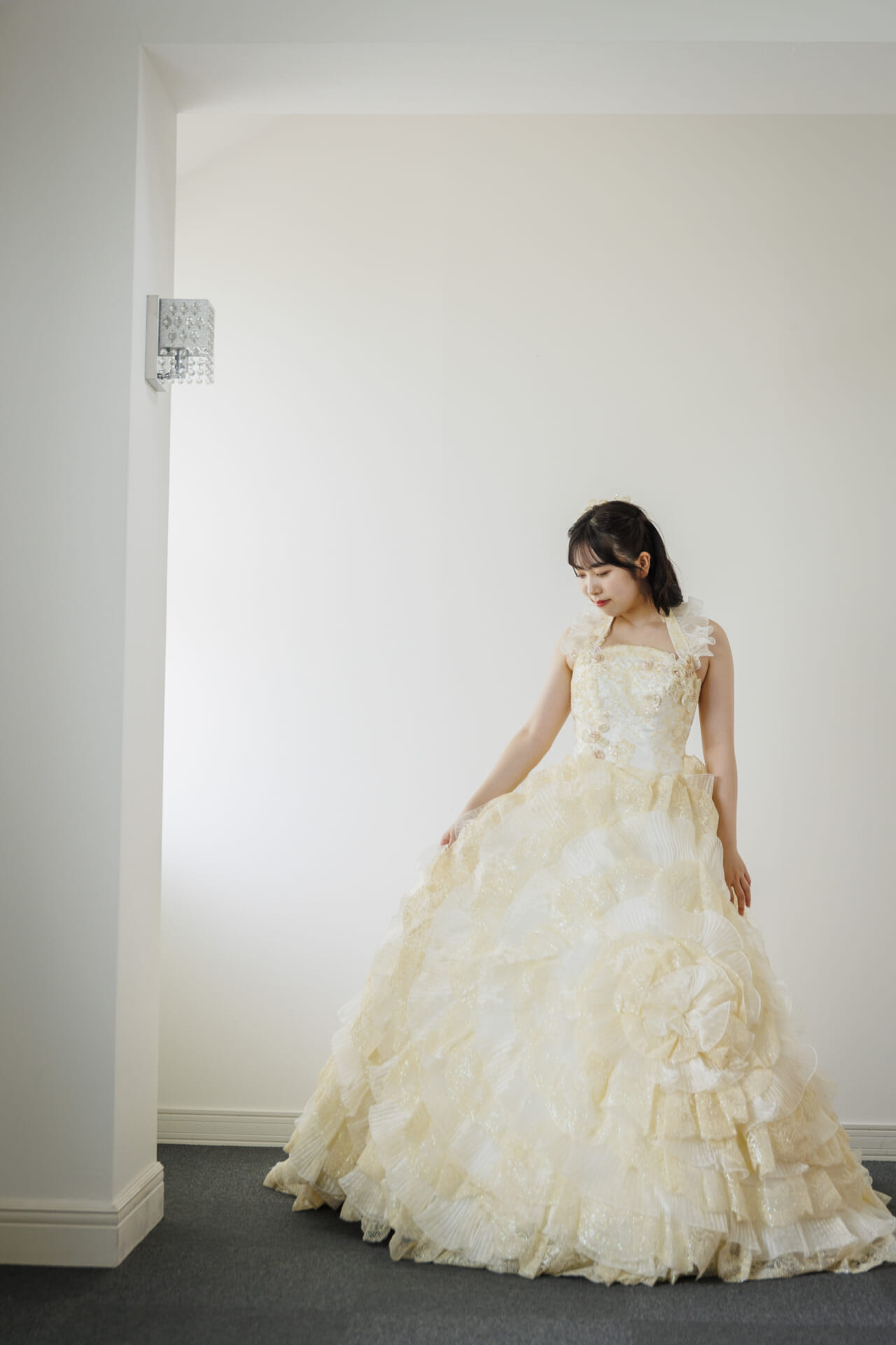 淡いアイボリーカラーに包まれた、やさしさと華やかさを兼ね備えたクラシカルなドレス。上身頃には繊細なレースと立体的なフラワーモチーフがあしらわれ、まるで花束をまとったかのような愛らしさを演出します。ふんわりと広がるスカートには、チュールとレースを重ねた贅沢なフリルが施され、動くたびに空気を含んで軽やかに揺れる姿が印象的。全体にあしらわれたソフトなベージュトーンの花々が、肌になじみやすく、上品な華やかさを引き立てます。胸元はすっきりとしたビスチェスタイルで、デコルテを美しく見せつつ、取り外し可能なボレロ風ショルダーを合わせれば、よりクラシカルな雰囲気に。2WAYで着こなしを楽しめるのも嬉しいポイントです。バックスタイルもたっぷりとしたフリルとトレーンがドラマティックな印象を与え、後ろ姿まで美しく演出。背中は編み上げ仕様で、フィット感が調整しやすく、美しいシルエットを保ちやすい設計です。