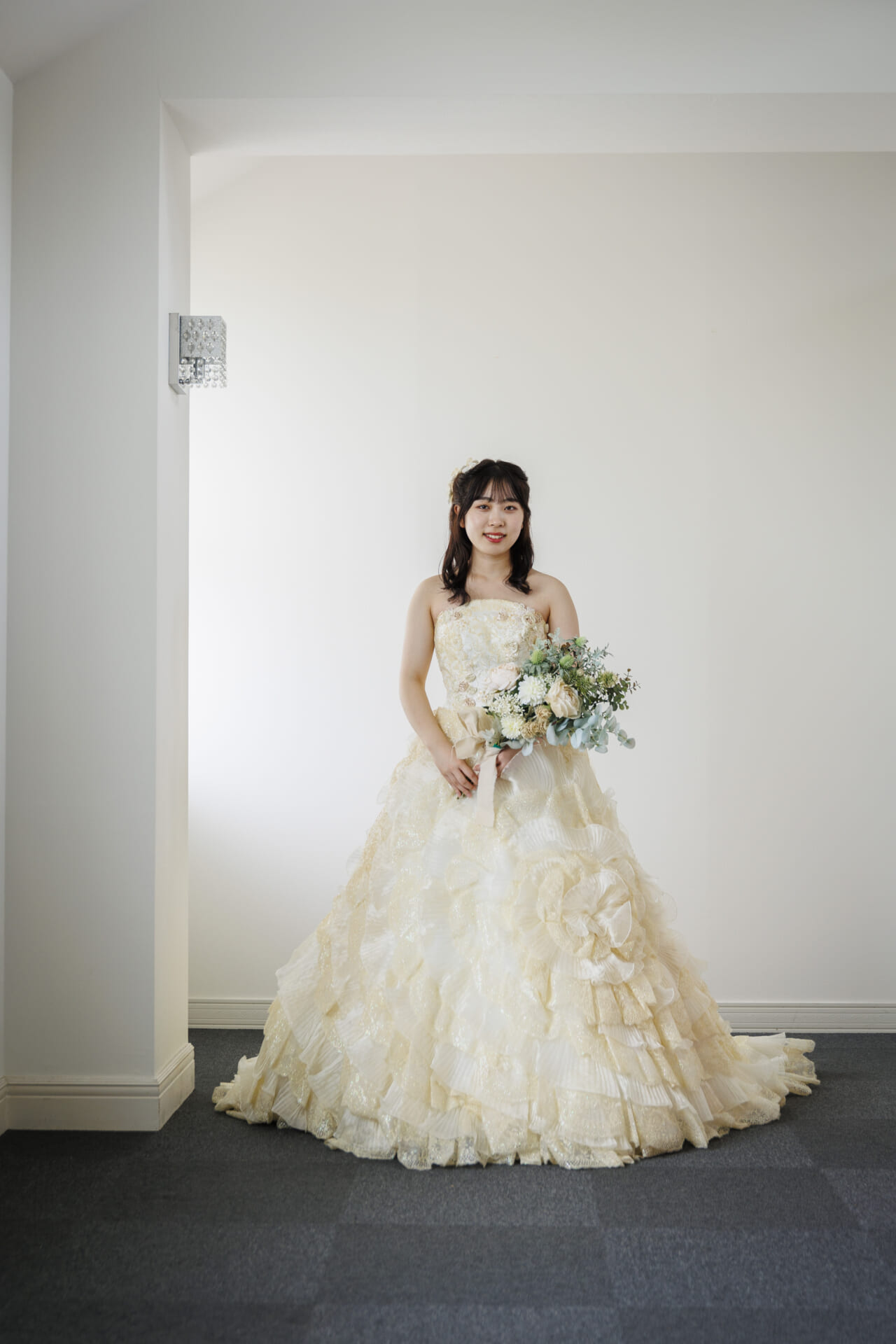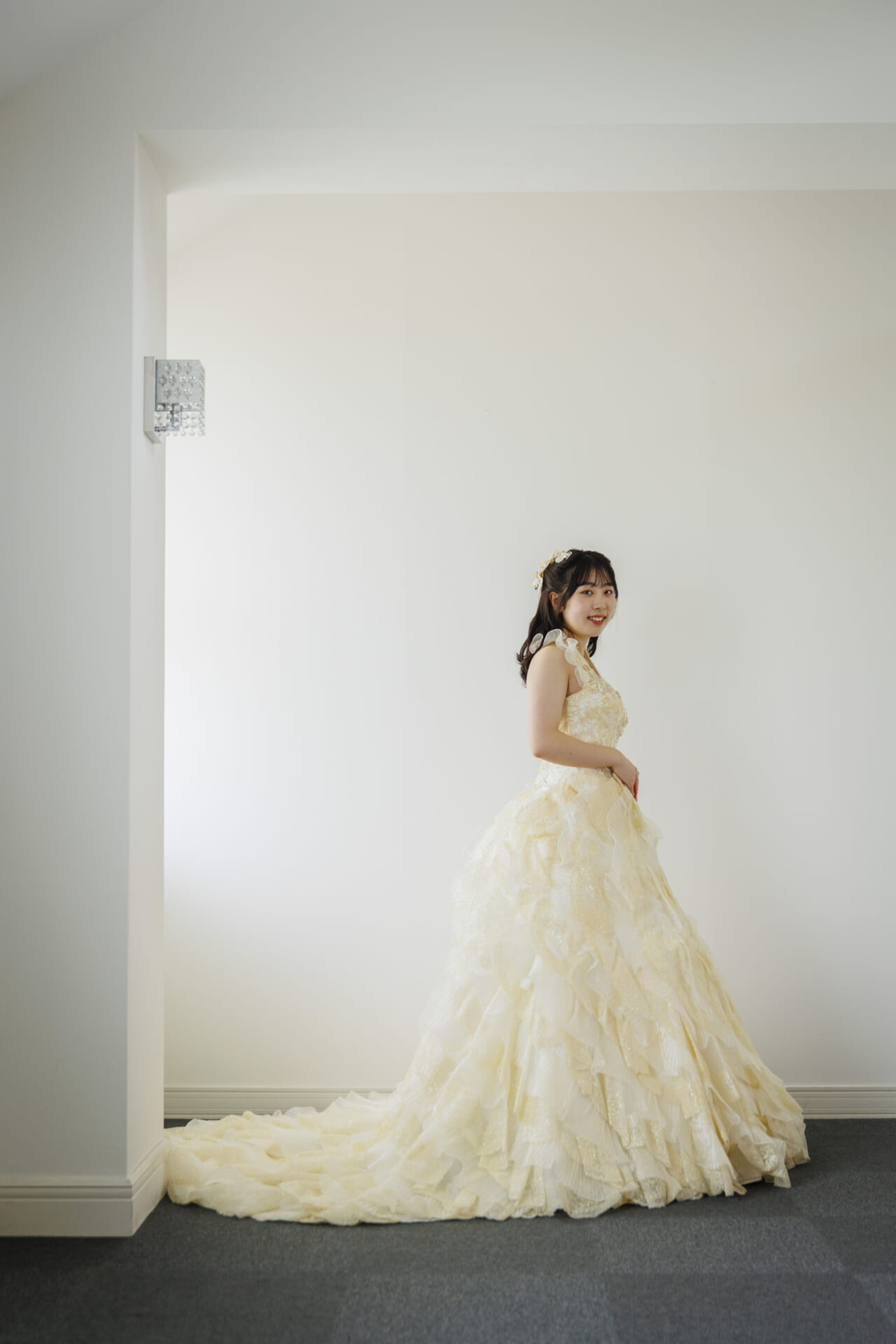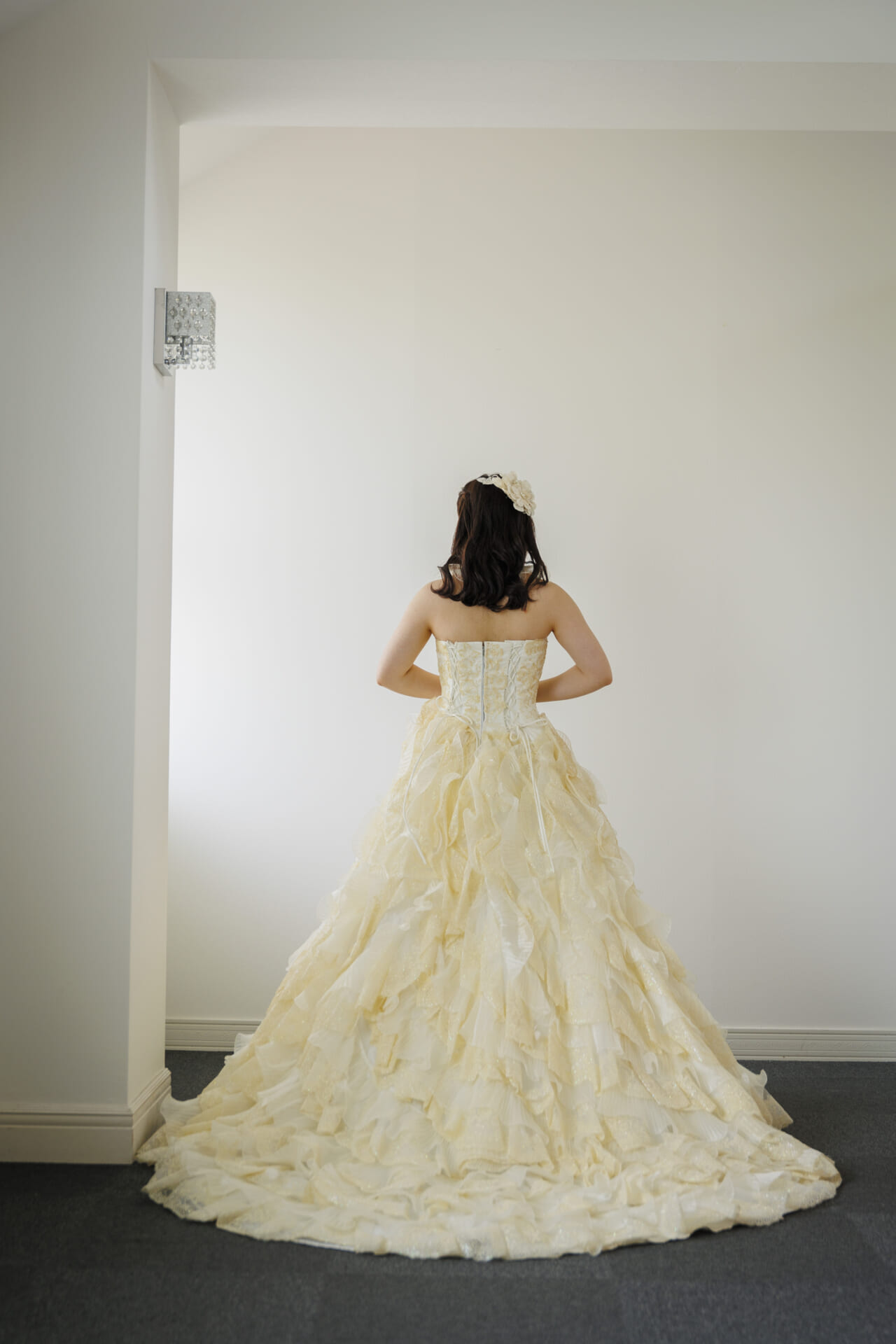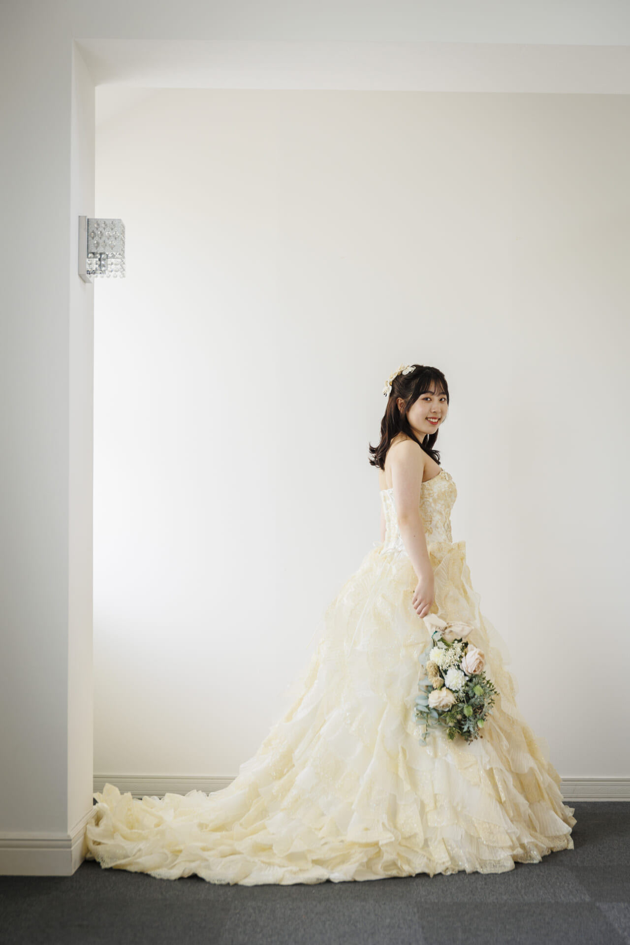 淡いアイボリーカラーに包まれた、やさしさと華やかさを兼ね備えたクラシカルなドレス。上身頃には繊細なレースと立体的なフラワーモチーフがあしらわれ、まるで花束をまとったかのような愛らしさを演出します。ふんわりと広がるスカートには、チュールとレースを重ねた贅沢なフリルが施され、動くたびに空気を含んで軽やかに揺れる姿が印象的。全体にあしらわれたソフトなベージュトーンの花々が、肌になじみやすく、上品な華やかさを引き立てます。胸元はすっきりとしたビスチェスタイルで、デコルテを美しく見せつつ、取り外し可能なボレロ風ショルダーを合わせれば、よりクラシカルな雰囲気に。2WAYで着こなしを楽しめるのも嬉しいポイントです。バックスタイルもたっぷりとしたフリルとトレーンがドラマティックな印象を与え、後ろ姿まで美しく演出。背中は編み上げ仕様で、フィット感が調整しやすく、美しいシルエットを保ちやすい設計です。