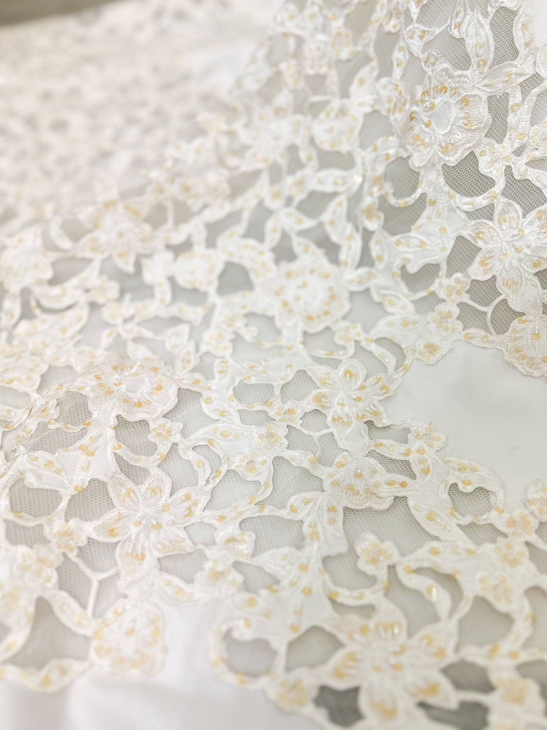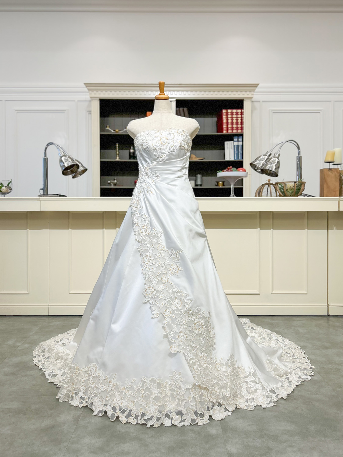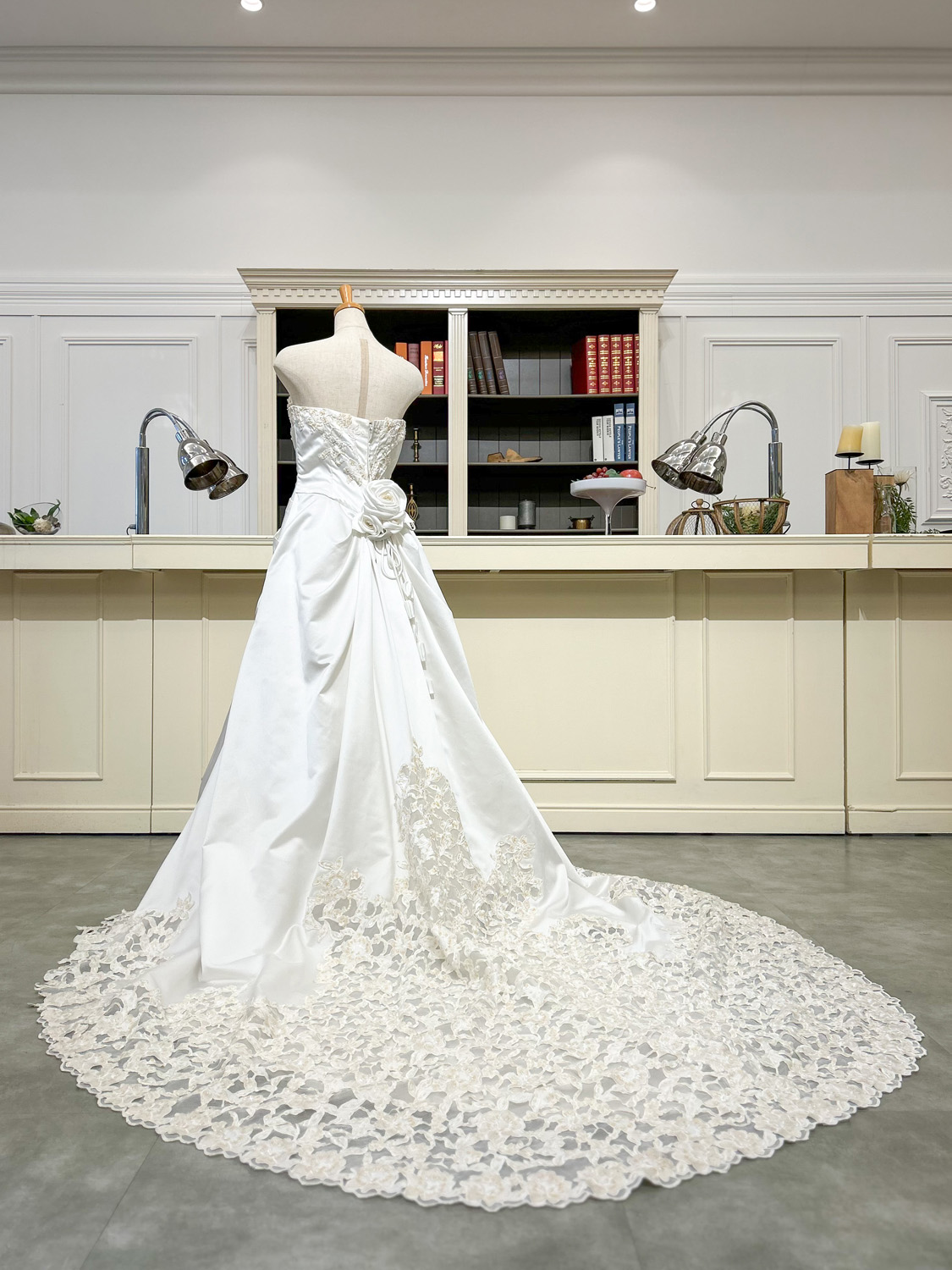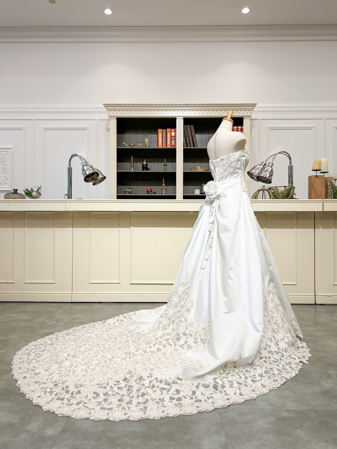 存在感あふれるカットレースが美しく映える、格式あるチャペルにもふさわしい1着。光沢を抑えたサテン地に贅沢なレースを重ねることで、気品と可憐さを同時に演出しています。ウエストから斜めに流れるラップ風デザインが腰の位置を高く見せ、スタイルアップ効果も抜群。バストラインを包み込む繊細なレースが胸元に立体感を与え、顔まわりを明るく見せてくれます。後ろ姿を彩るロングトレーンにはレースがふんだんにあしらわれ、歩くたびに華やかに揺れる様は、バージンロードでの視線を集めること間違いなし。ヒップから広がるやわらかなフレアは、気になるラインを優しくカバーしつつも、女性らしいシルエットを際立たせてくれます。背中はすっきりとしたファスナー仕様で、着脱もスムーズ。細部に至るまで丁寧に仕立てられた上質な一着は、格式あるホテル挙式やチャペル式、前撮りにもぴったりです。