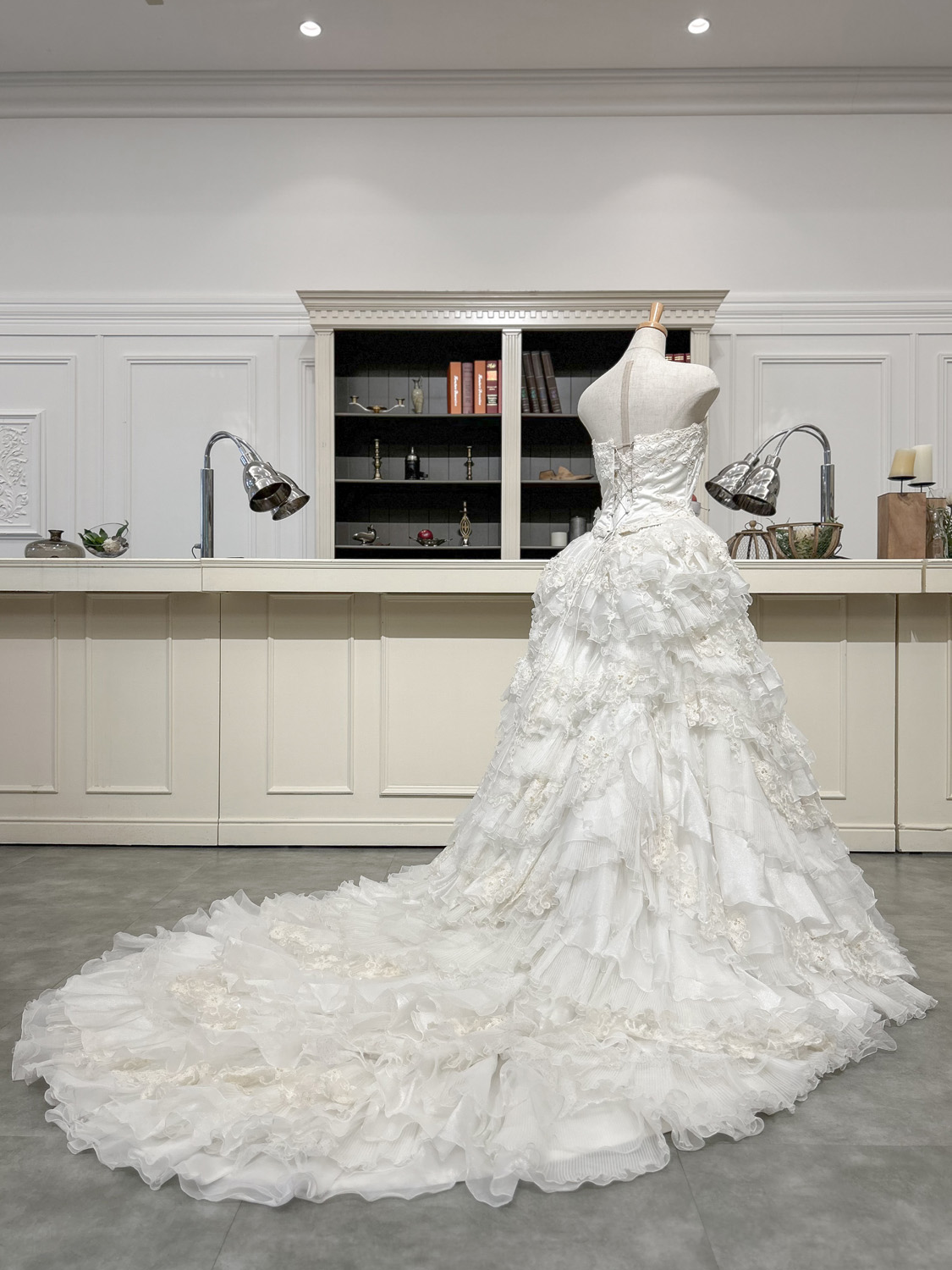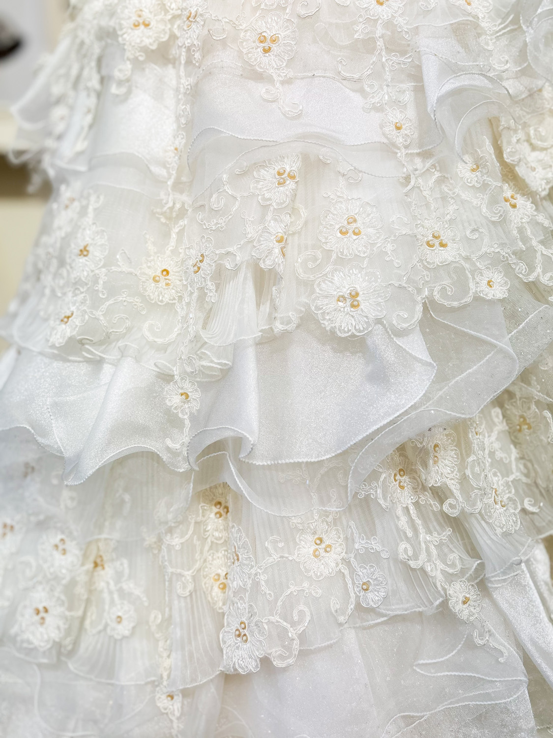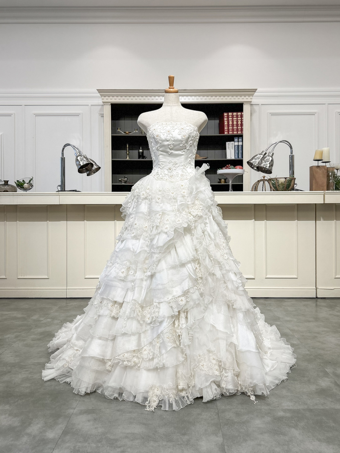 小花刺繍と繊細なレースをふんだんに使用し、幾重にも重なるフリルが華やかに広がるロマンティックな1着。スカートにはさまざまなレースとチュールが組み合わされており、角度によって異なる表情を見せてくれます。全体にあしらわれた花柄モチーフは、甘すぎないナチュラルな可憐さを演出し、柔らかい印象の中にも品のある華やかさをプラス。胸元はストレートビスチェのすっきりとしたデザインで、デコルテを美しく引き立てつつ、ボリュームのあるスカートとのバランスを取ったシルエットに。広がりのあるトレーンは、バージンロードを歩くたびにドラマティックな動きを生み出し、後ろ姿まで視線を惹きつけます。フリルのボリュームはありながらも、軽やかなチュール素材で仕立てられているため、見た目以上に軽快な着心地も魅力。クラシカルな式場からガーデンウェディングまで幅広く映えるデザインです。背中は編み上げ仕様で、体に合わせたフィット感を調整でき、美しいラインをキープできます。
